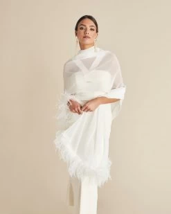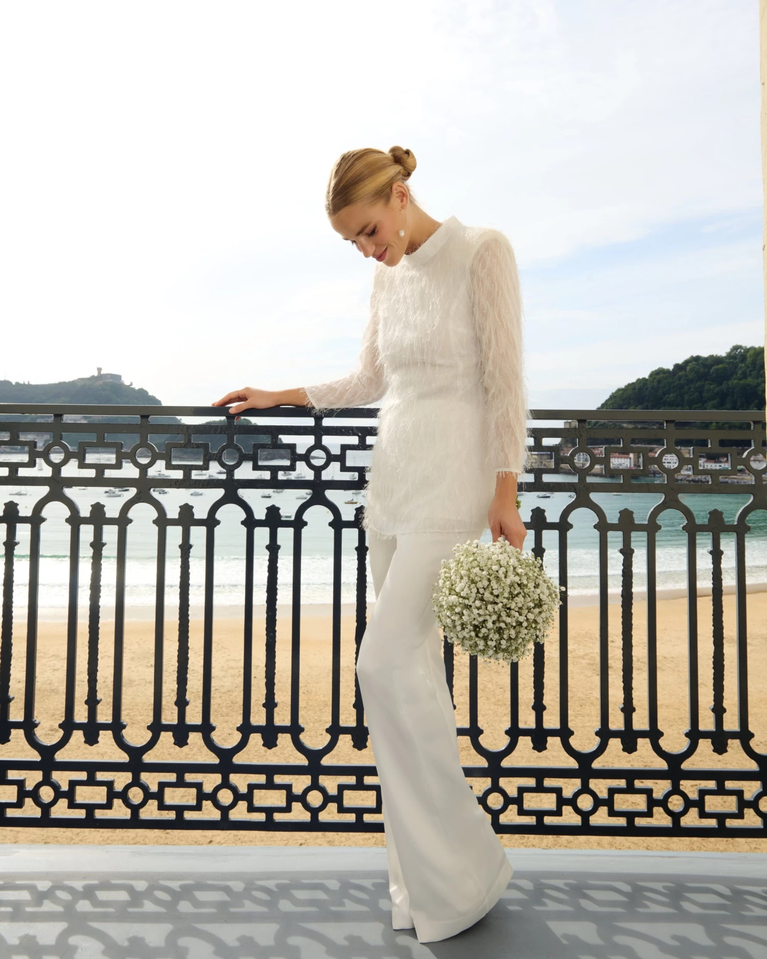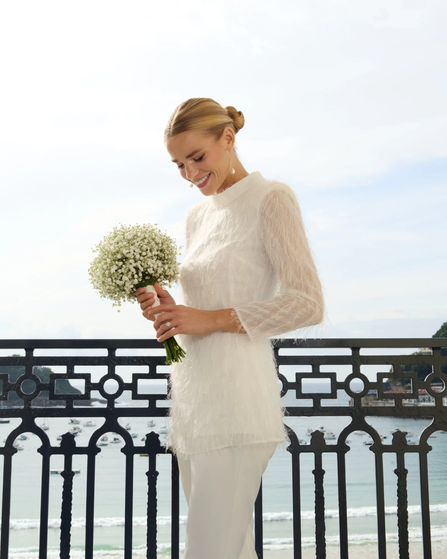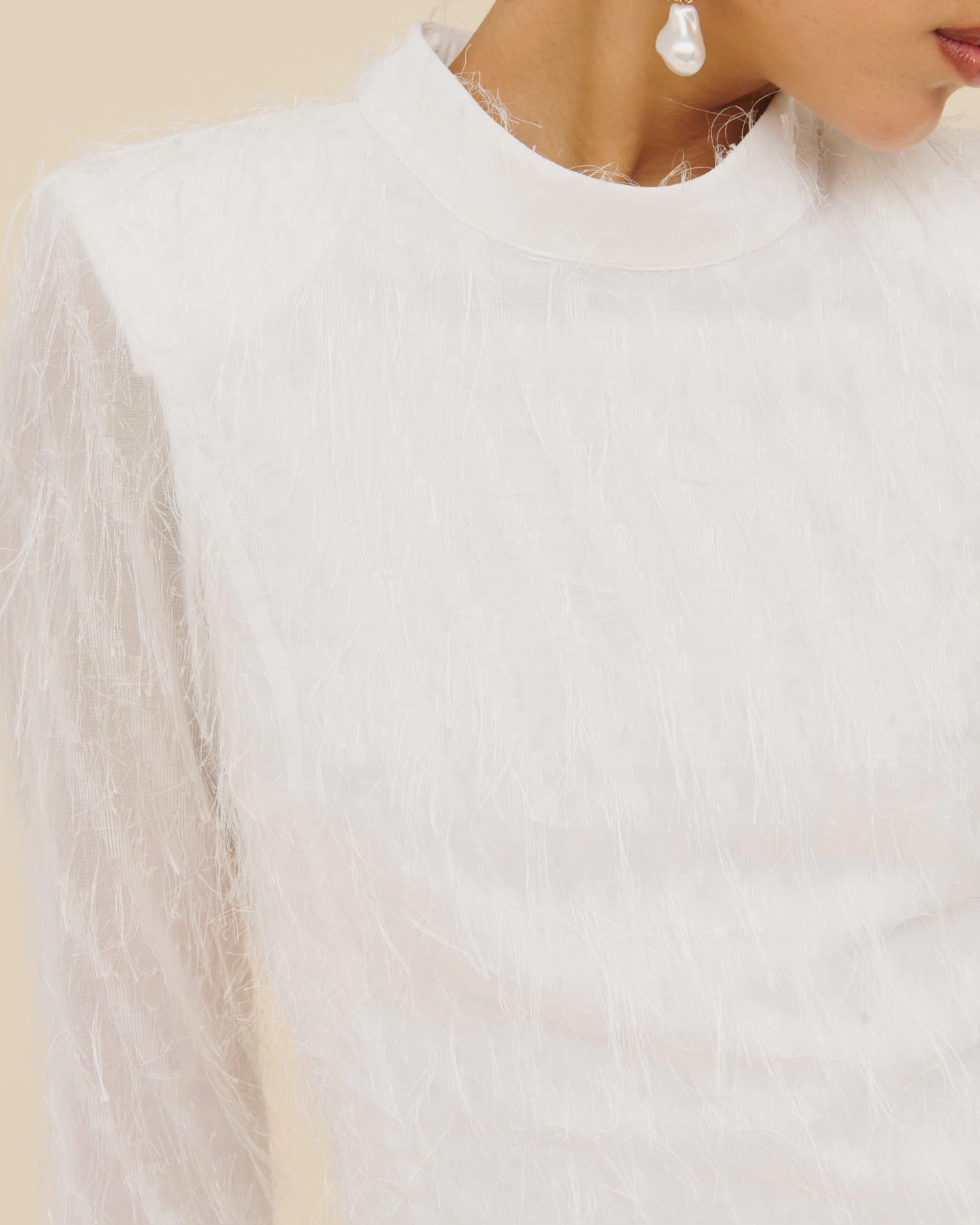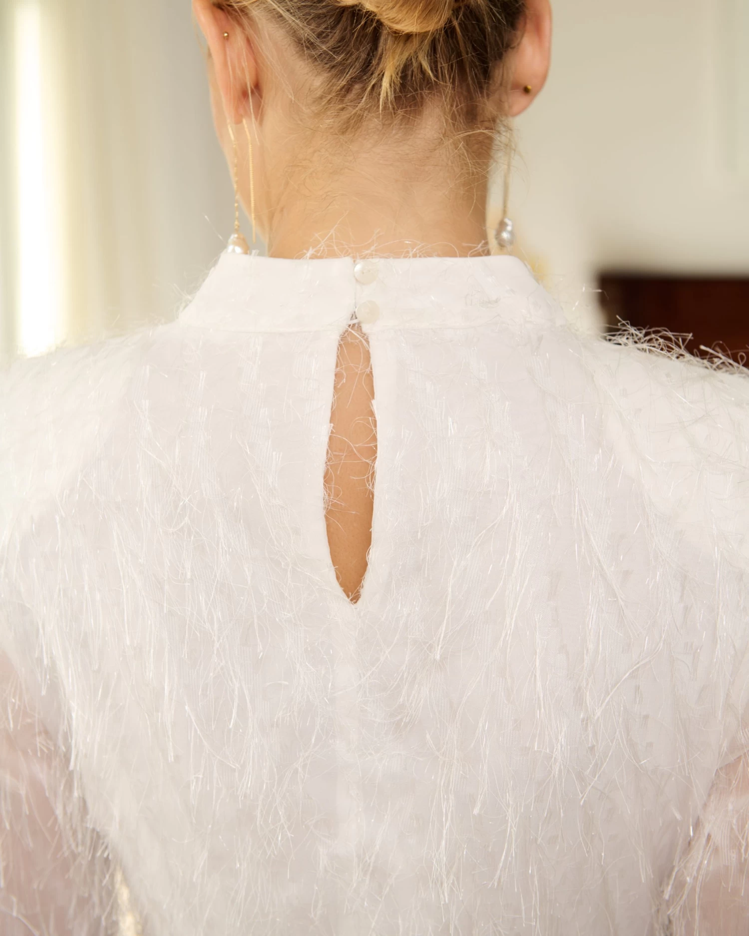 Blusa entallada con cuello ligeramente subido y mangas semitransparentes.