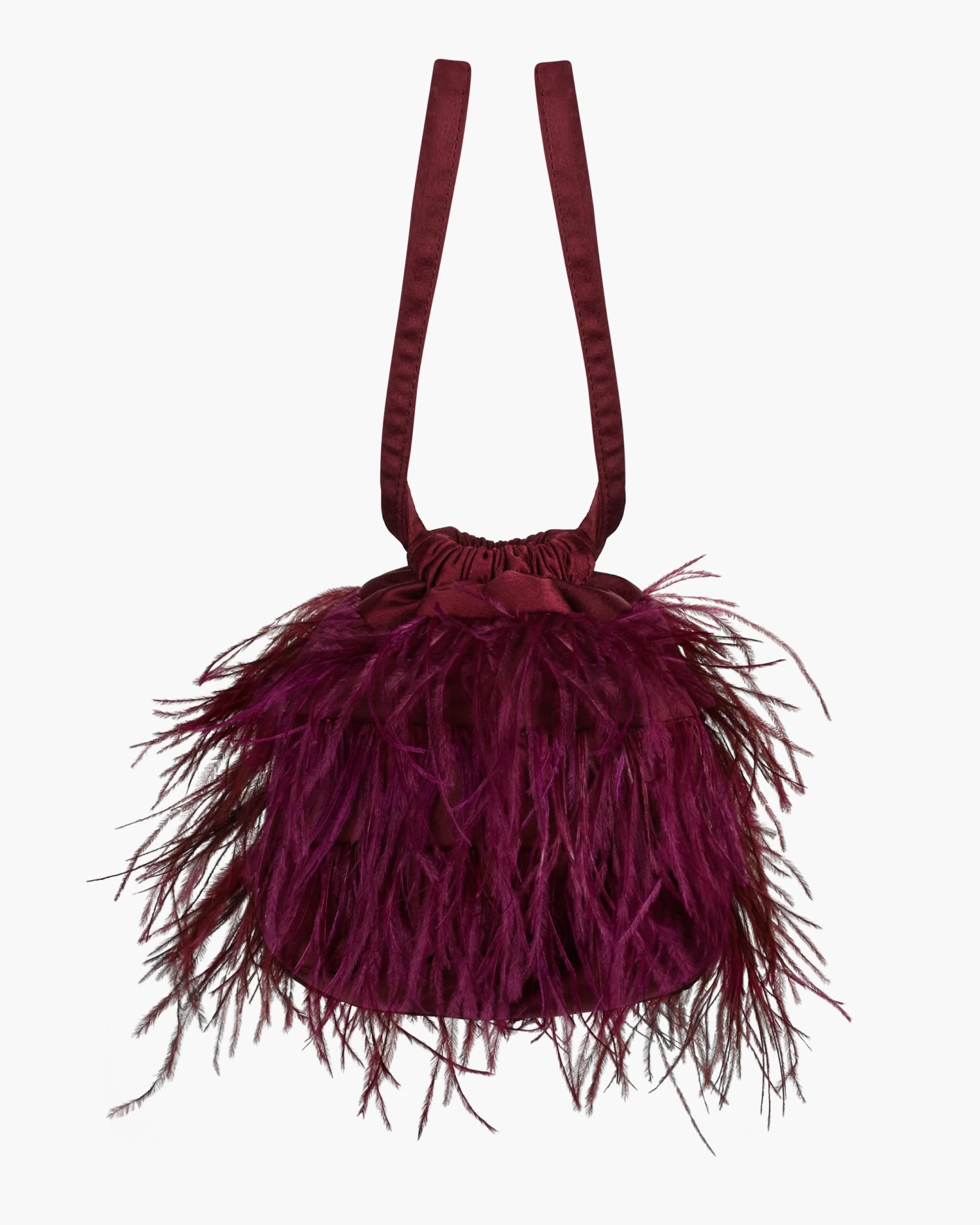 Bolso bombonera con cierre de cordones largos que se convierten en asas y detalle de plumas al tono.