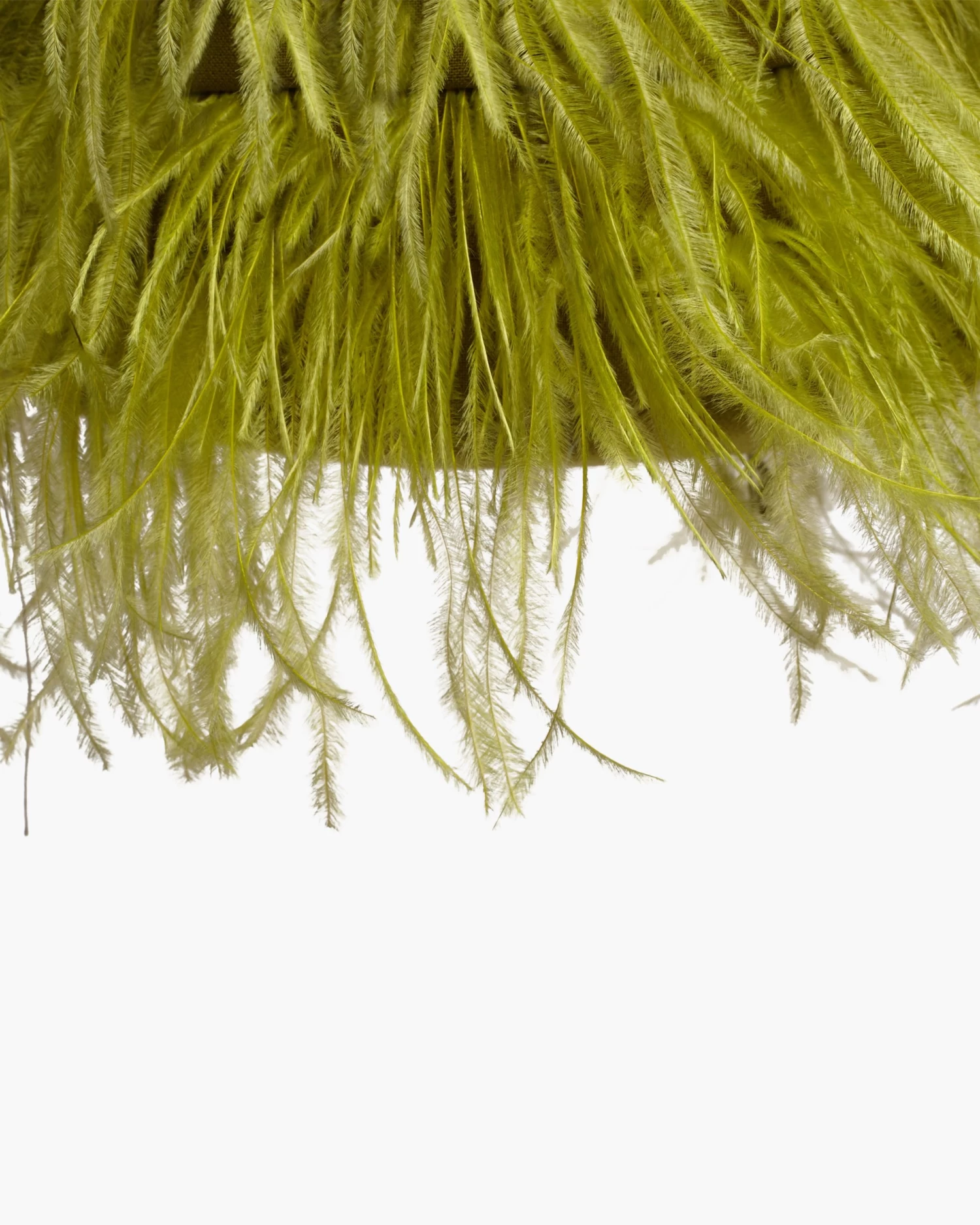 Bolso bombonera con cierre de cordones largos que se convierten en asas y detalle de plumas al tono.