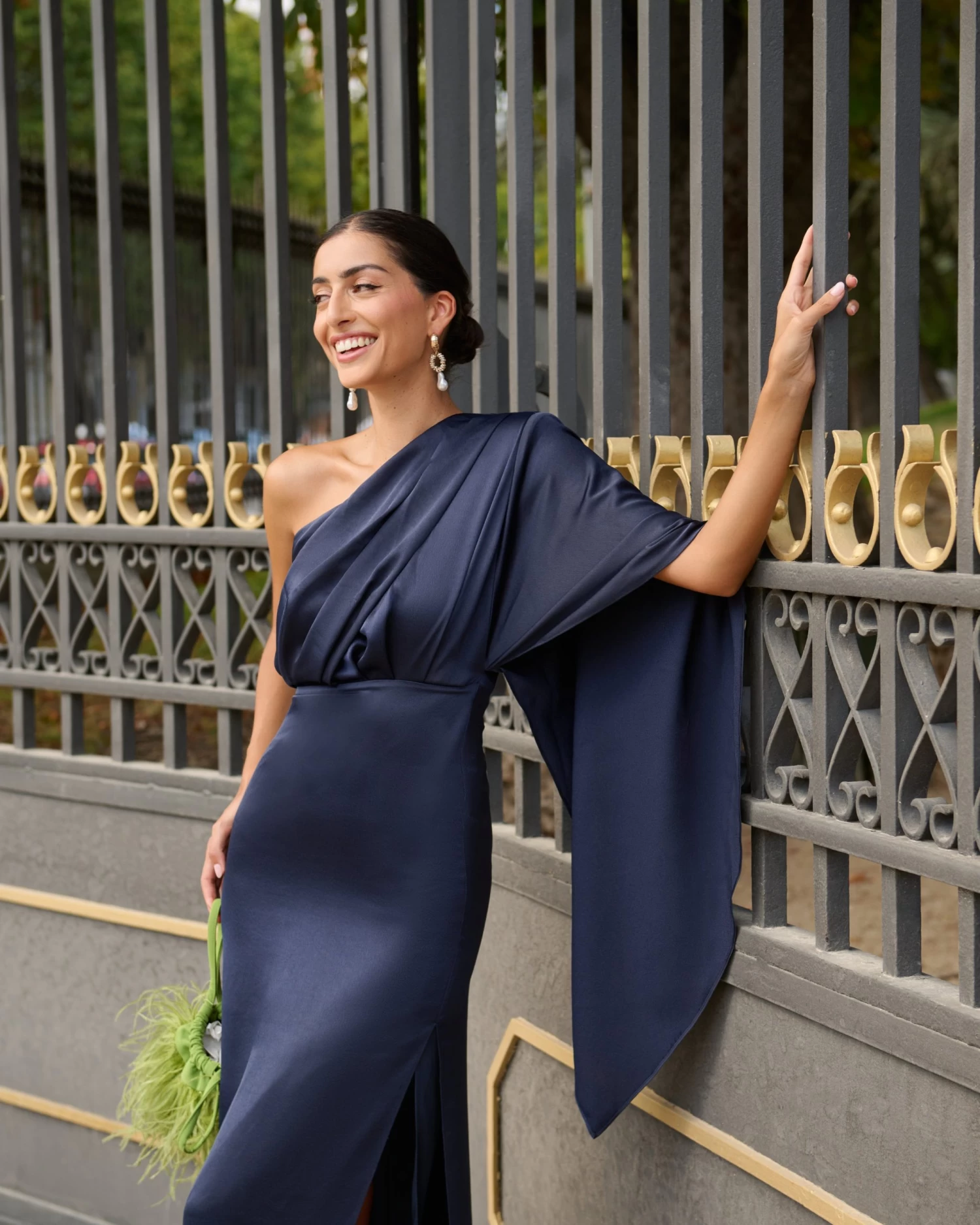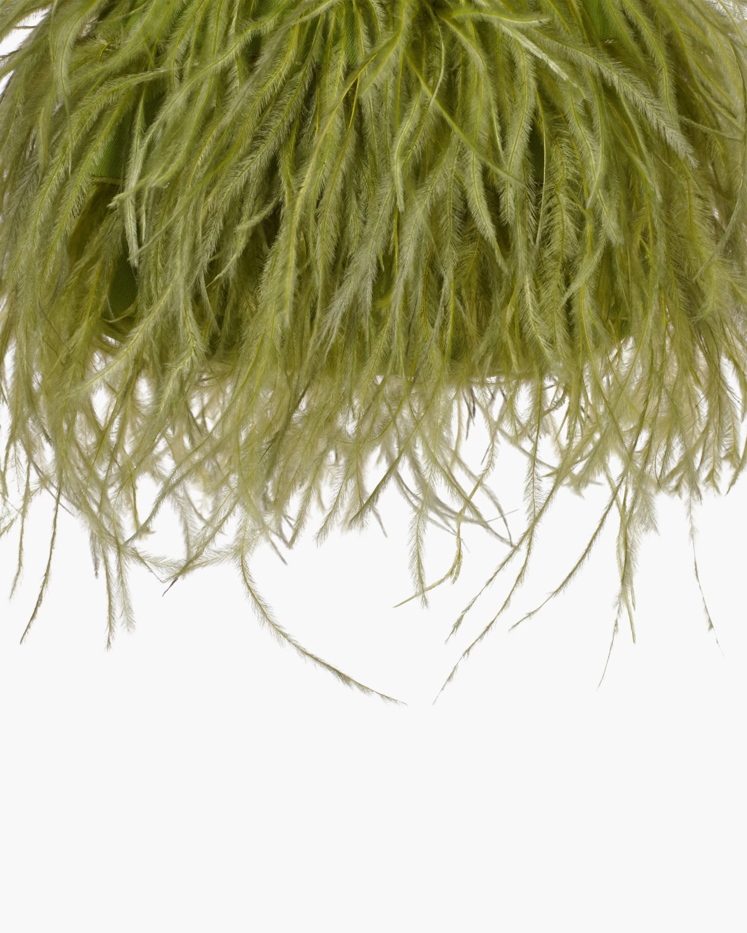 Bolso bombonera pequeño con cierre de cordones largos que se convierten en asas y detalle de plumas al tono.
