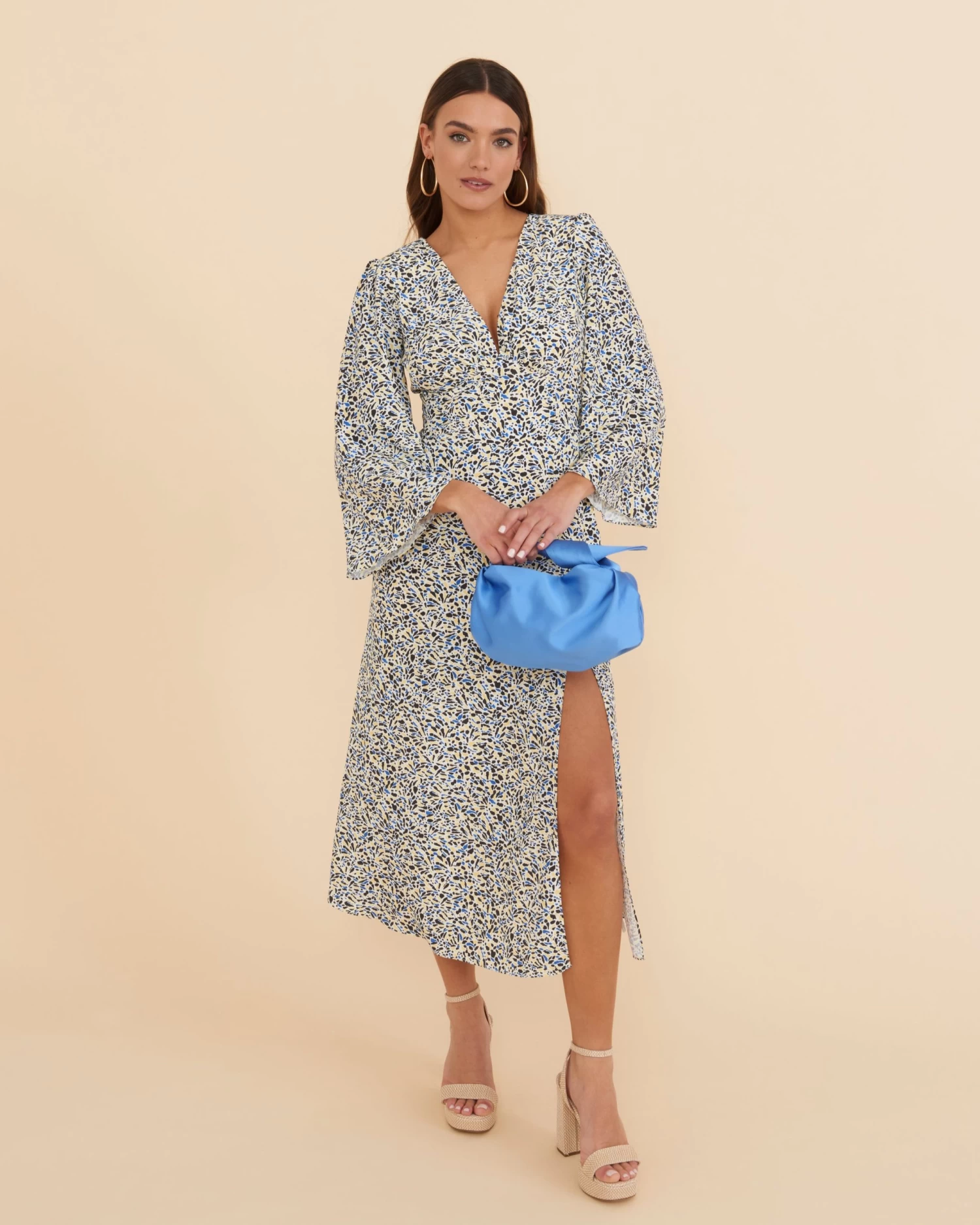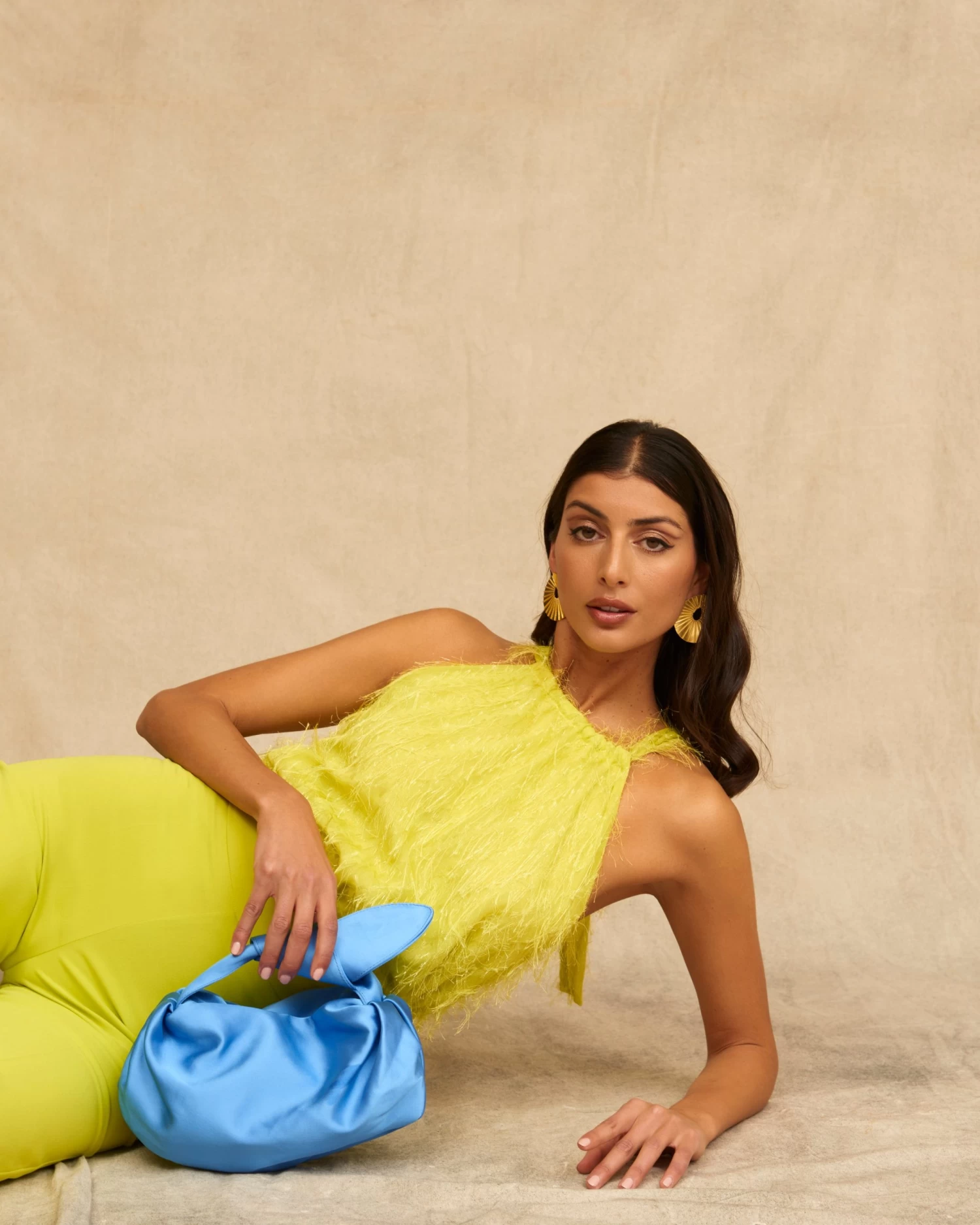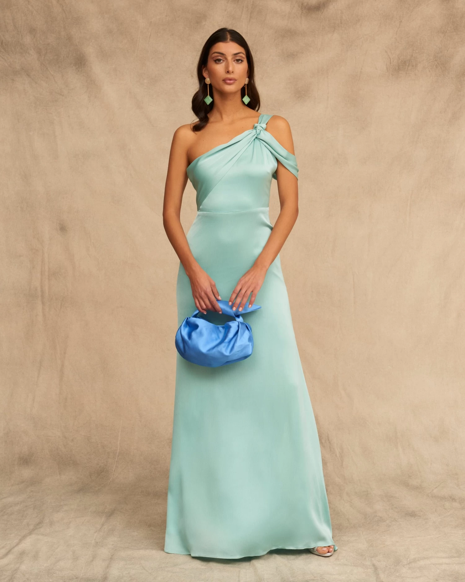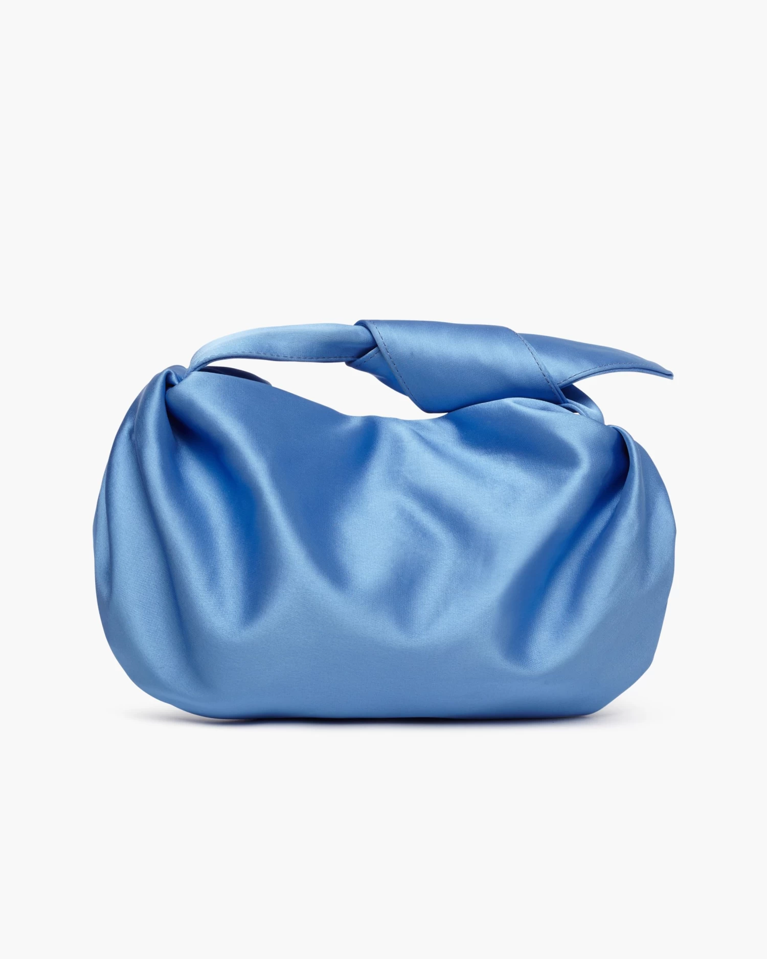 Bolso de mano con detalle de nudo en el asa y cierre mediante botón.