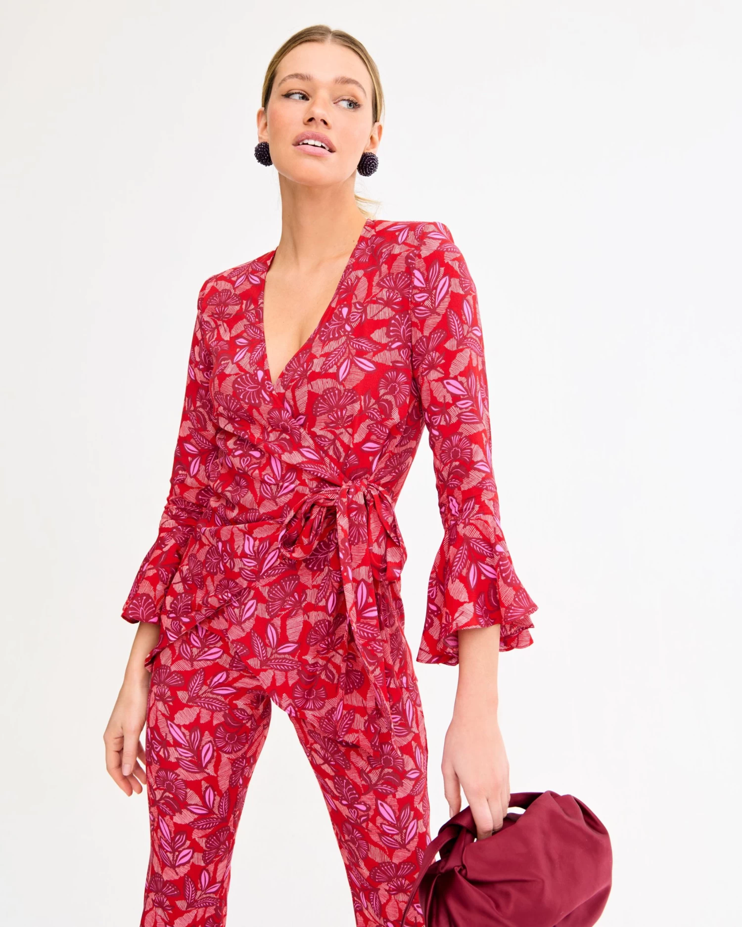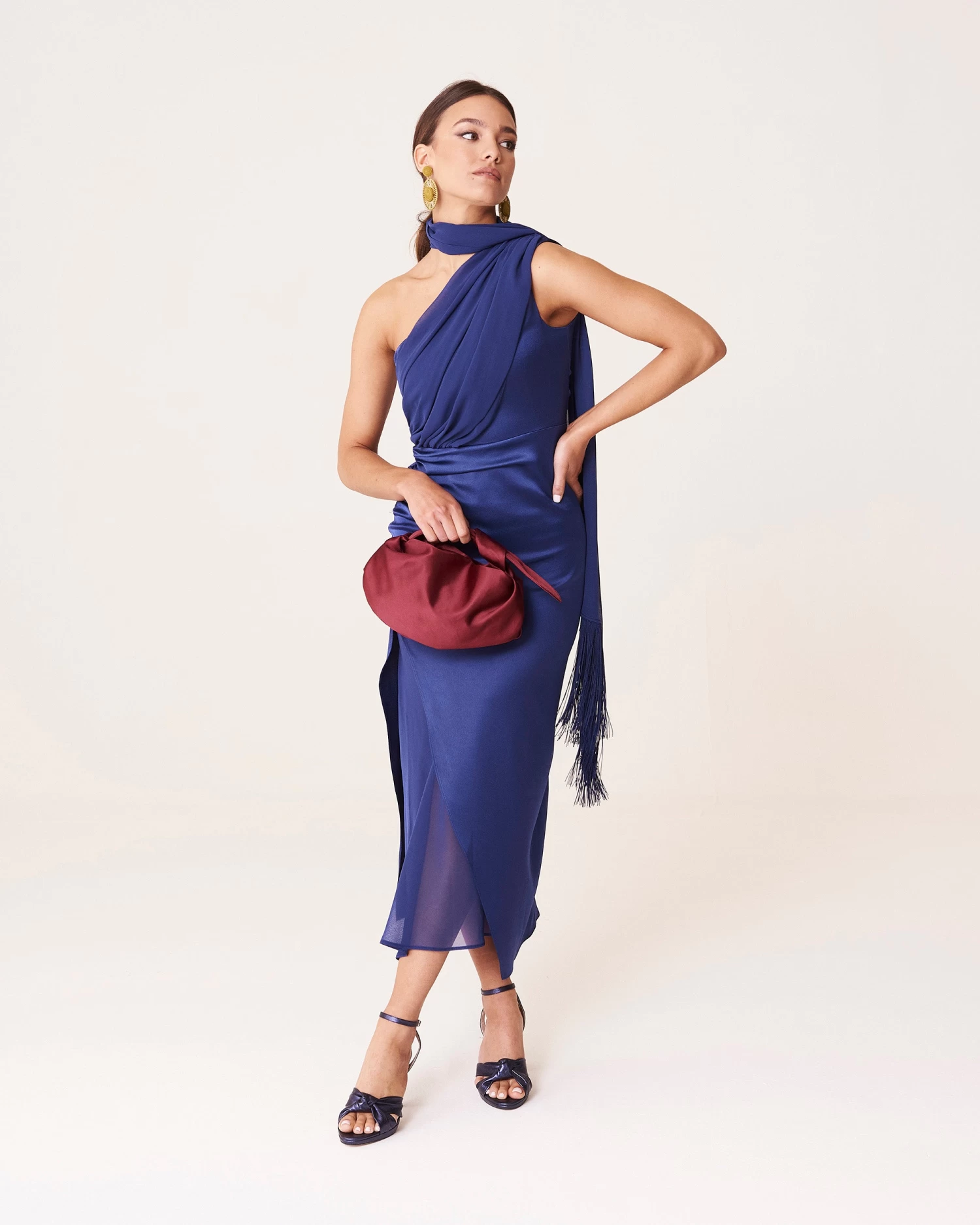 Bolso de mano con detalle de nudo en el asa y cierre mediante botón.