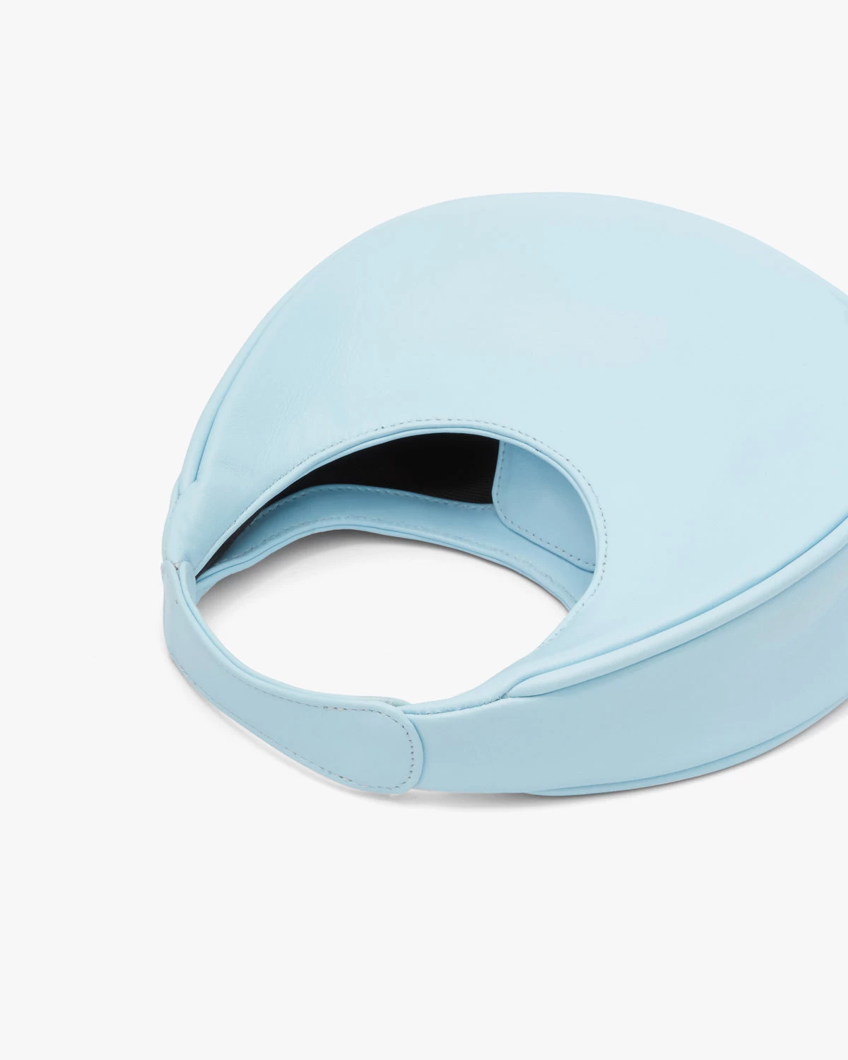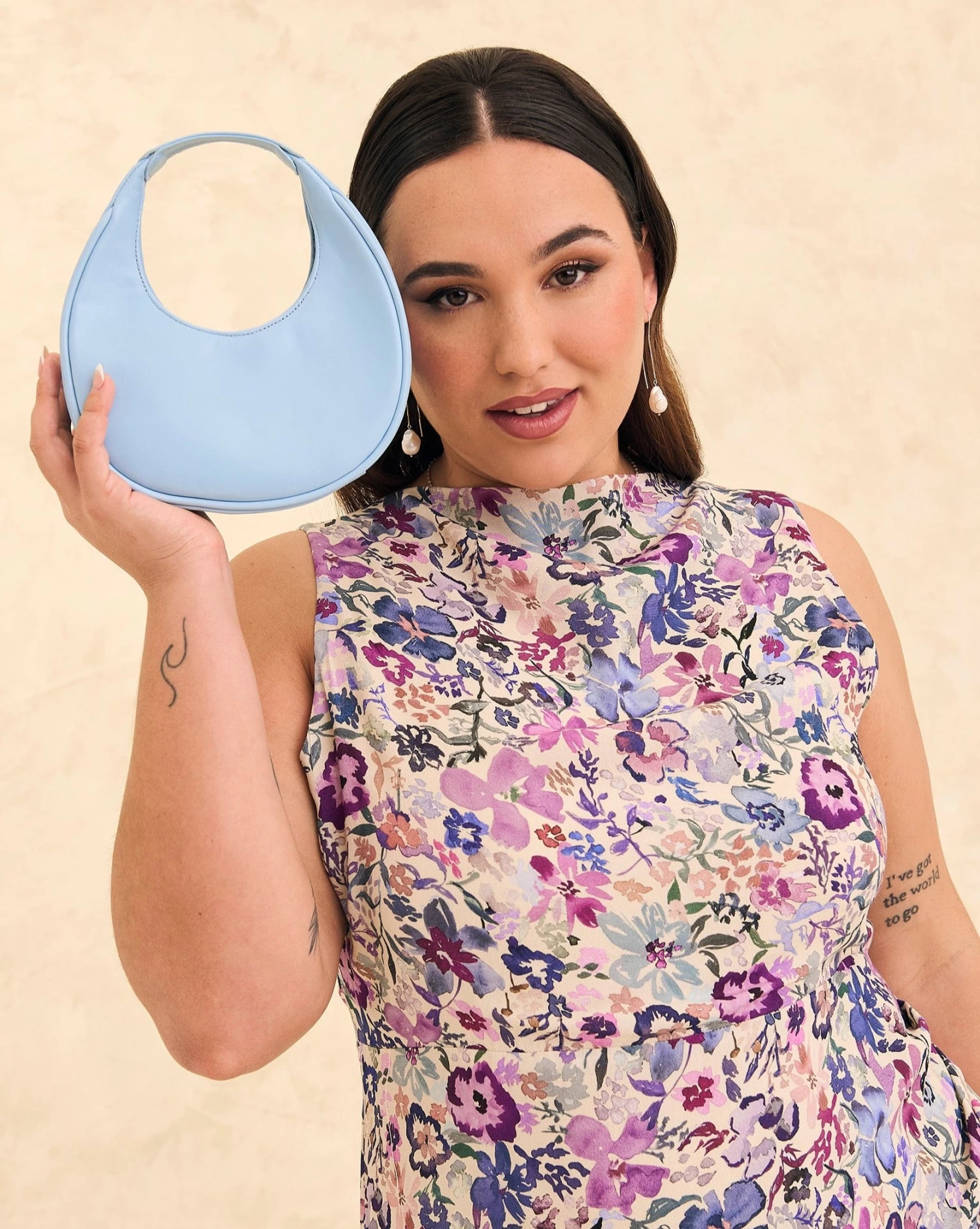 Bolso con forma de luna, asa de mano y cierre magnético.