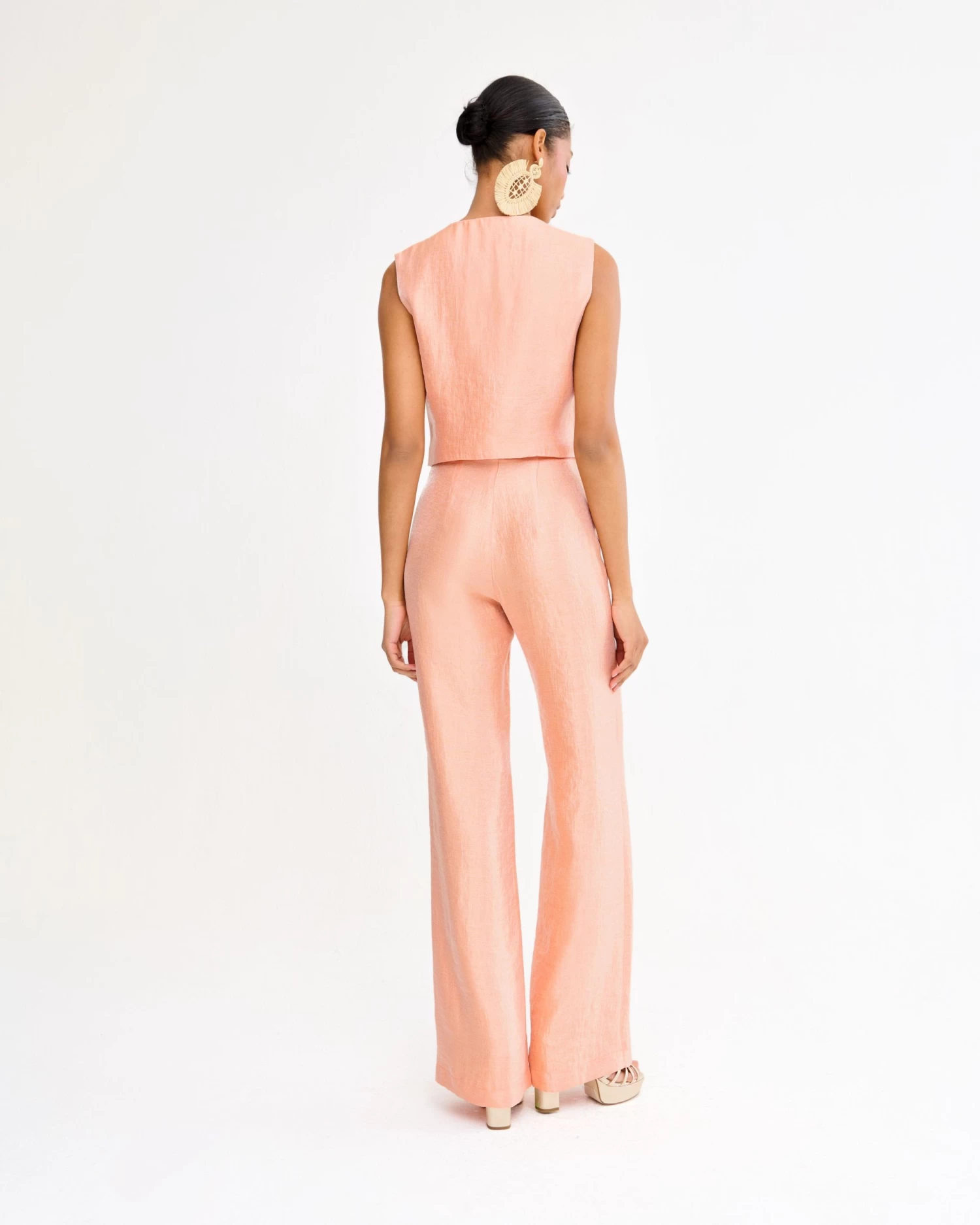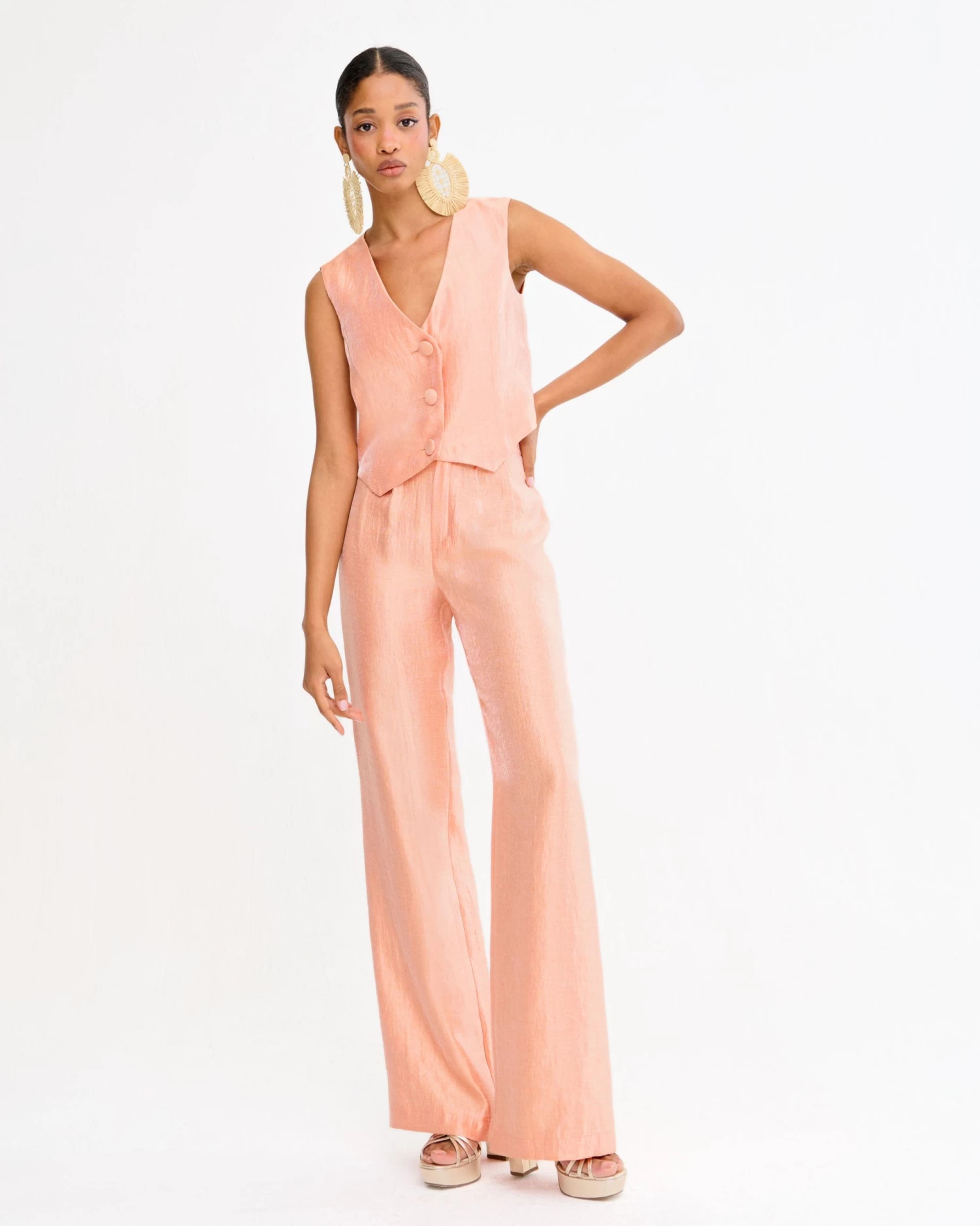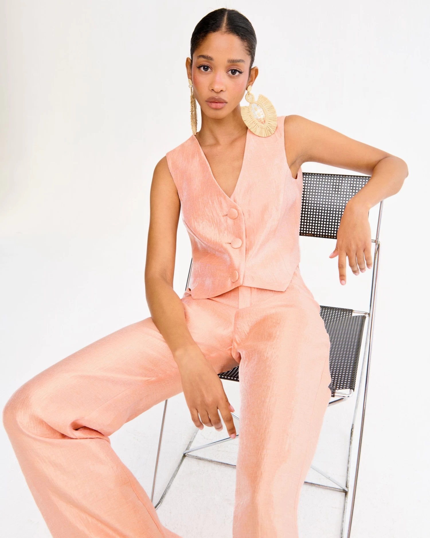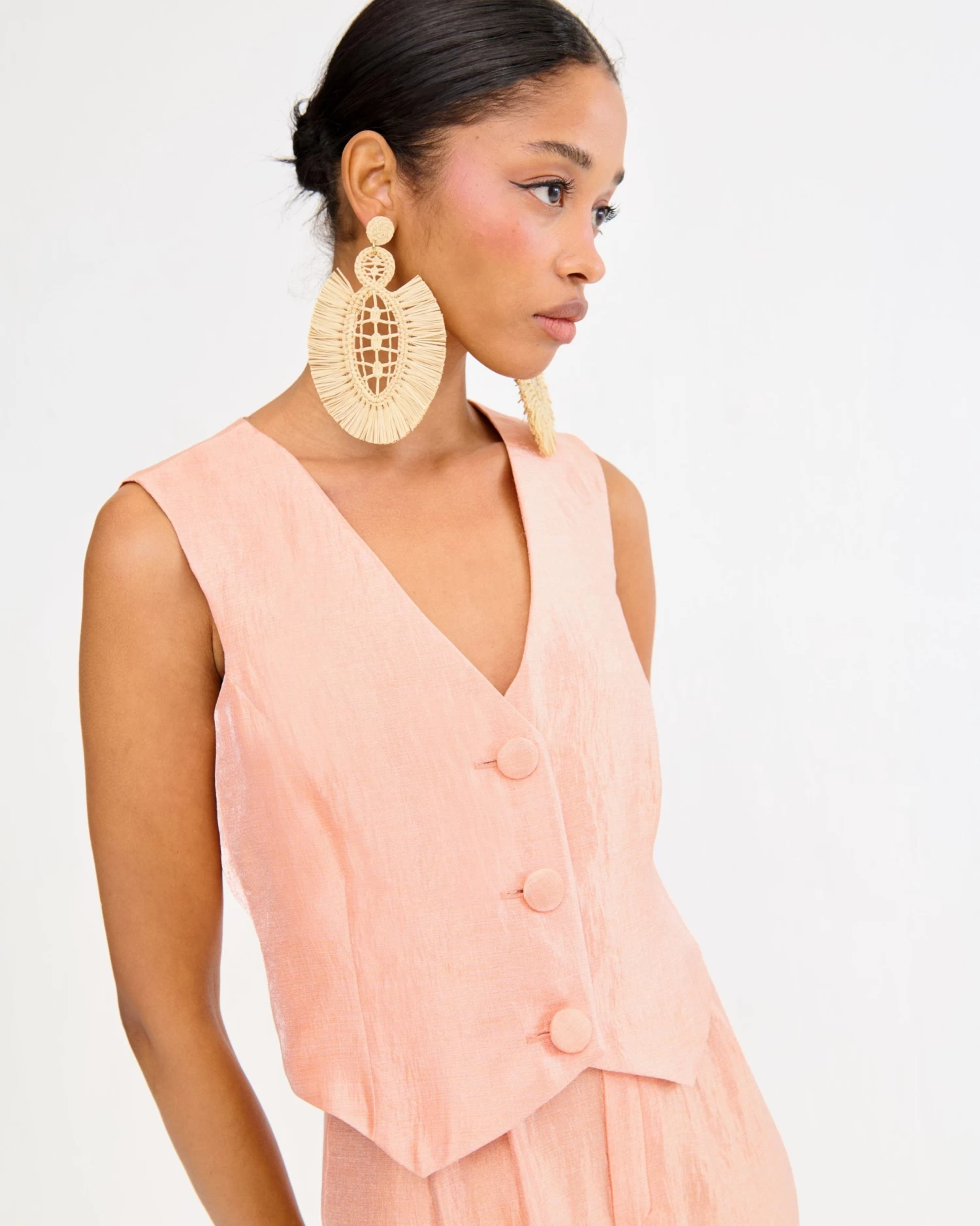 Chaleco con escote en pico y cierre frontal con botones forrados a tono.