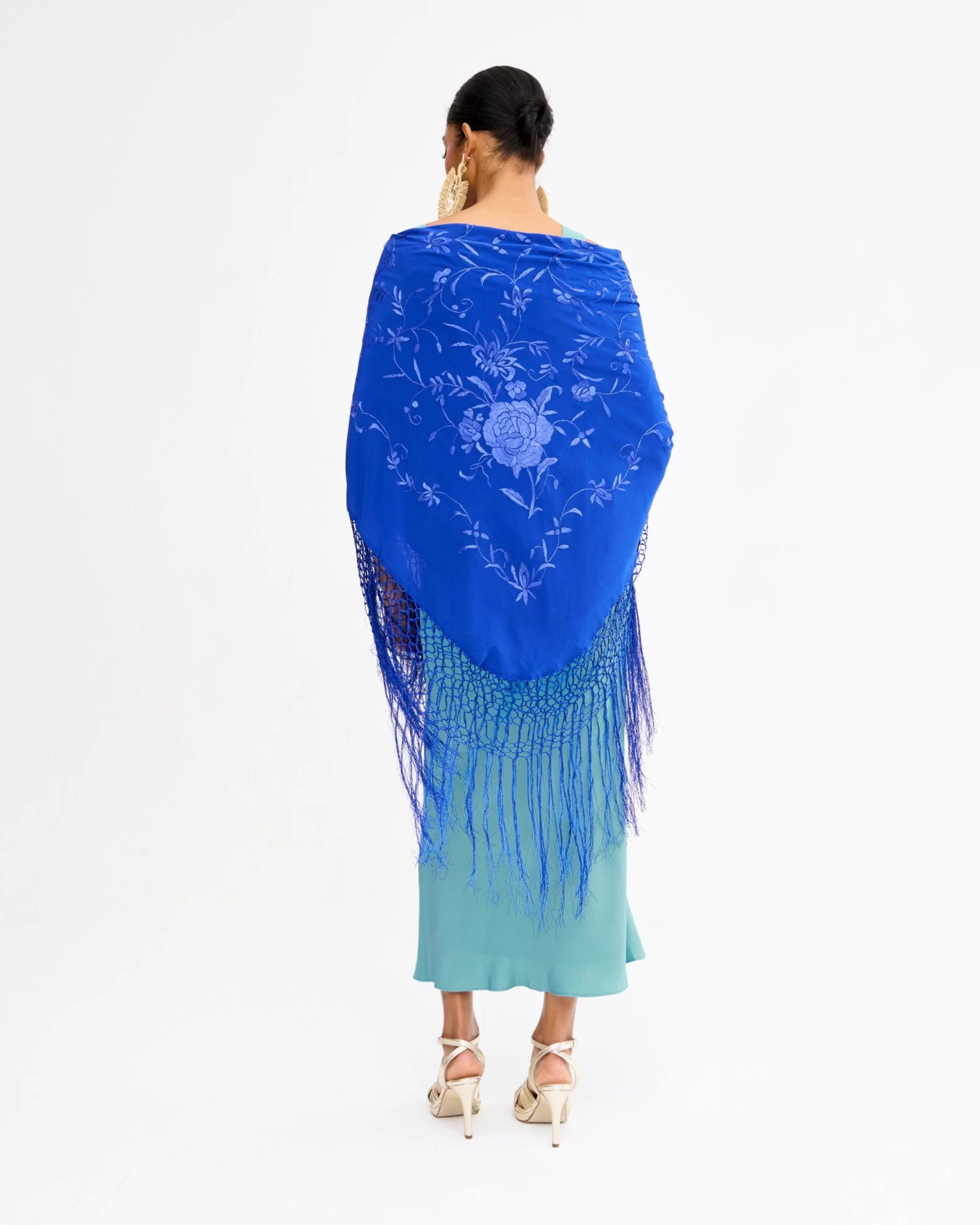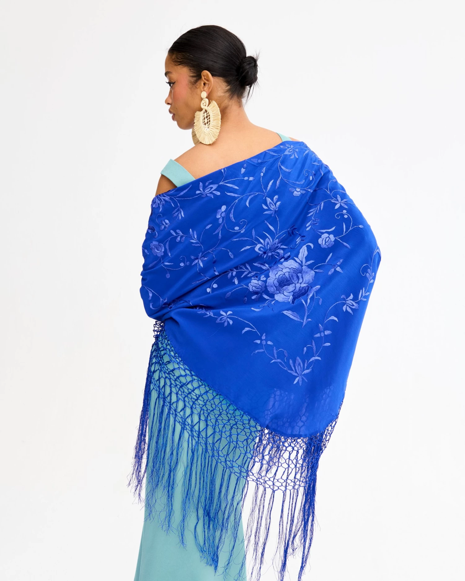 Mantón de manila con fondo color azul y flores a tono bordadas artesanalmente.