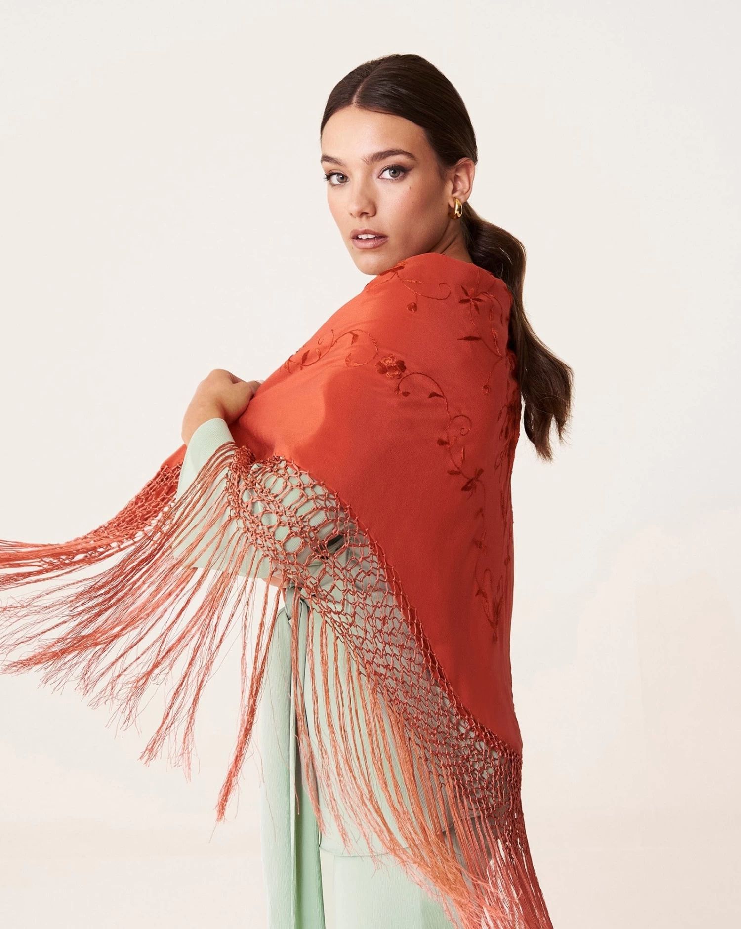 Mantón de manila con fondo color caldera y flores a tono bordadas artesanalmente.