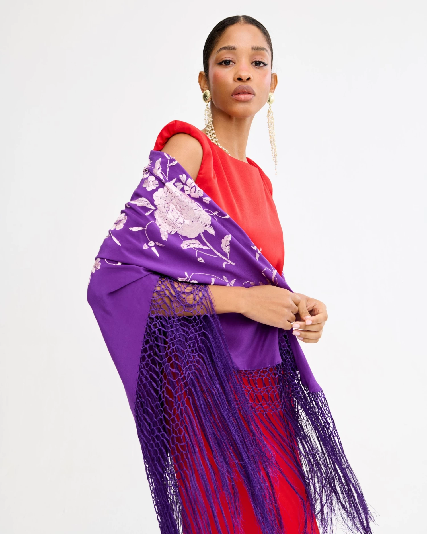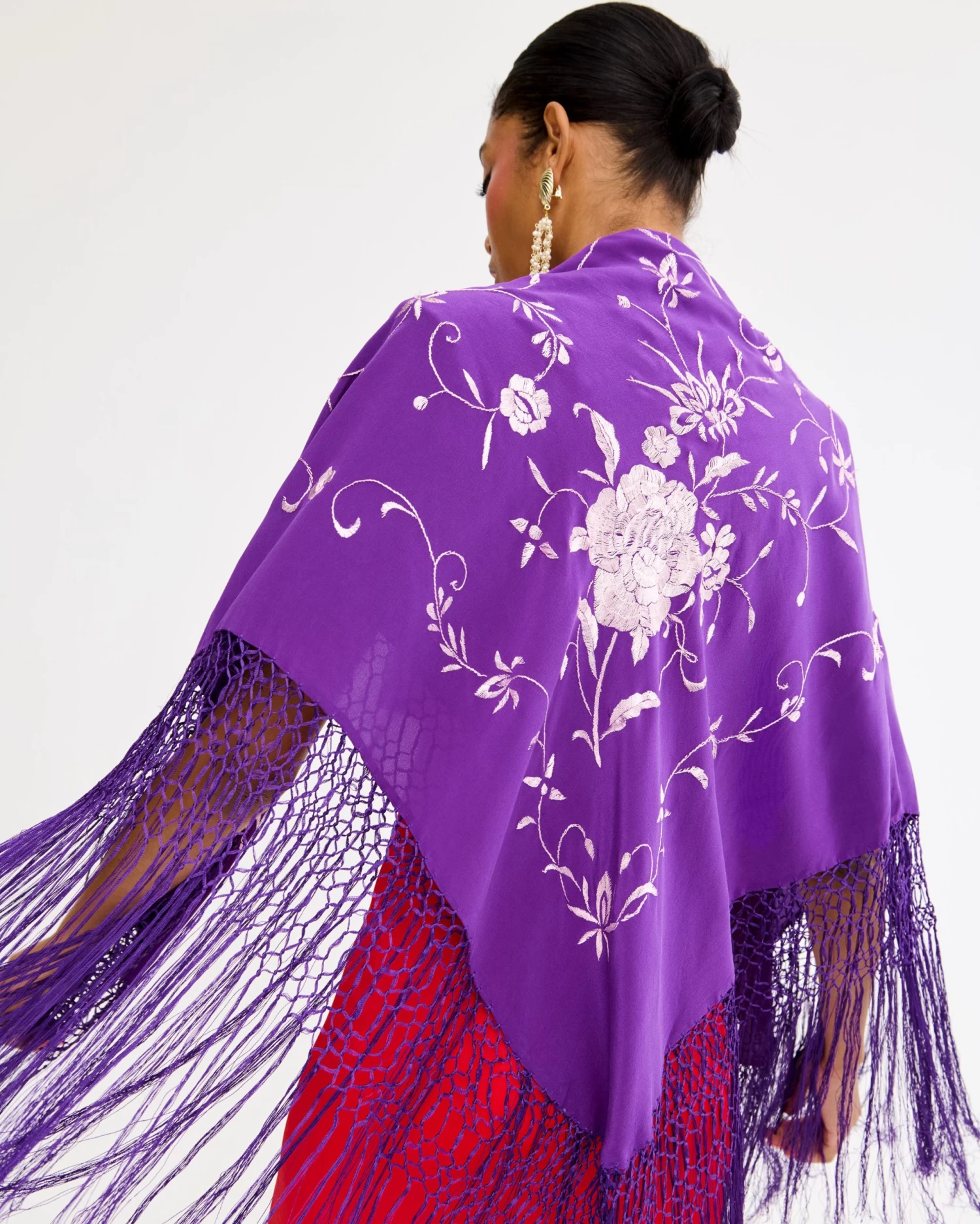 Mantón de manila con fondo color morado y flores en color crudo bordadas artesanalmente.