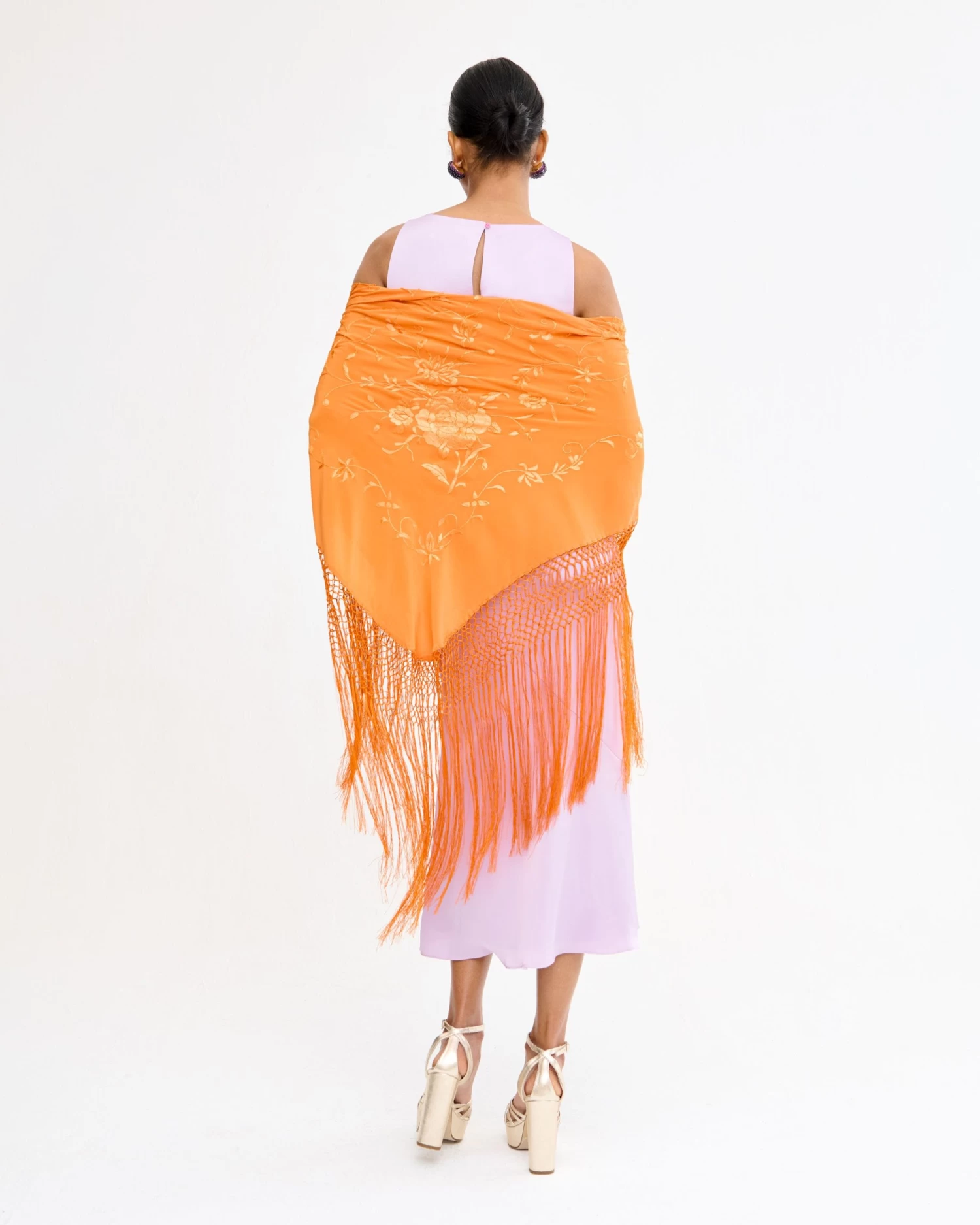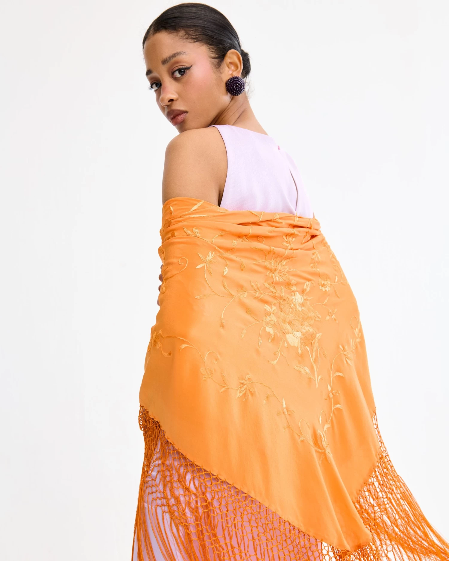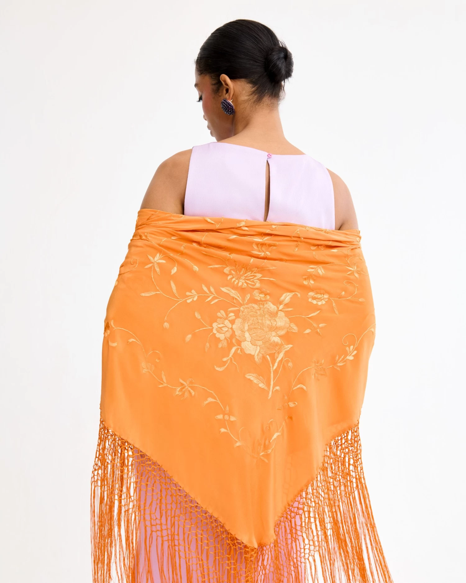 Mantón de manila con fondo color mostaza y flores a tono bordadas artesanalmente.