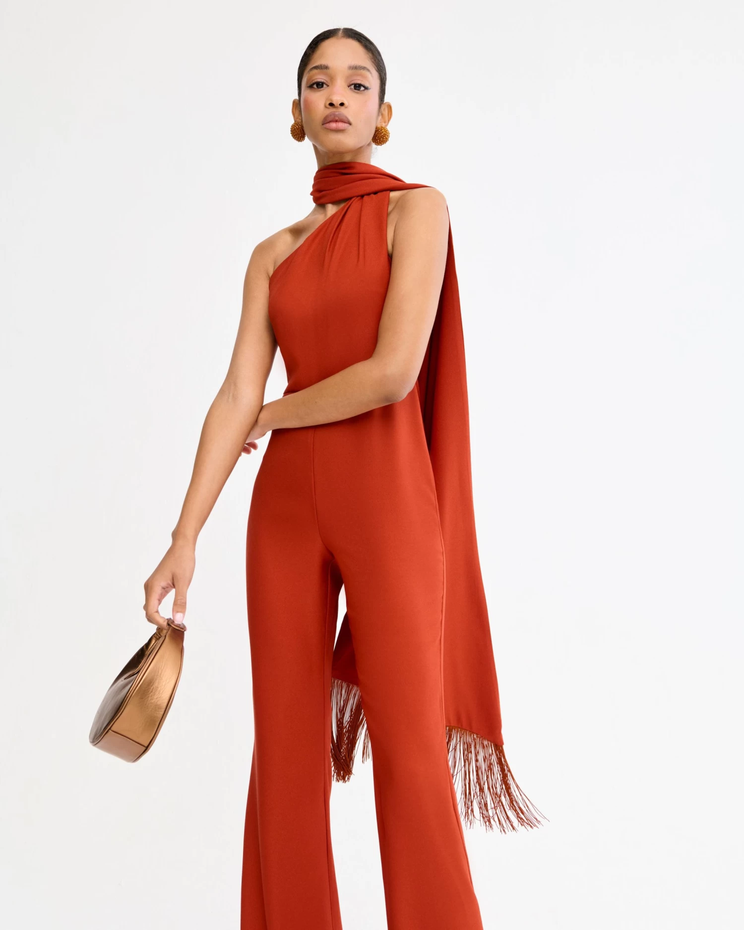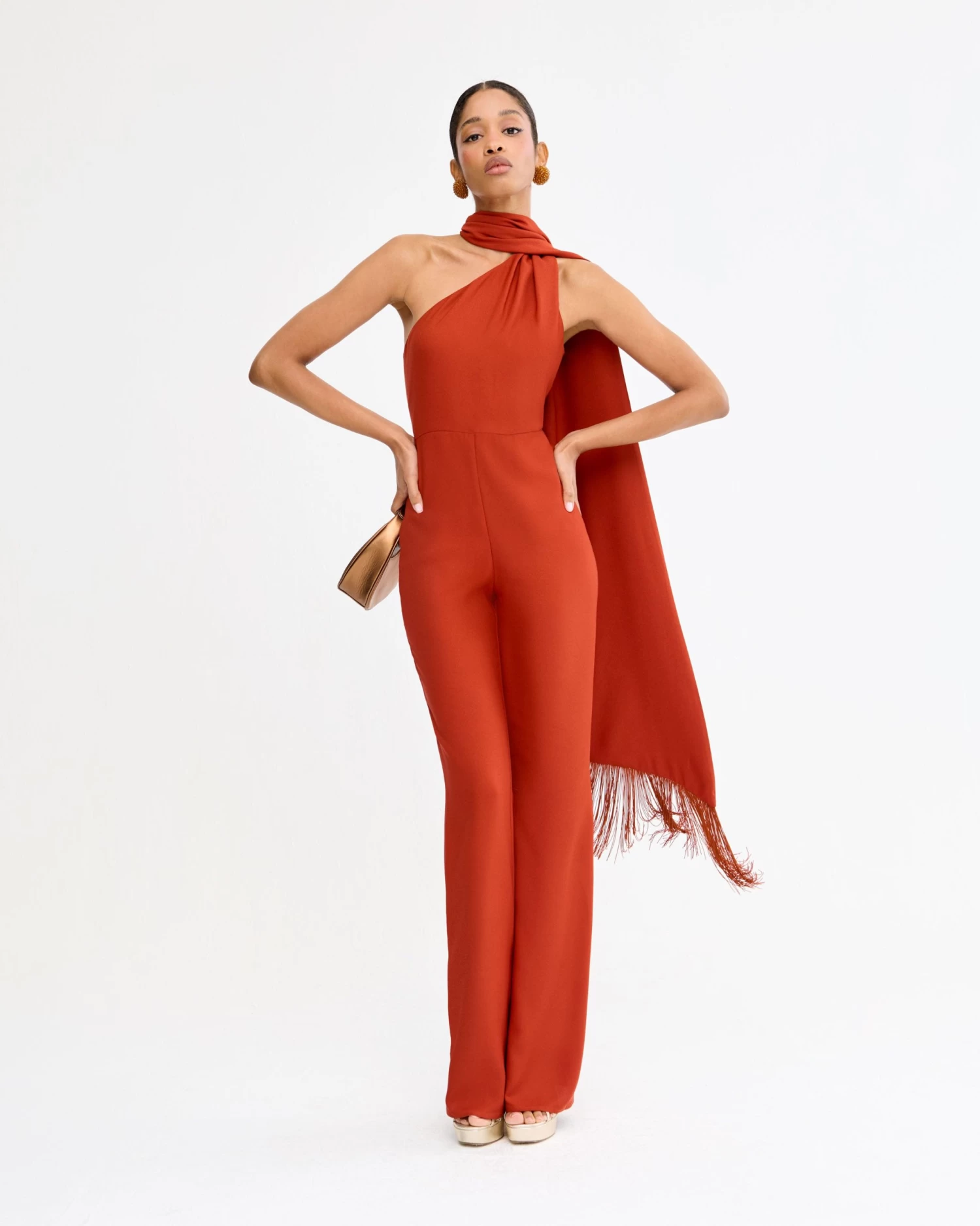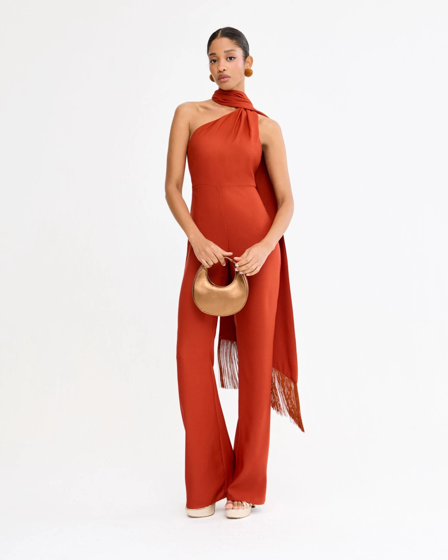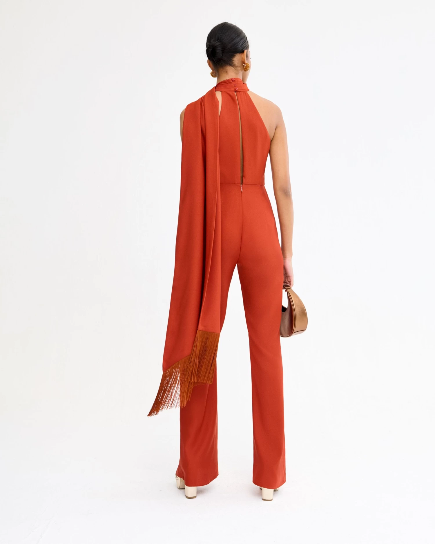 Mono largo asimétrico con capa al cuello con flecos a tono y detalle de lágrima en la espalda.