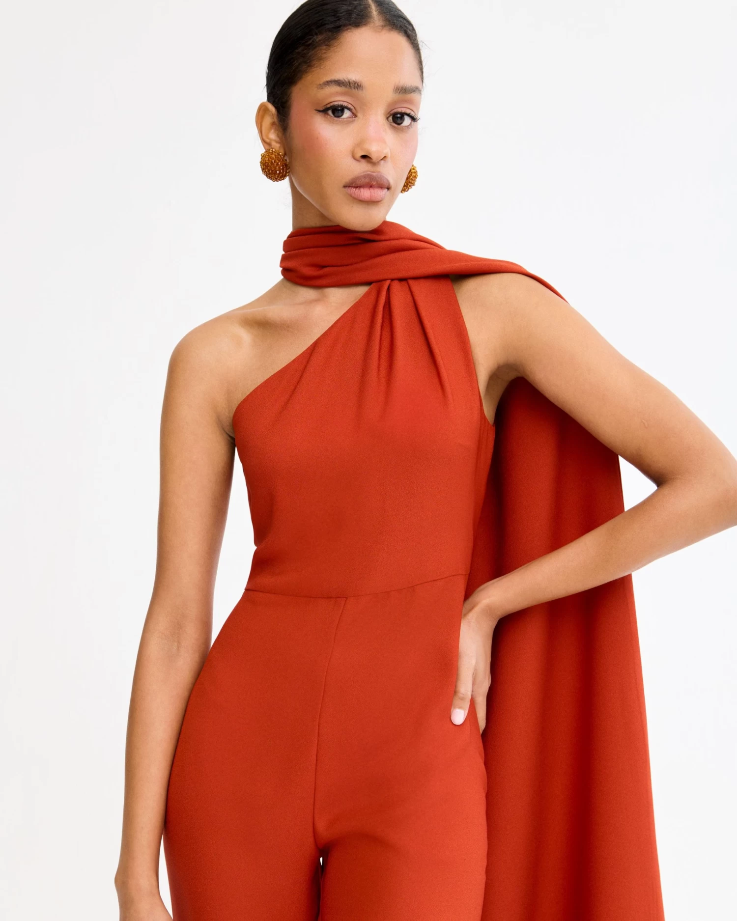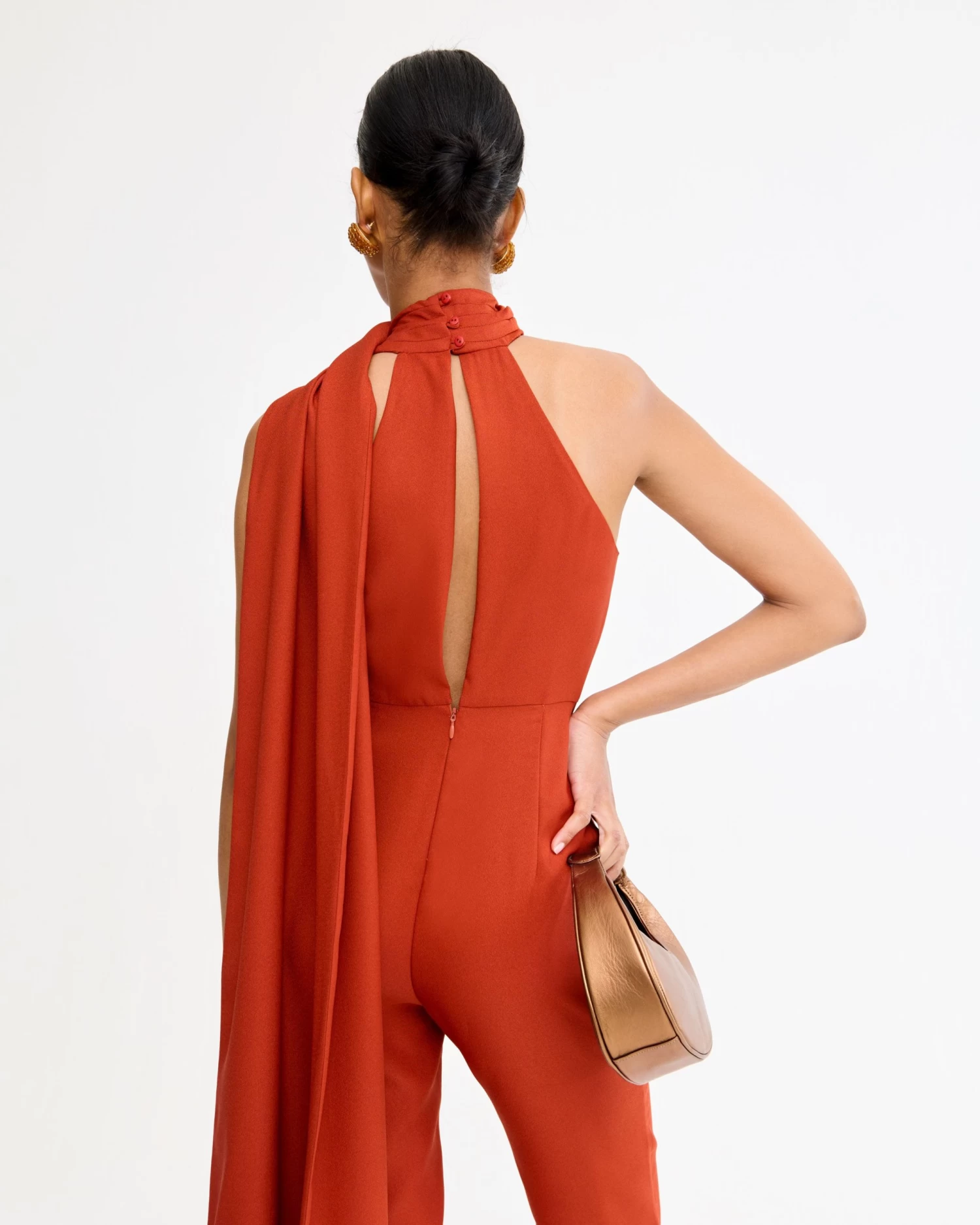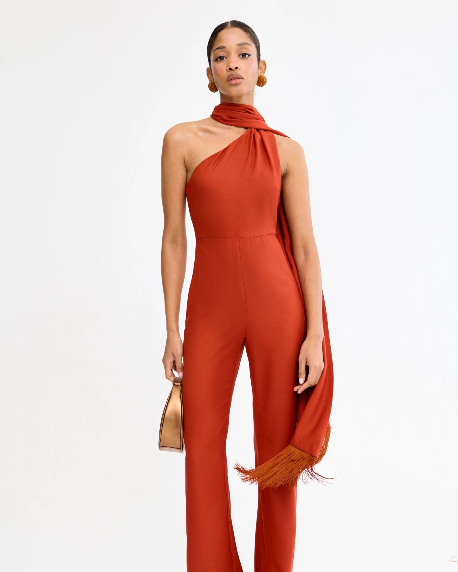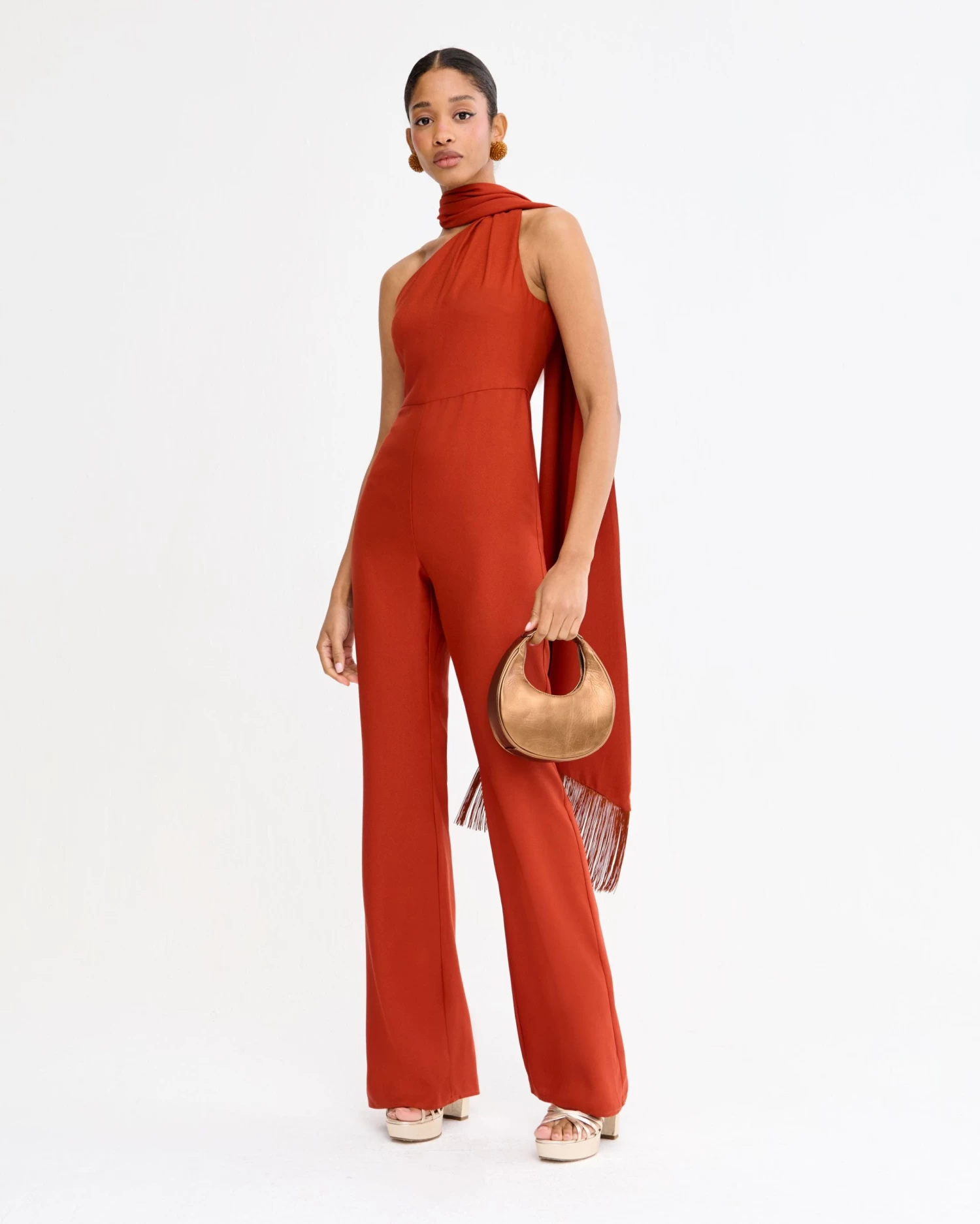 Mono largo asimétrico con capa al cuello con flecos a tono y detalle de lágrima en la espalda.