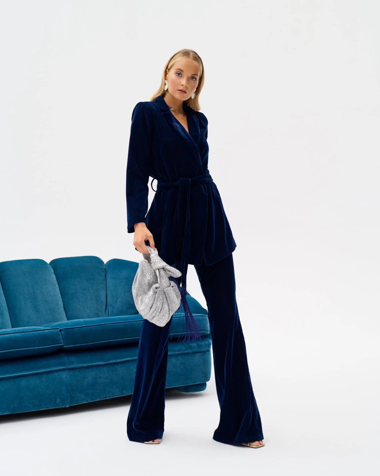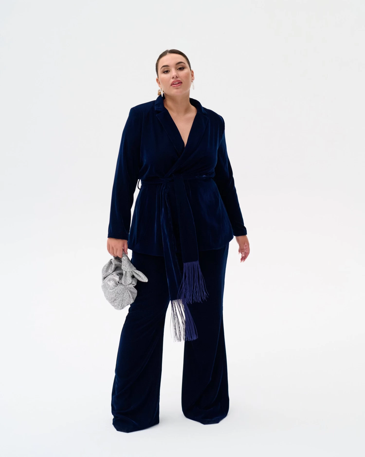Pantalón acampanado de talle alto con cinturilla de goma en la parte trasera y cremallera lateral.