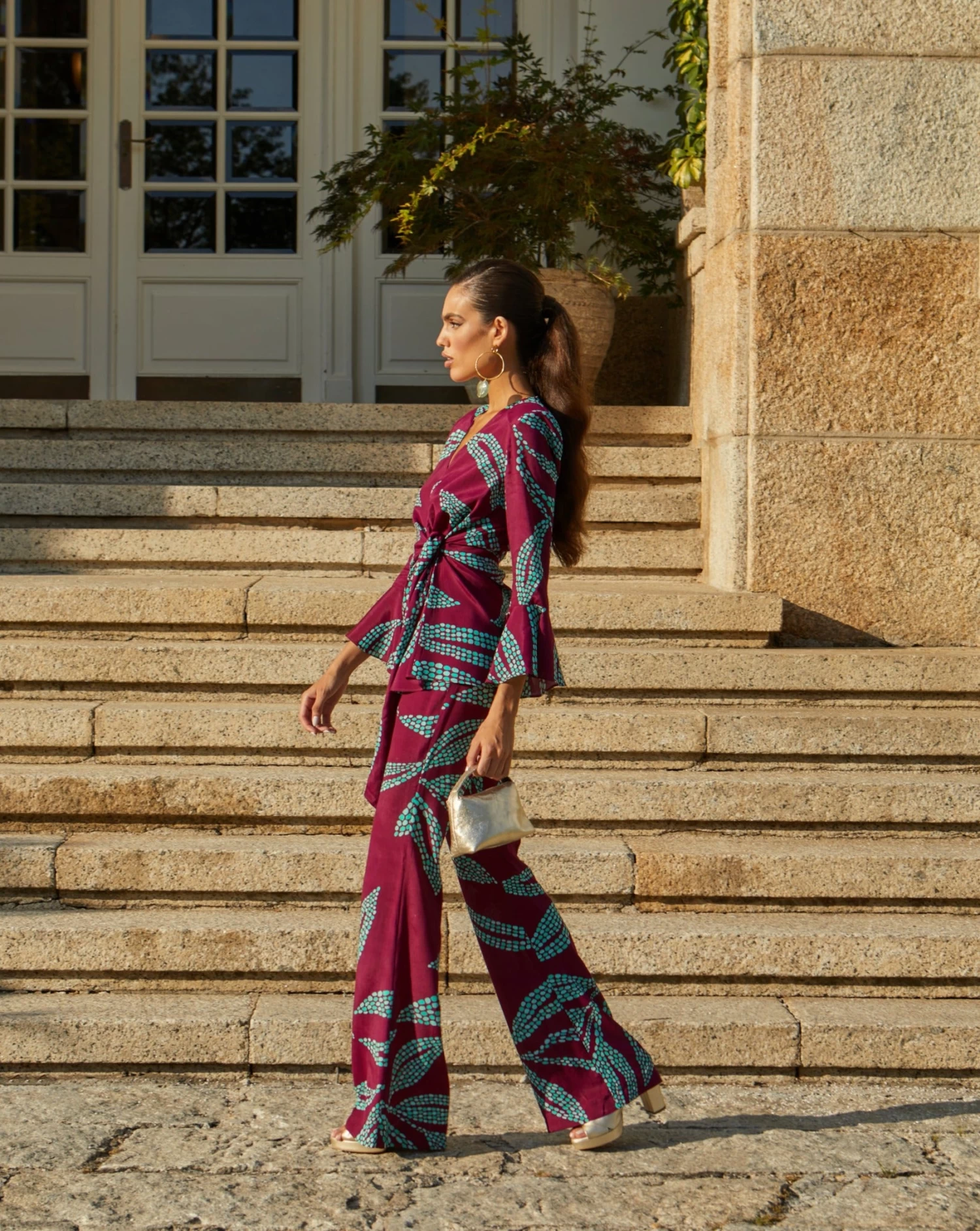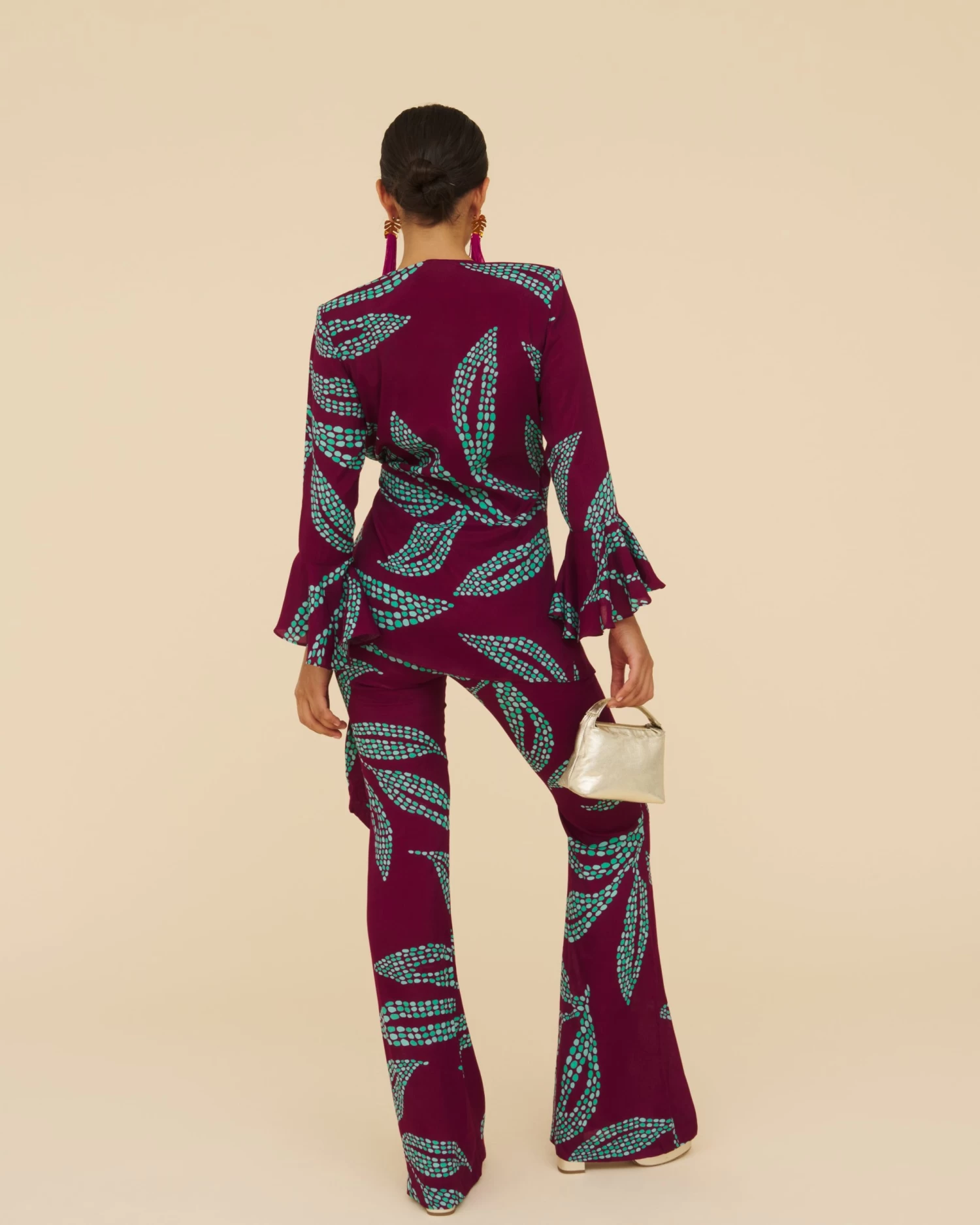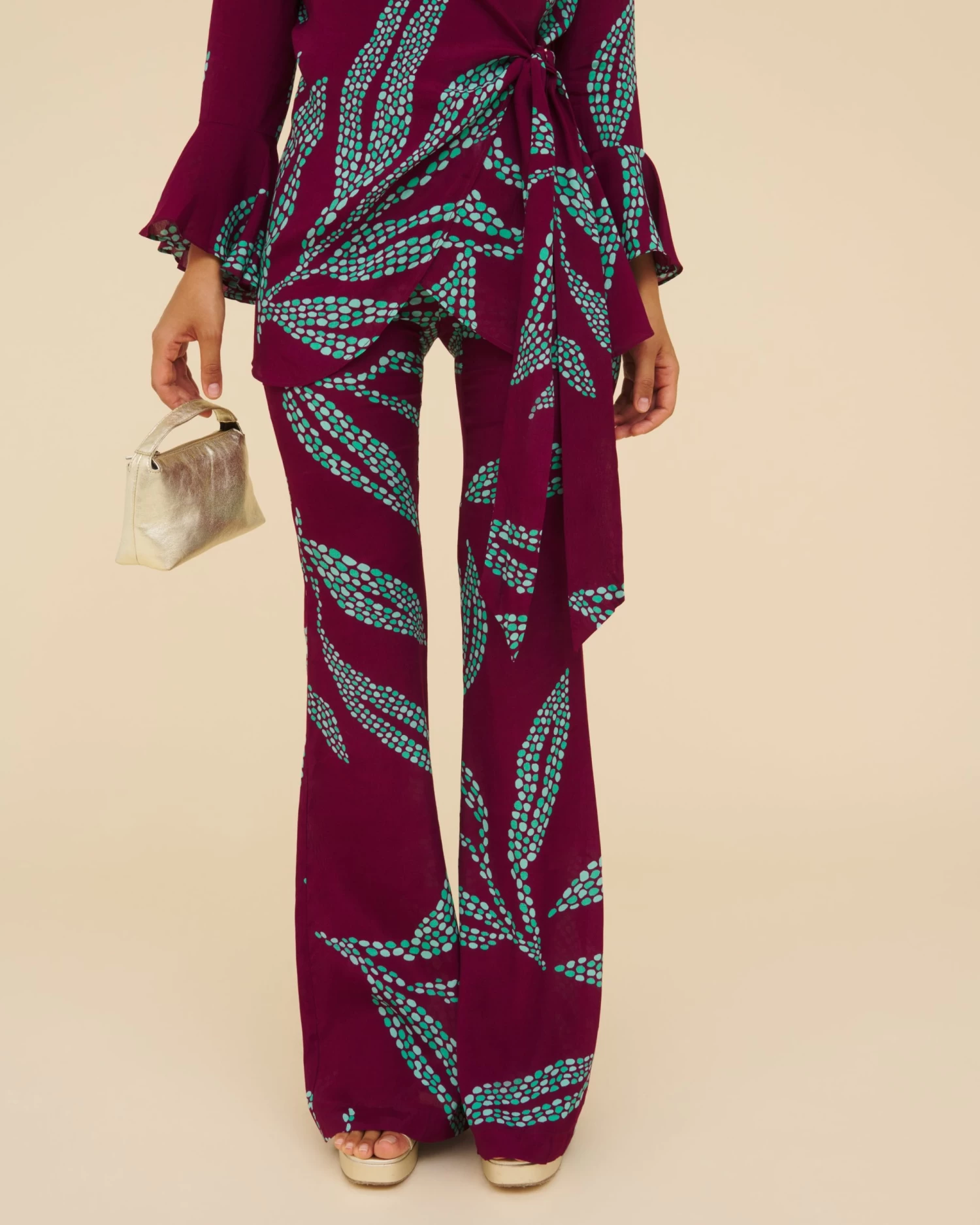 Pantalón acampanado de talle alto con cinturilla de goma en la parte trasera y cremallera lateral.
