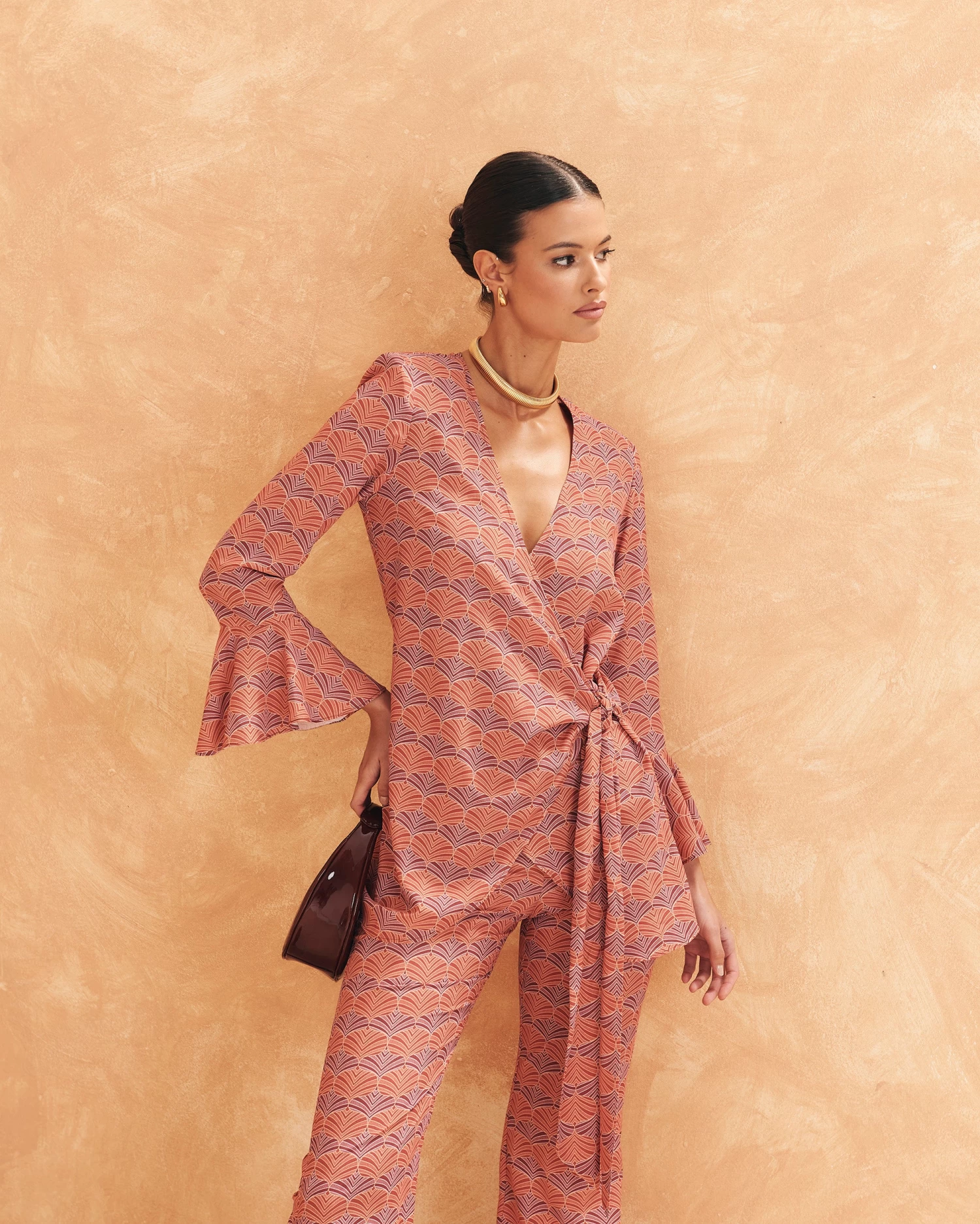 Pantalón acampanado de talle alto con cinturilla de goma en la parte trasera y cremallera lateral.