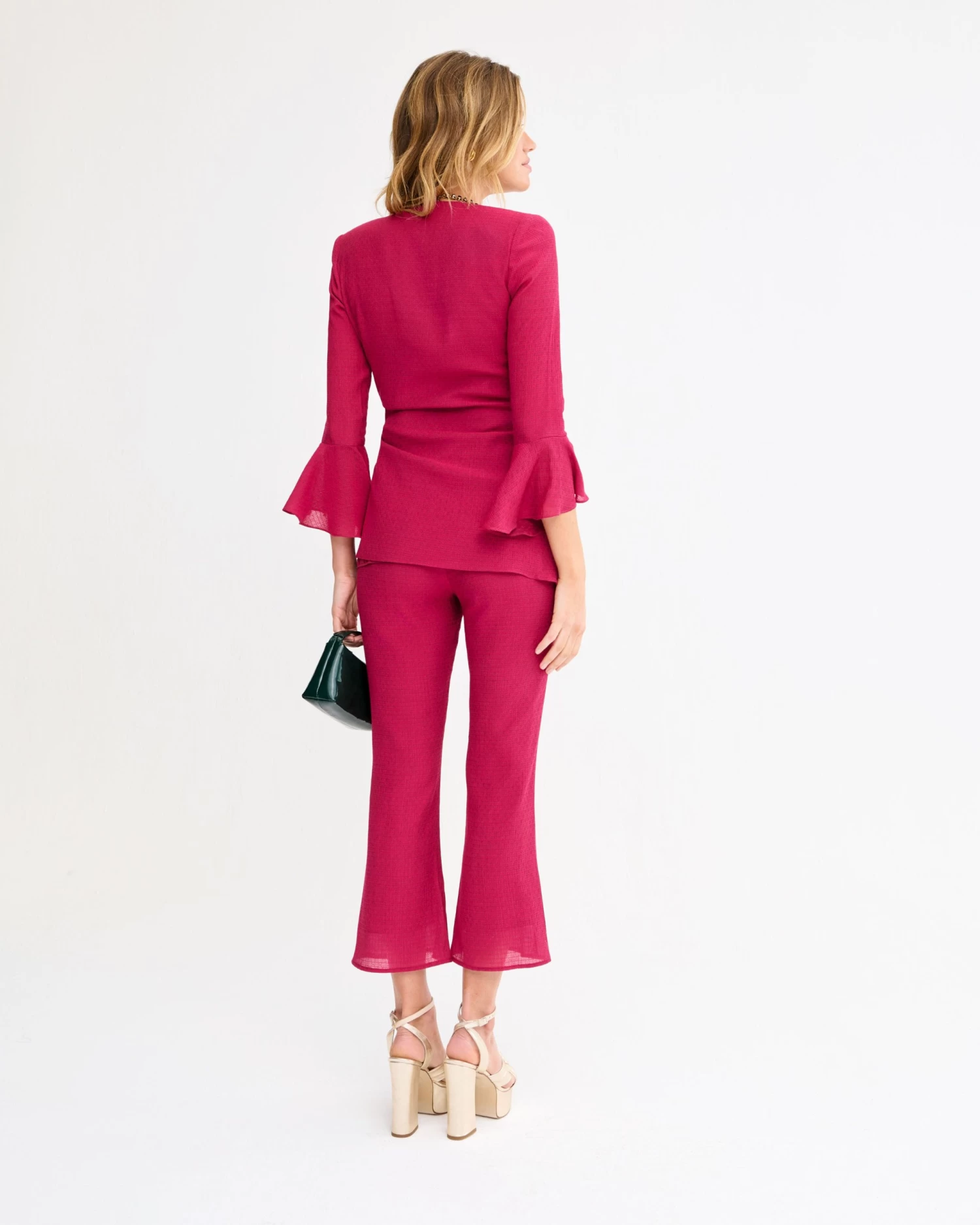 Pantalón tobillero de talle alto con cinturilla de goma en la parte trasera y cremallera lateral.