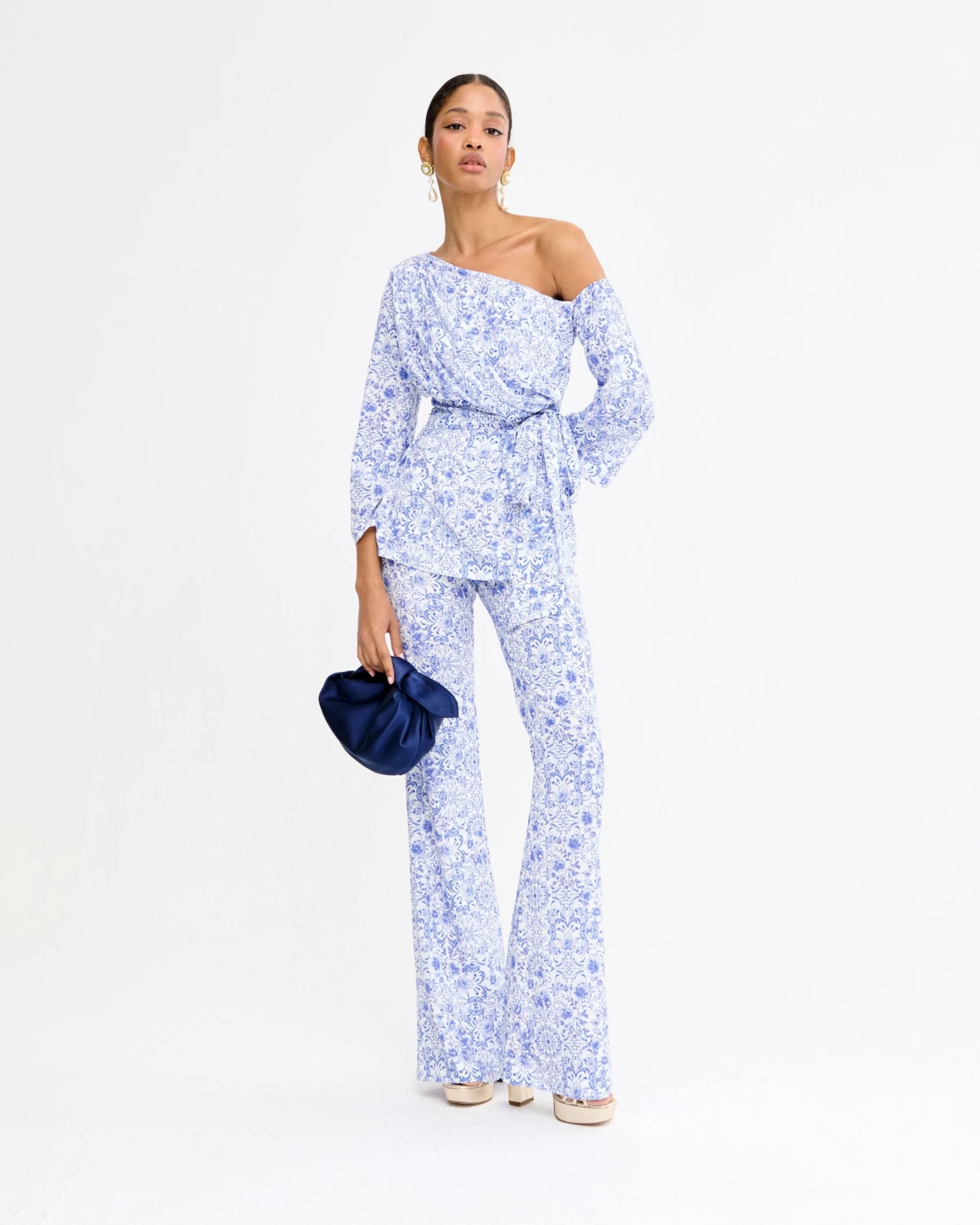 Pantalón acampanado de talle alto con cinturilla de goma en la parte trasera y cremallera lateral.