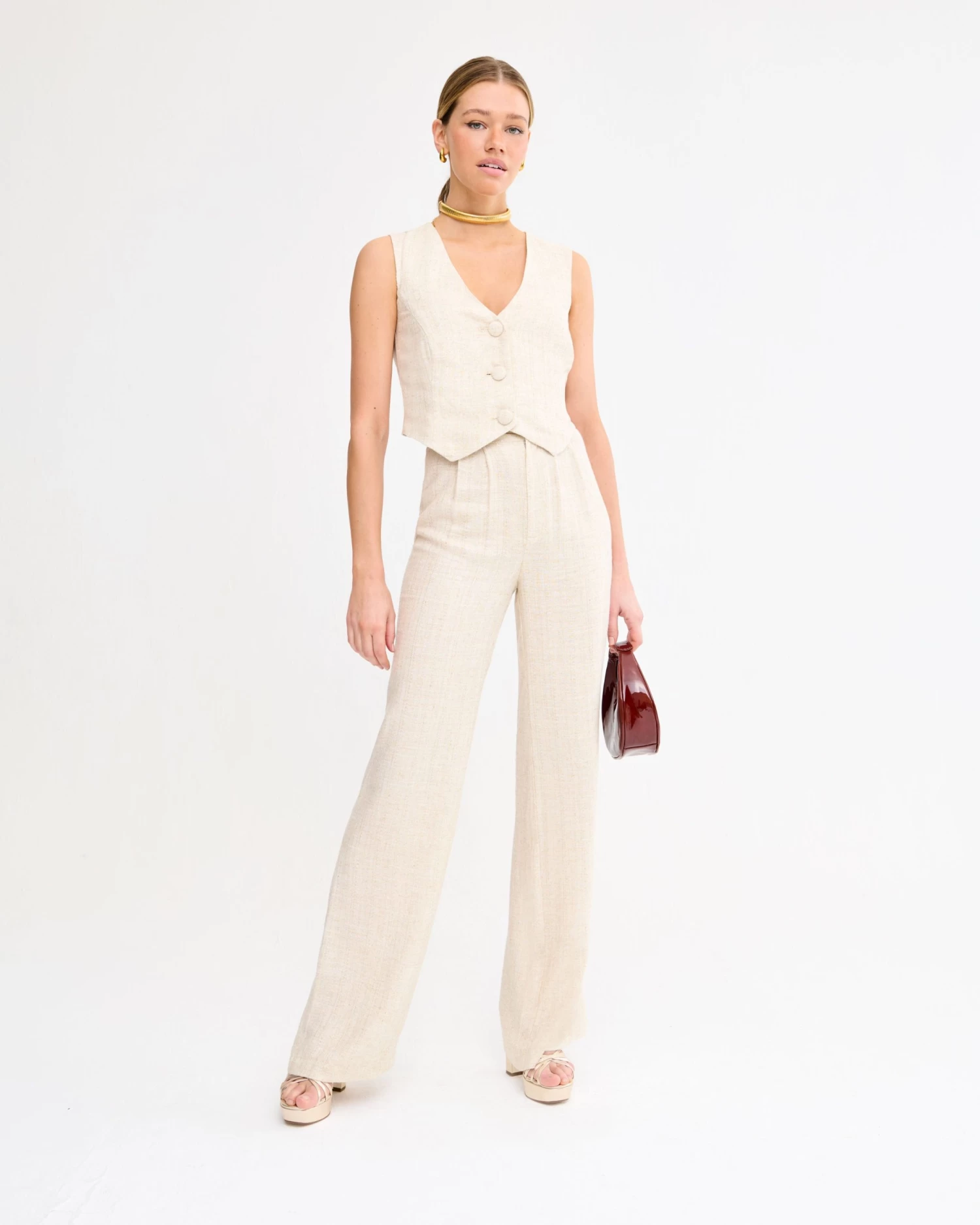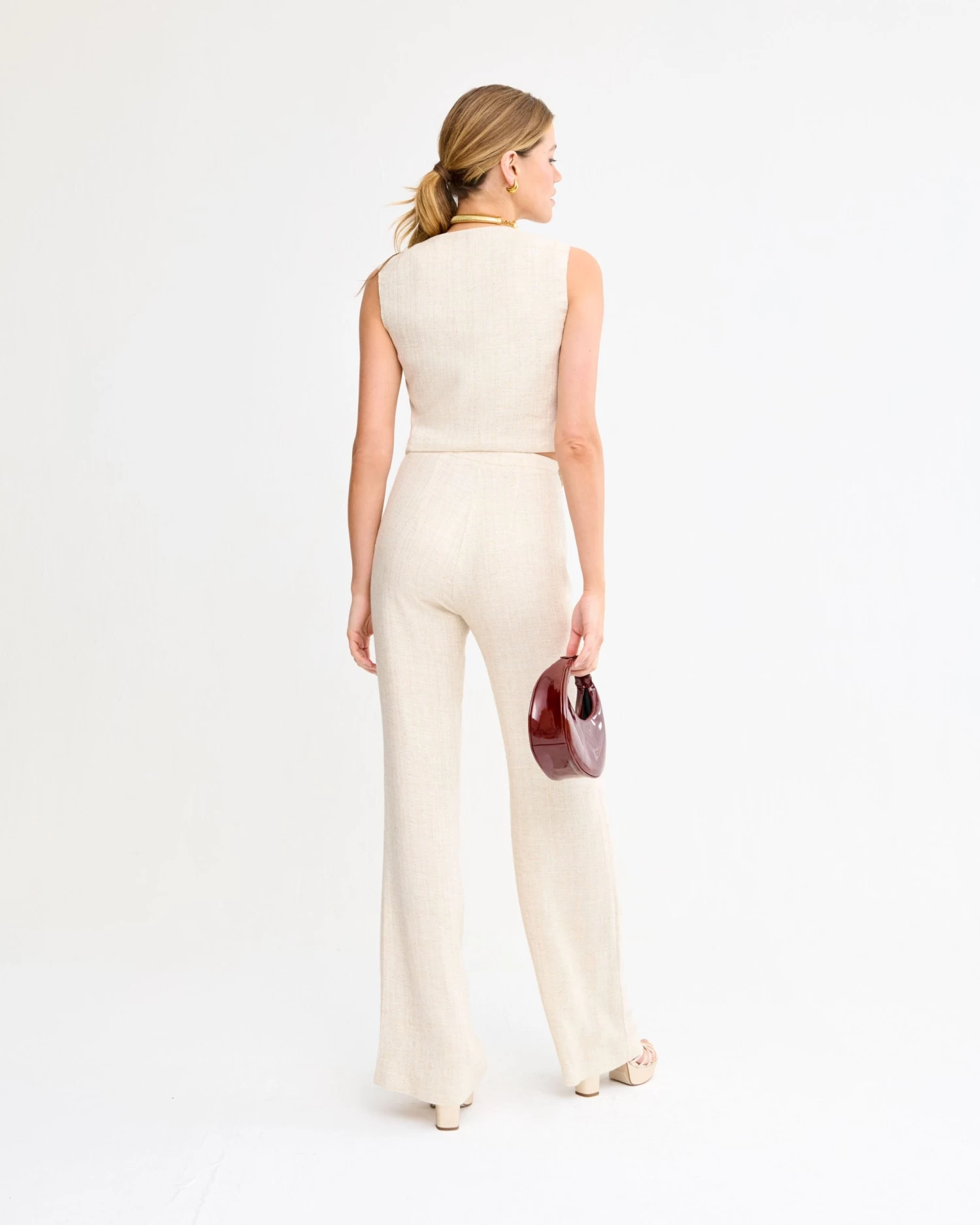 Pantalón recto de talle alto con detalle de pinzas y cierre frontal con cremallera, botón interior y gancho metálico.