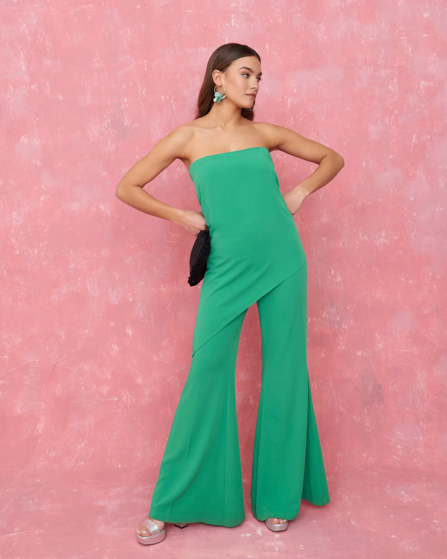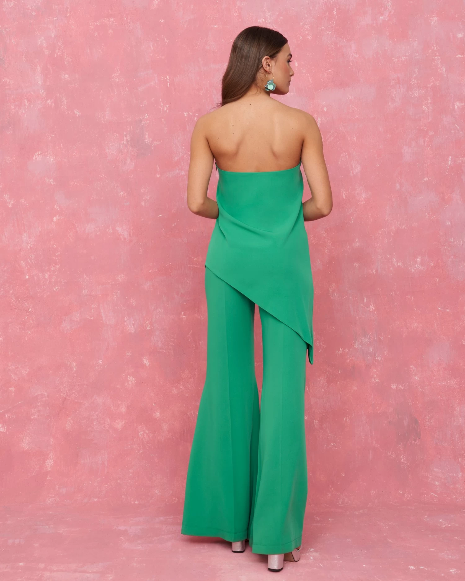 Pantalón acampanado de tiro alto y cierre con cremallera lateral.