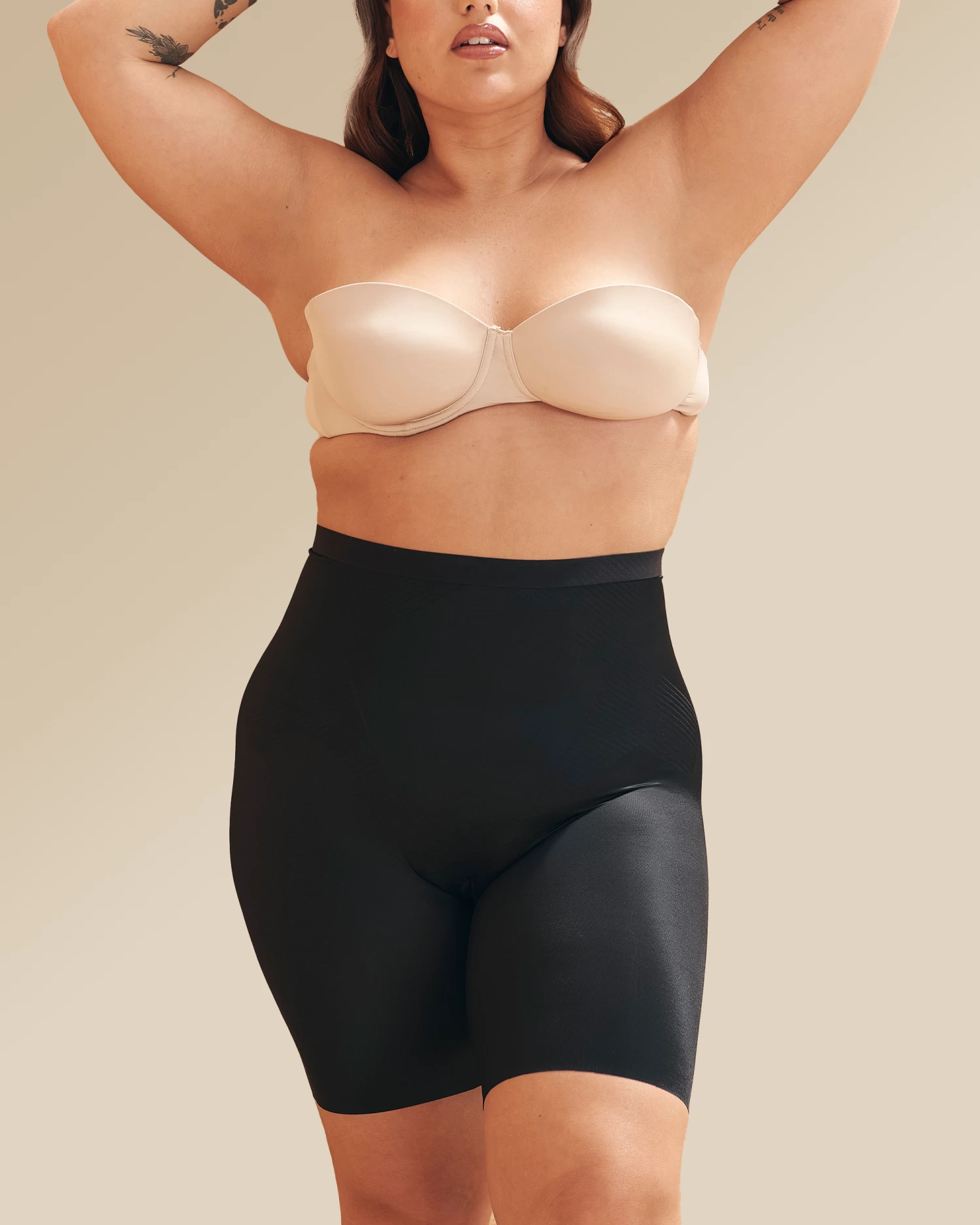 Short de mujer moldeador con efecto reductor. Tejido de microfibra sin costuras para que no se marque nada bajo la ropa. Paneles de compresión en el abdomen, la cintura, los muslos y los glúteos.