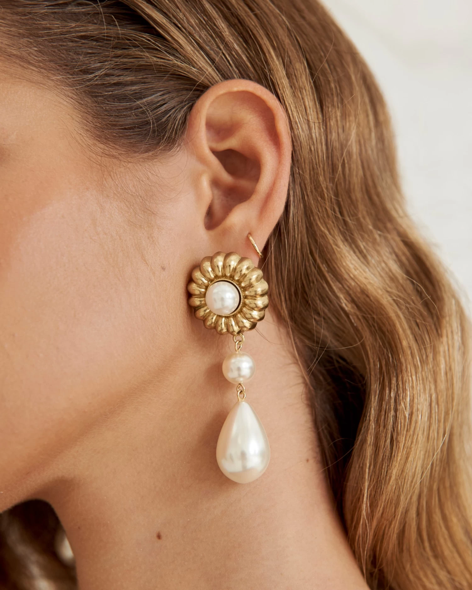Pendientes dorados con forma de flor y colgante de perlas.