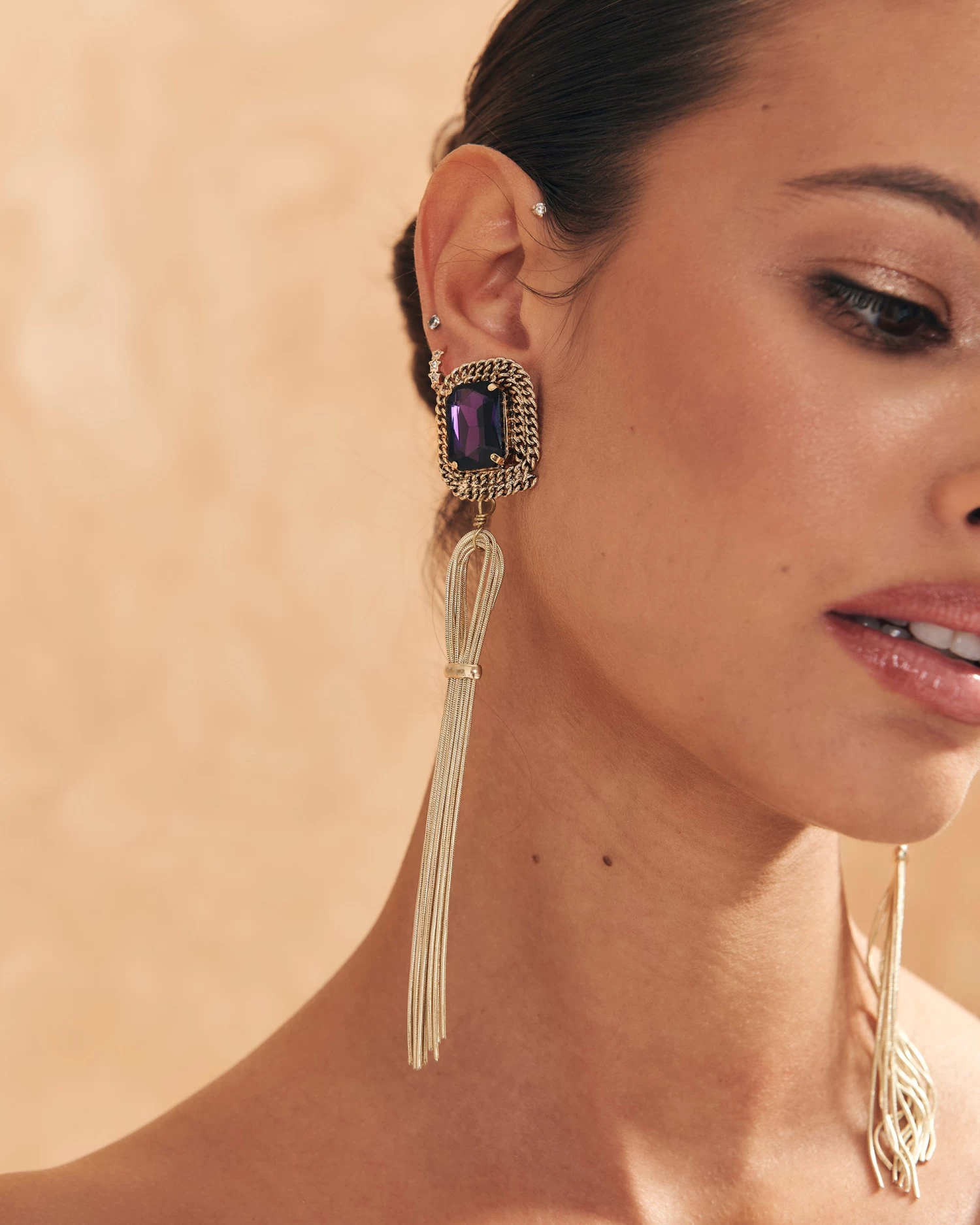 Pendientes dorados con cabezal rectangular con piedra en el centro y colgantes tipo fleco. Cierre con clip.