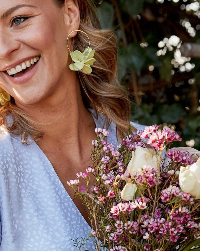 Pendientes de pétalos de metacrilato muy ligeros colgados sobre aro con cierre incorporado.