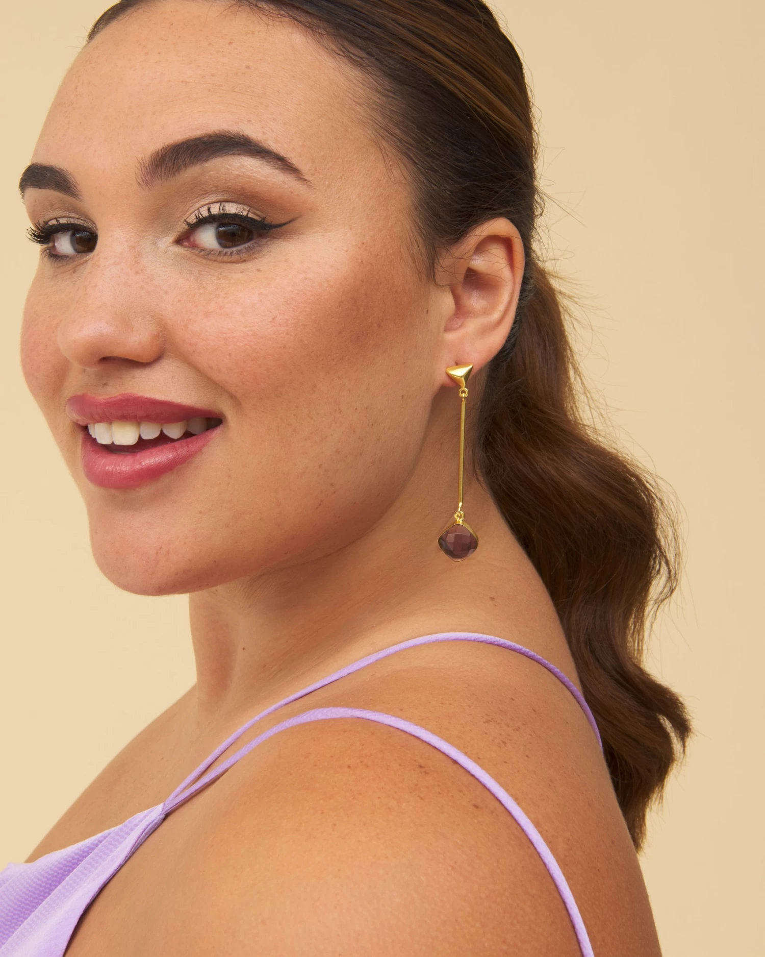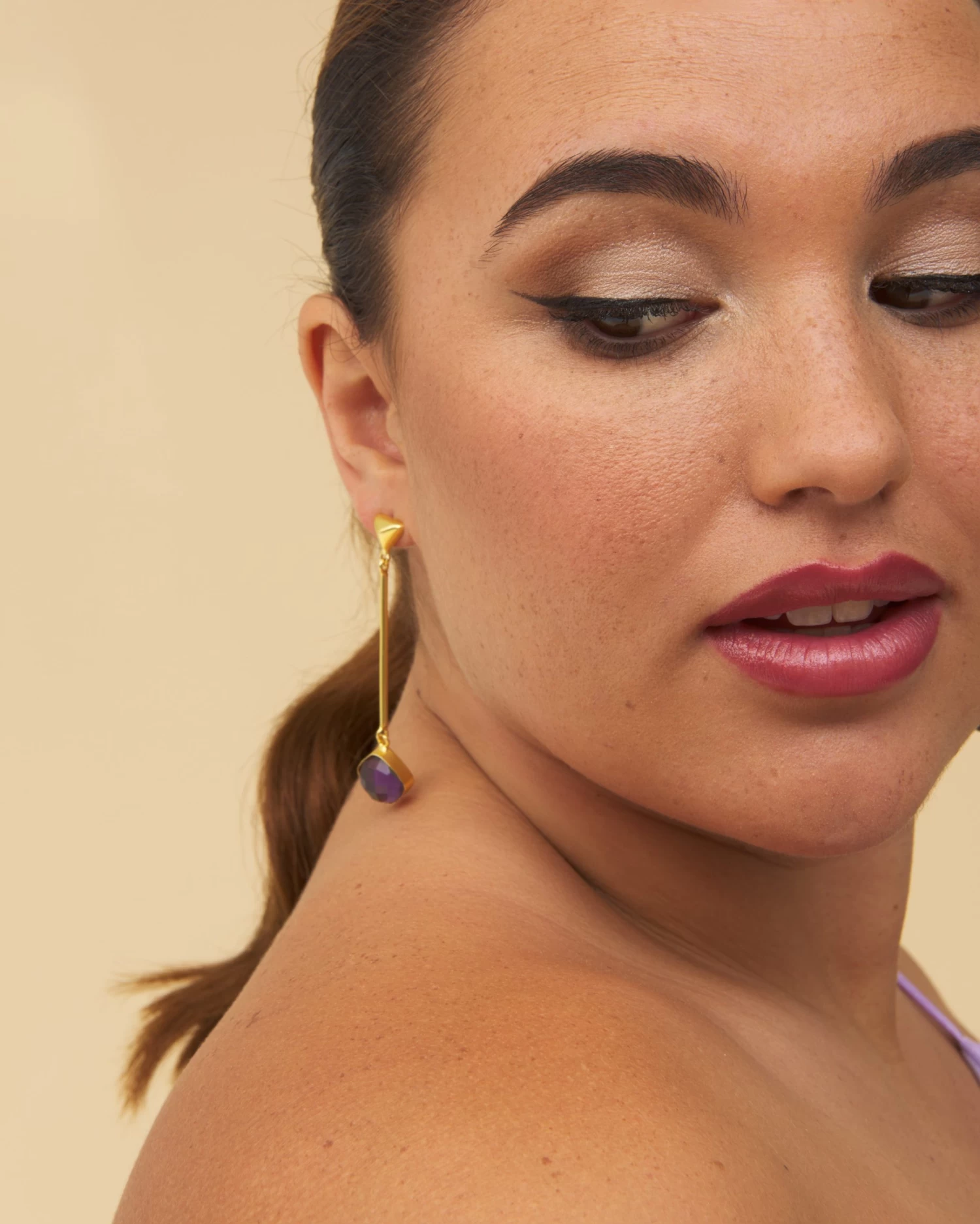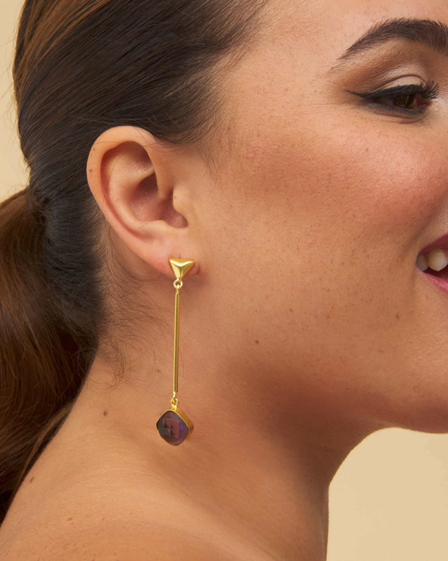 Pendientes largos dorados con detalle de聽amatista y cierre de tuerca tradicional.