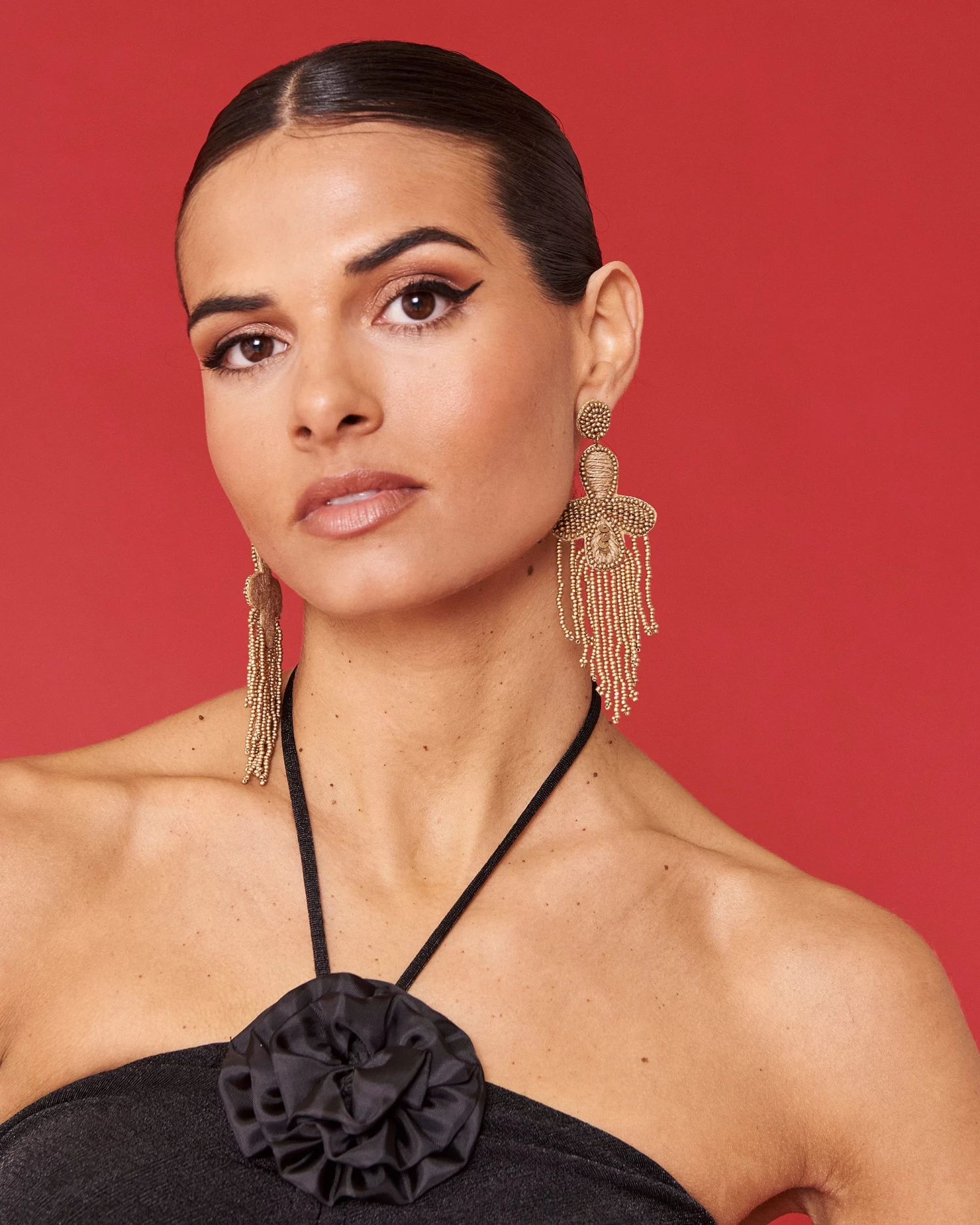 Pendientes con forma de flor forrada en rafia natural y flecos.