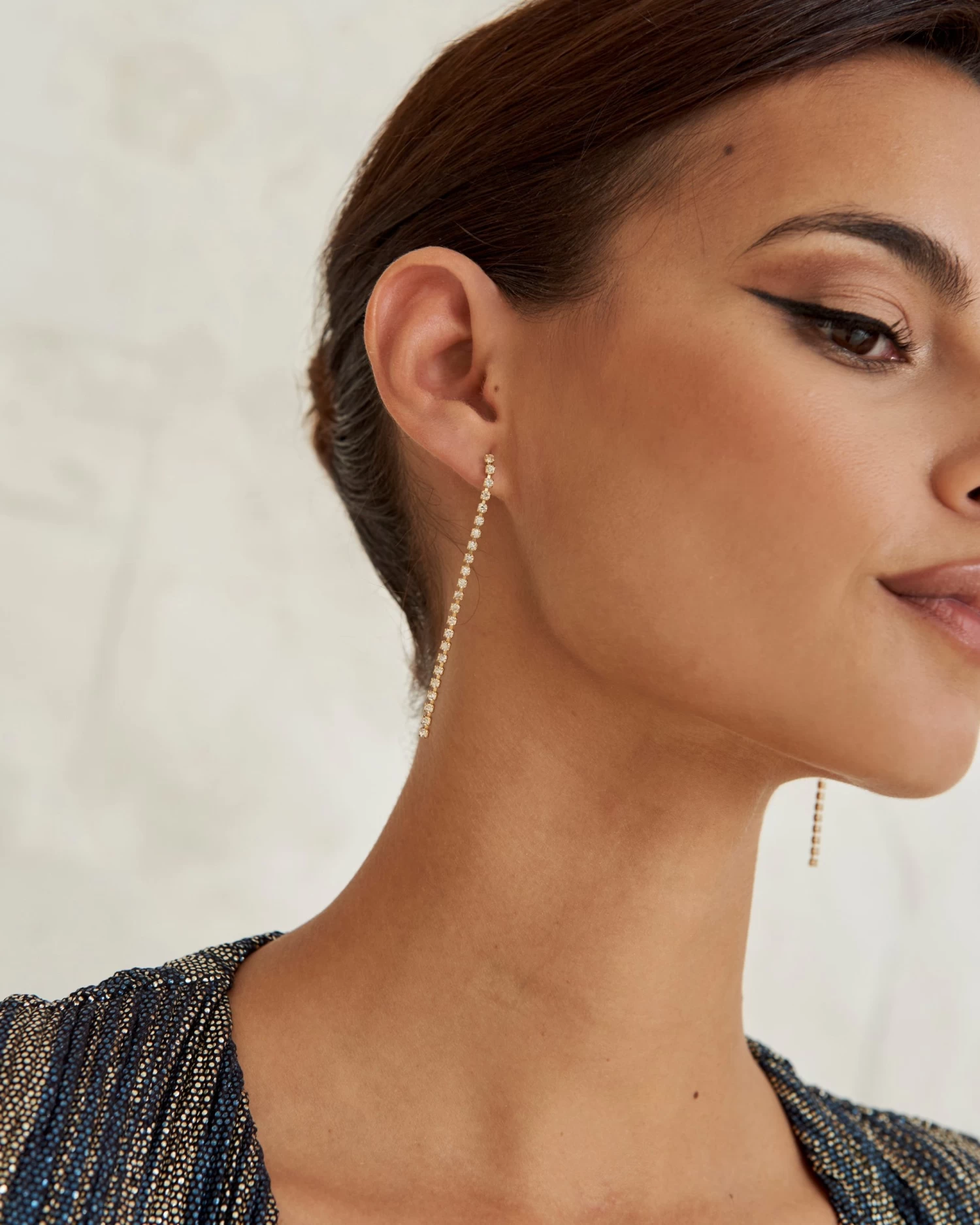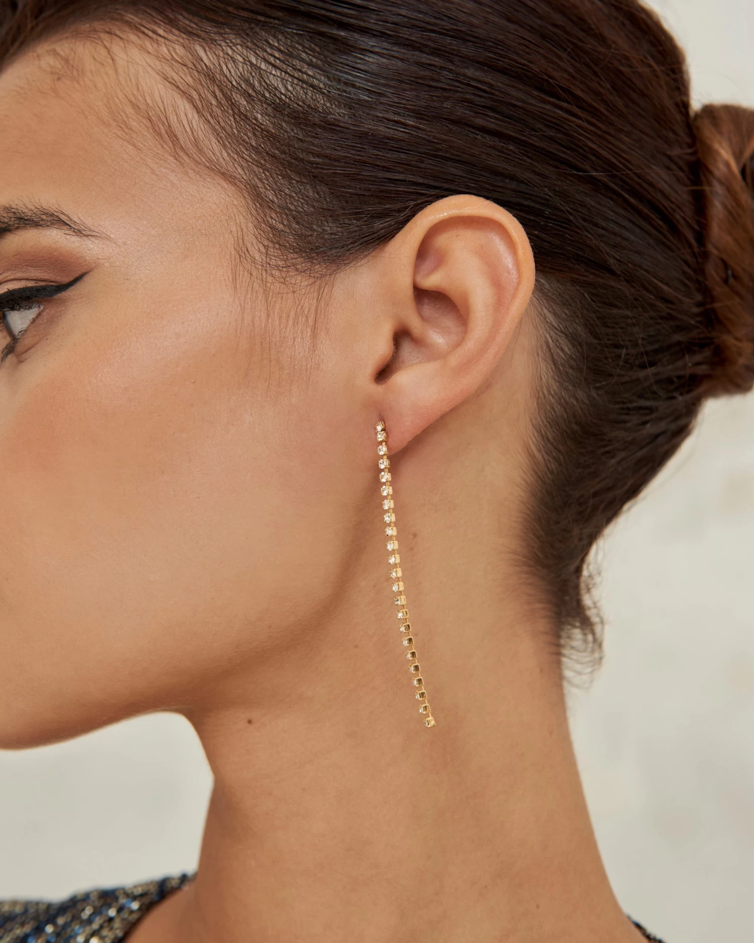 Pendientes largos con pequeñas piedras de circonita incrustadas. Cierre de tuerca.