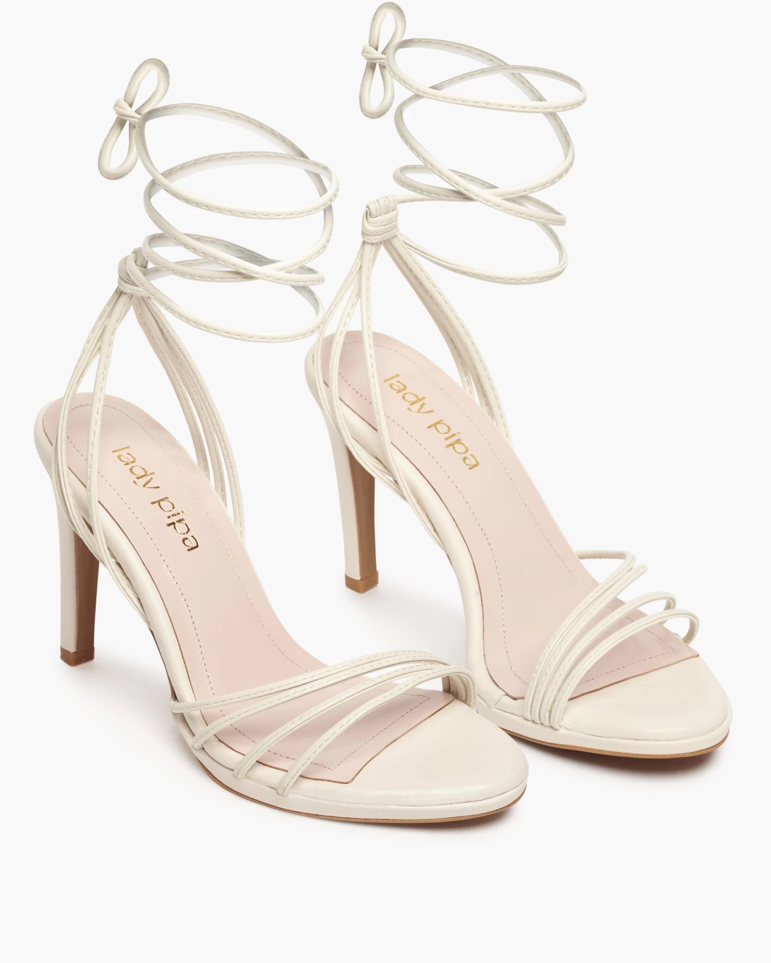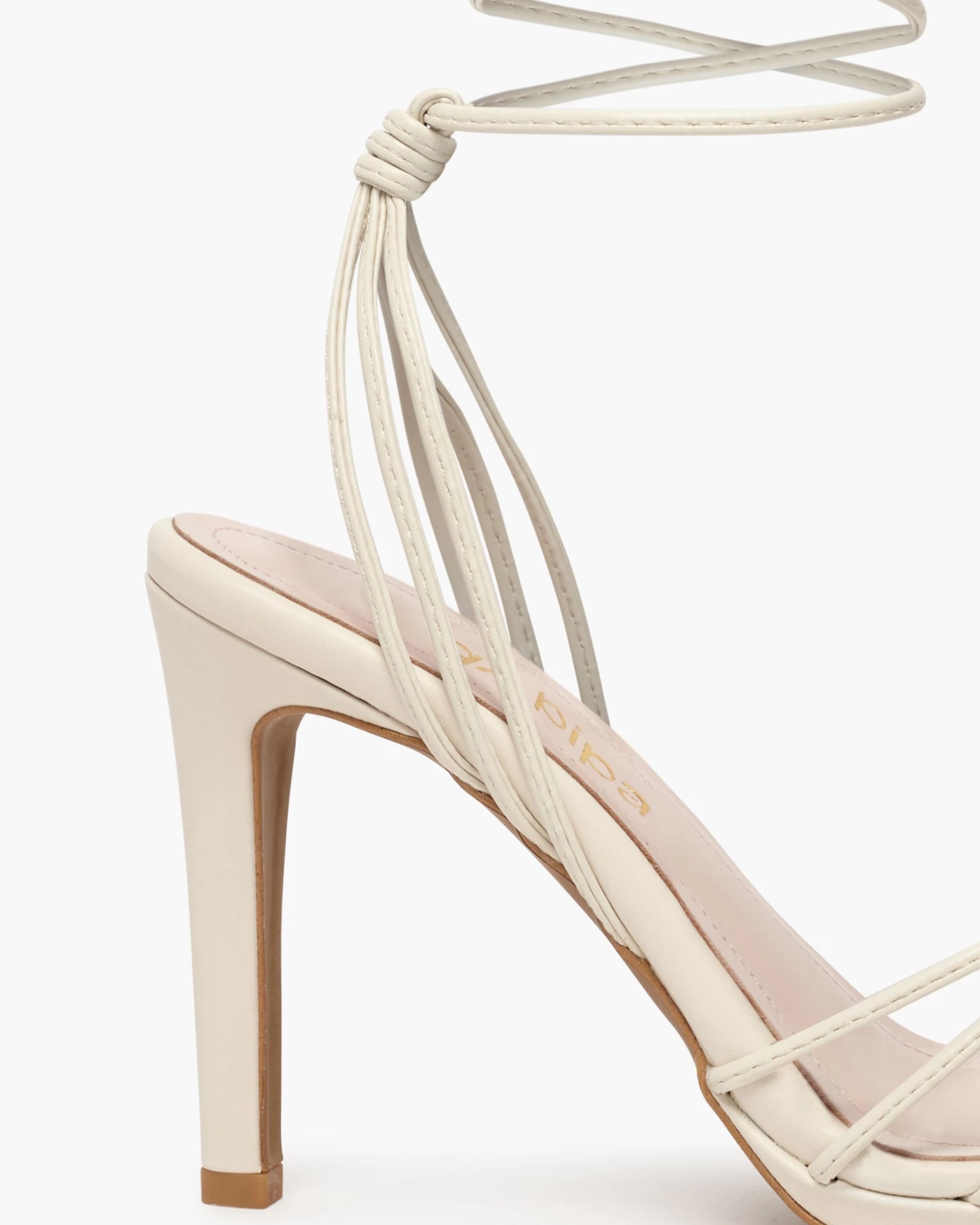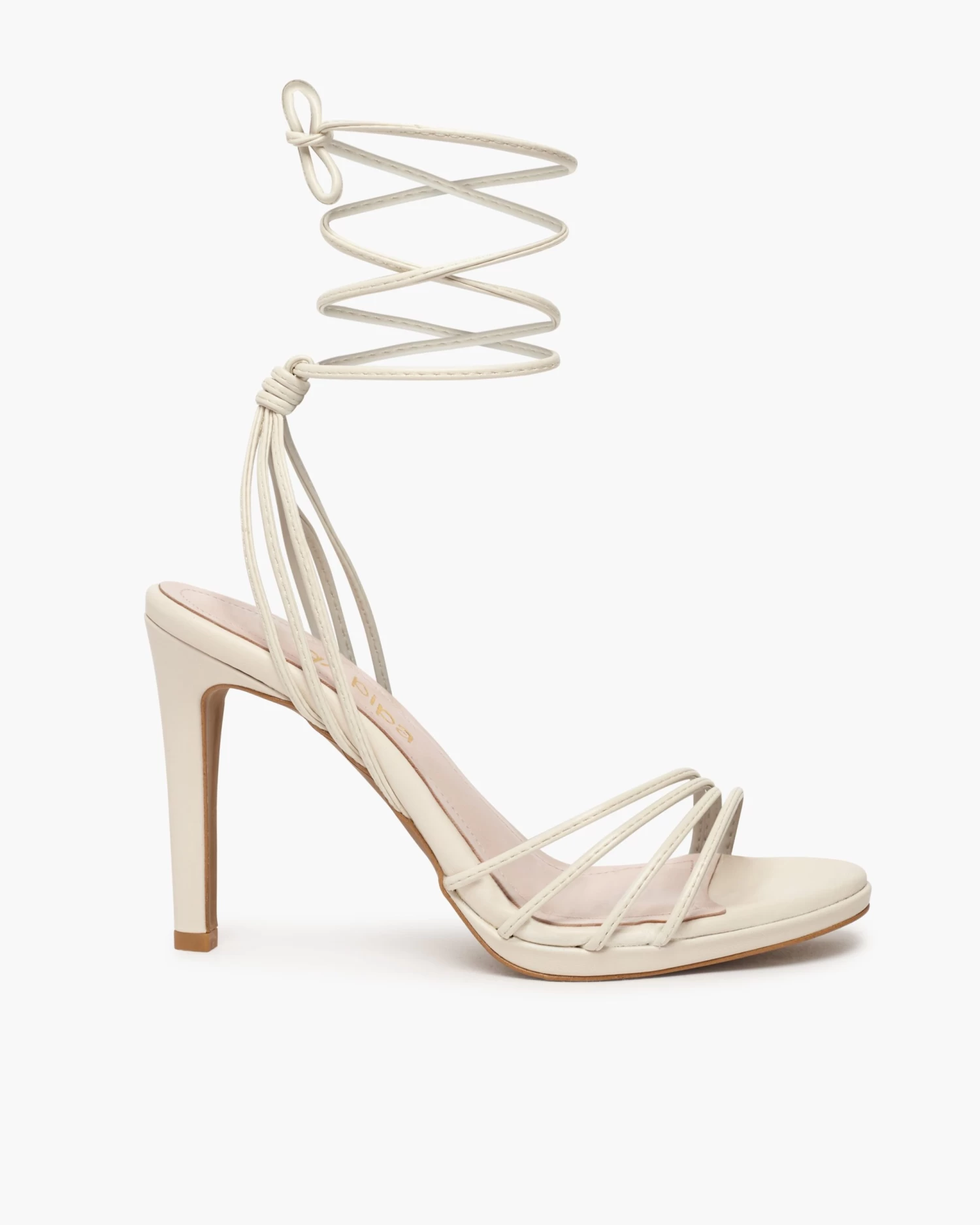 Sandalia de tacón fino y punta redonda con detalle de tiras en la parte delantera. Cierre mediante tiras atadas al tobillo. Tiene la planta muy acolchada para mayor confort.