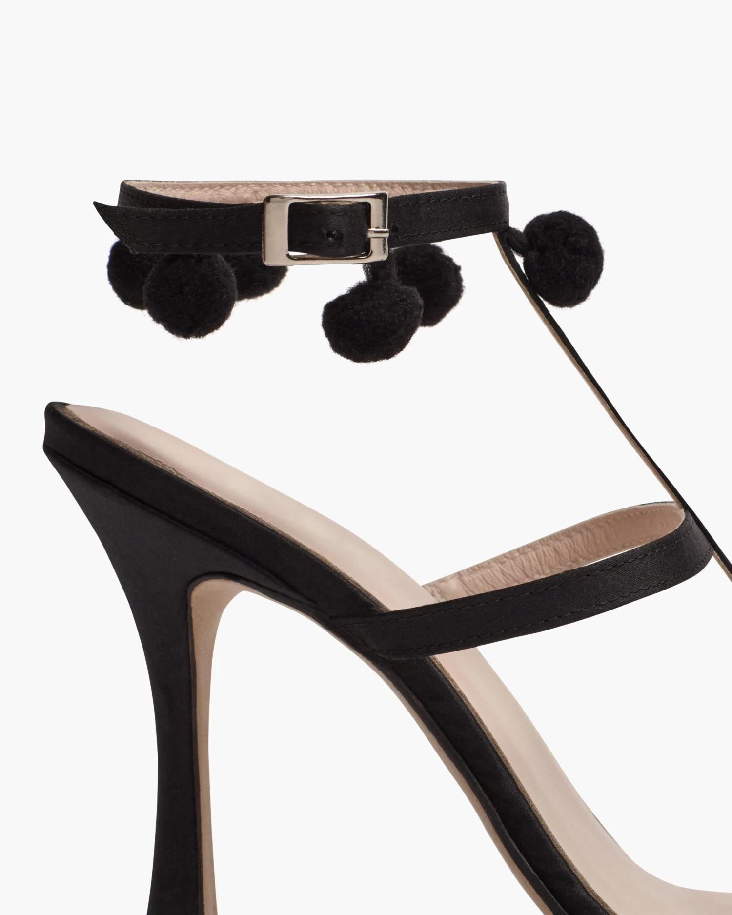 Sandalia de raso de tacón fino y tiras finas con detalle de madroños al tono. Acabada en punta redonda. Cierre de pulsera con hebilla en el tobillo. Tiene la planta muy acolchada para mayor confort.