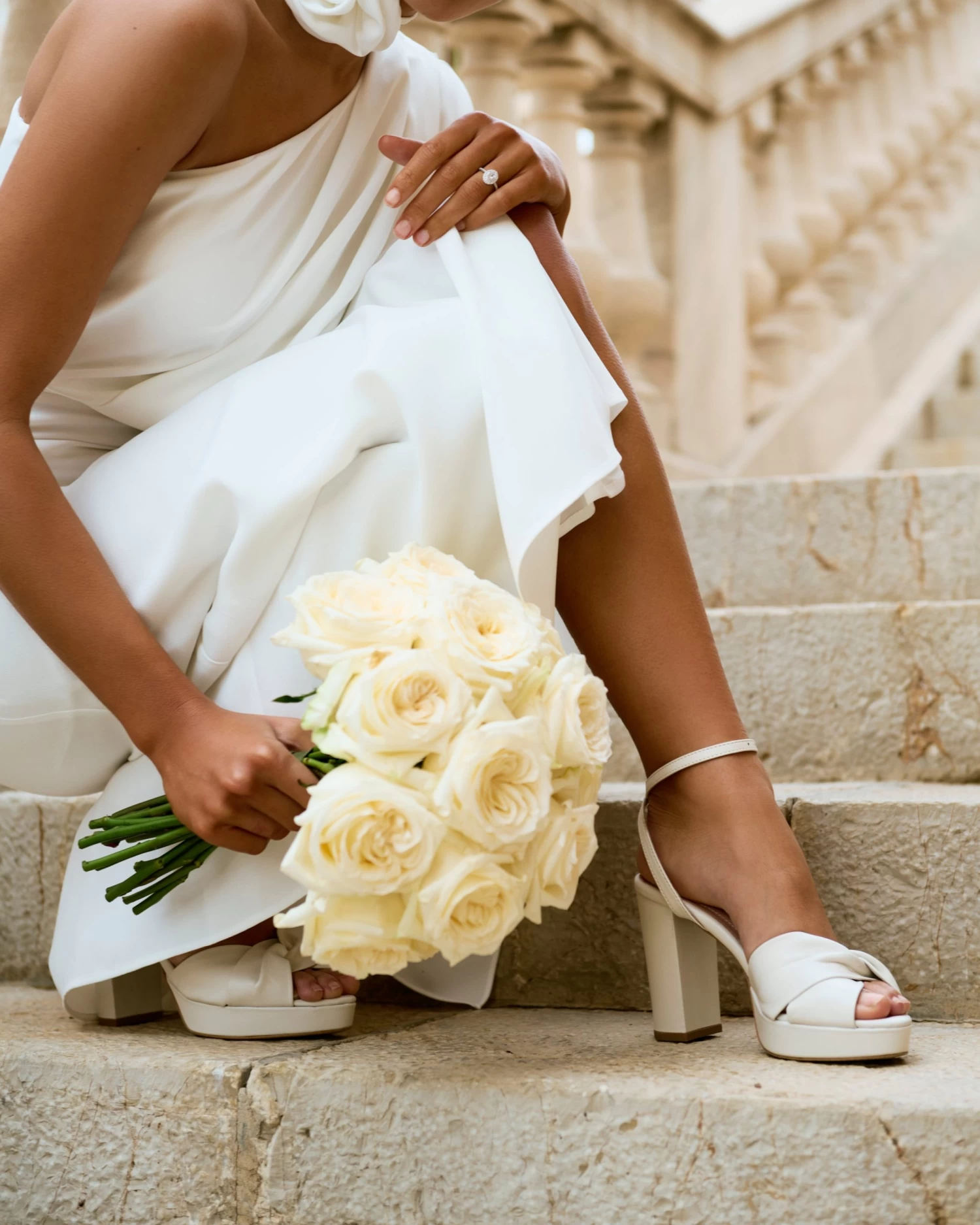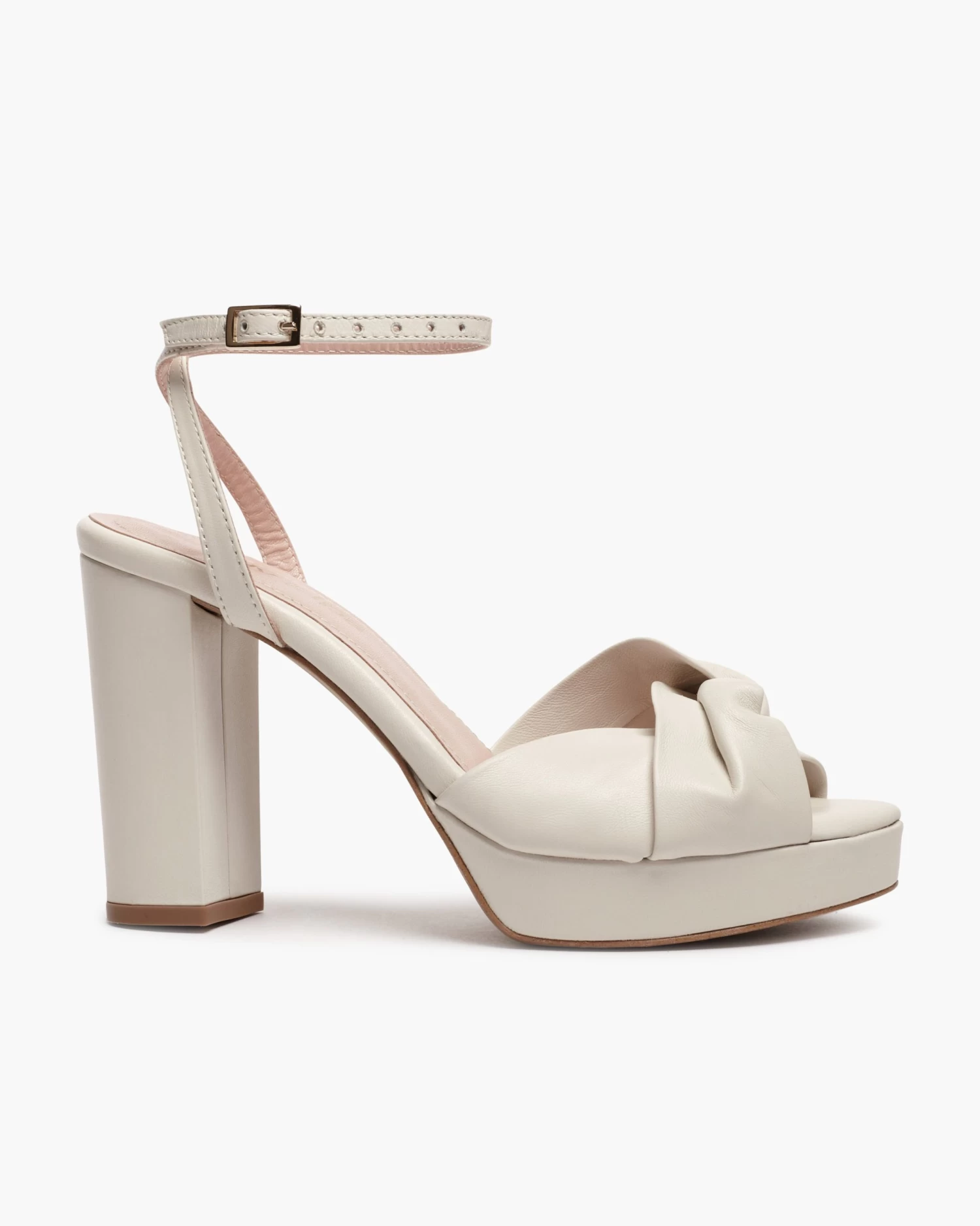 Sandalia de tacón ancho con plataforma y tiras cruzadas en la parte delantera. Cierre de pulsera con hebilla en el tobillo. Tiene la planta muy acolchada para mayor confort.