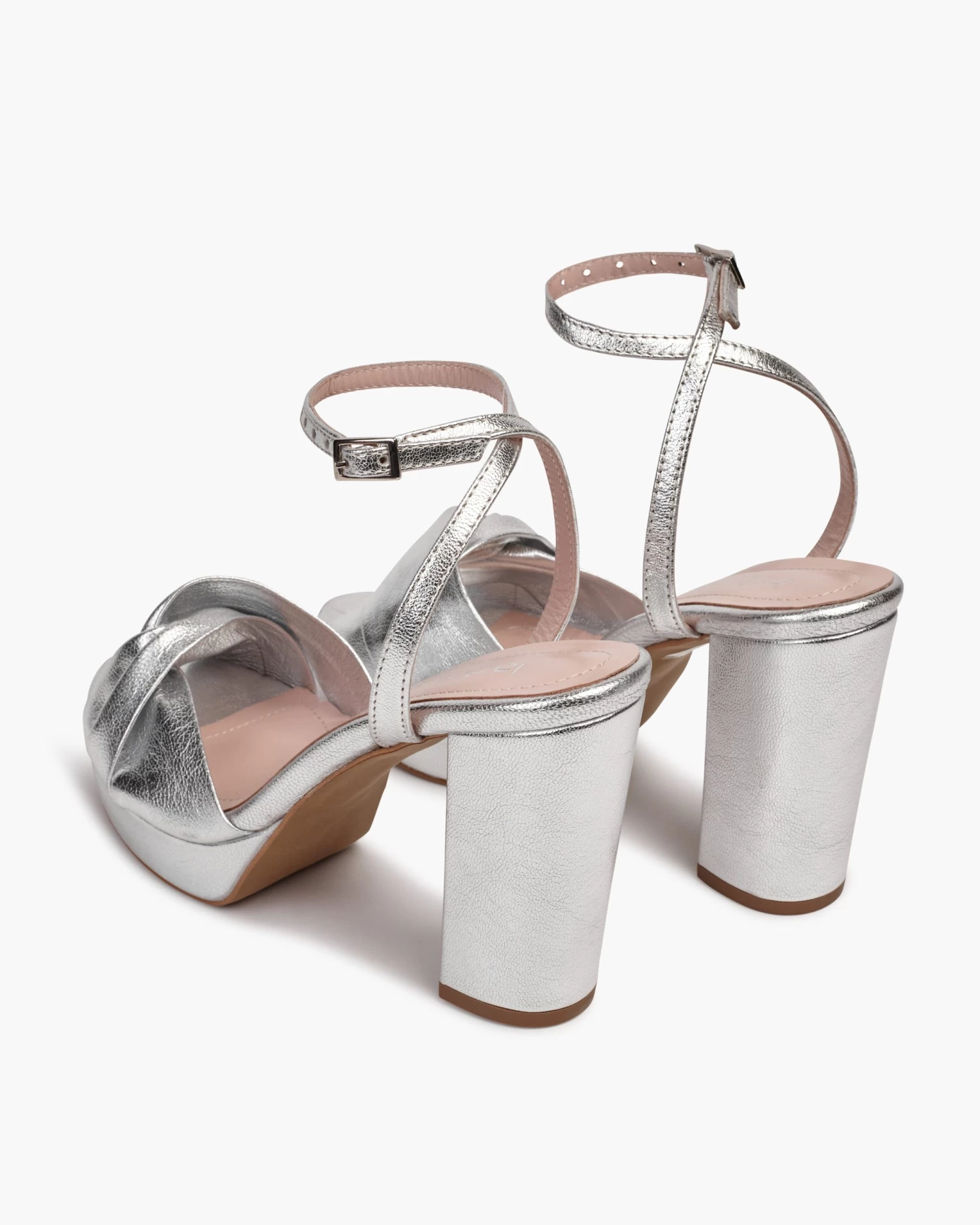 Sandalia de tacón ancho con plataforma y tiras cruzadas en la parte delantera. Cierre de pulsera con hebilla en el tobillo. Tiene la planta muy acolchada para mayor confort.