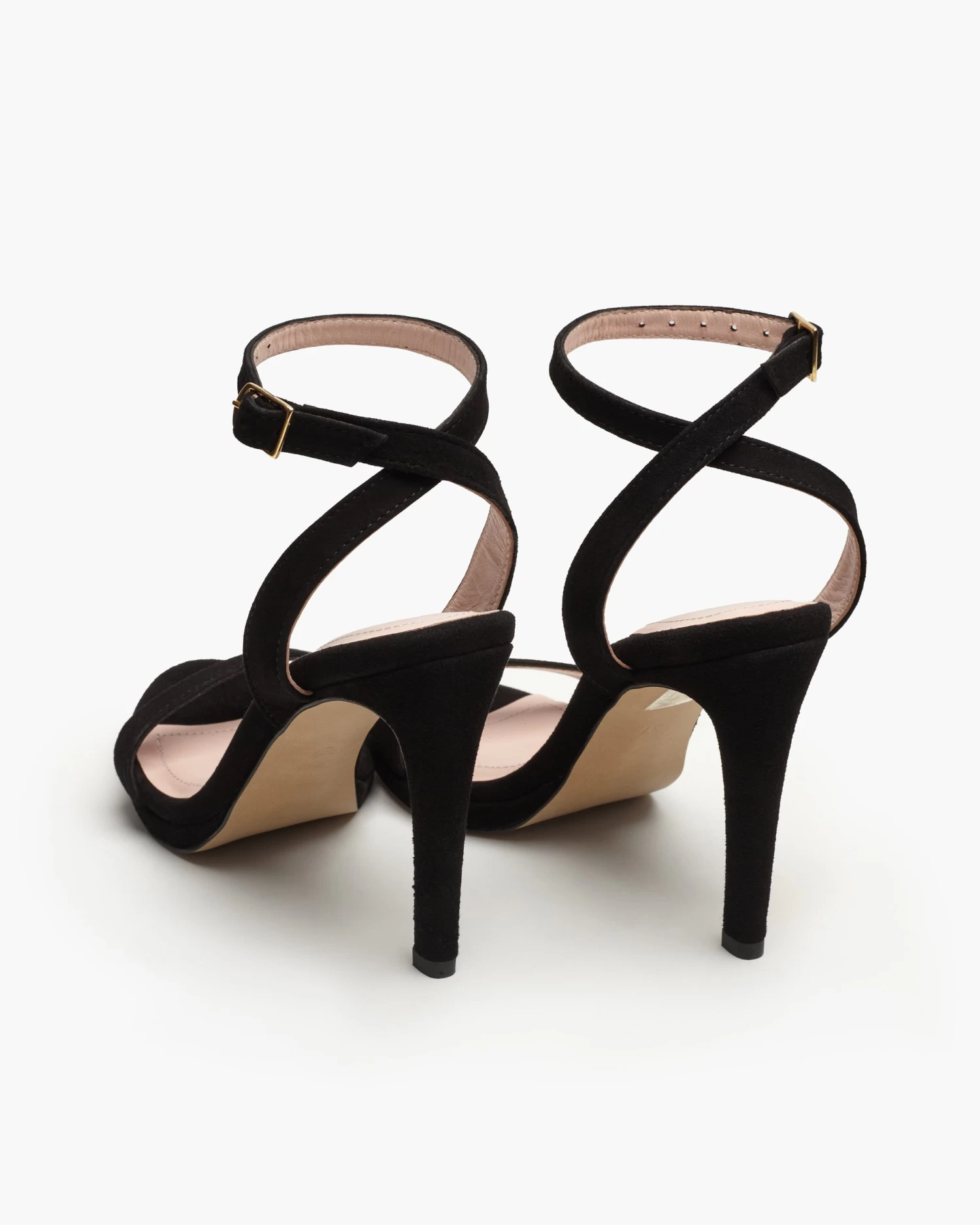 Sandalias de tacón fino de 11cm con plataforma de 2cm y tira fina en la parte delantera. Cierre de pulsera con hebilla en el tobillo. Tienen la planta muy acolchada para mayor confort.