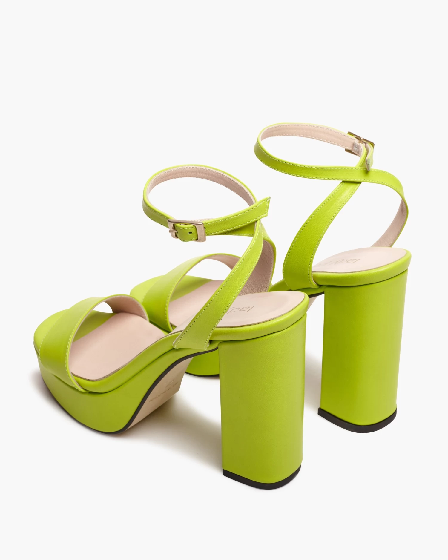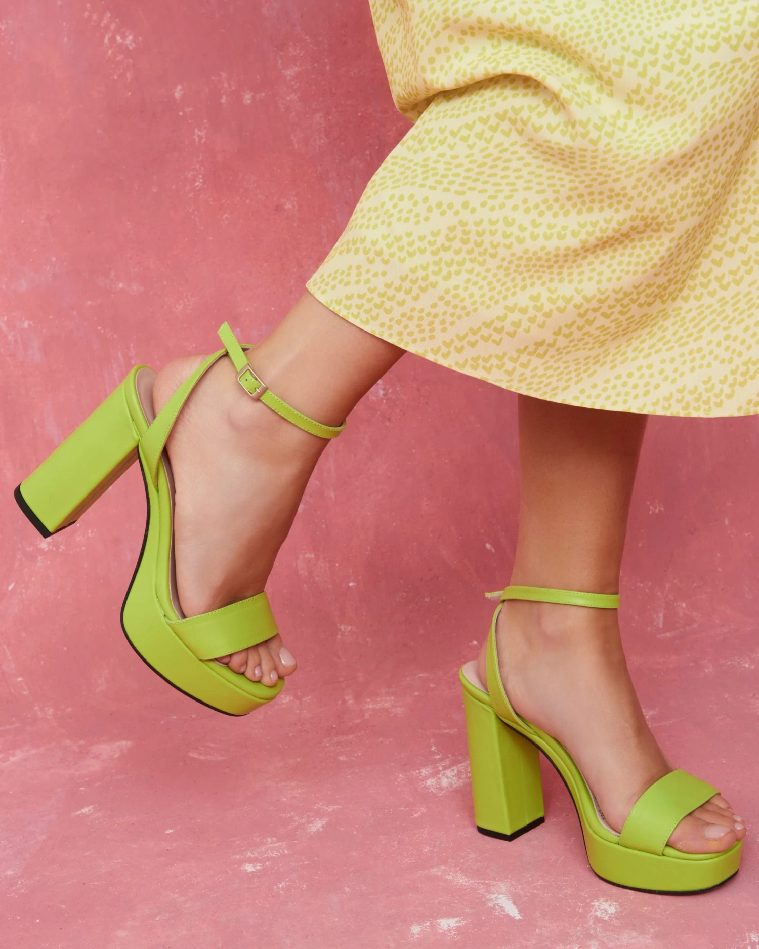 Sandalia de tacón ancho con plataforma. Cierre de pulsera con hebilla en el tobillo. Tiene la planta muy acolchada para mayor confort.