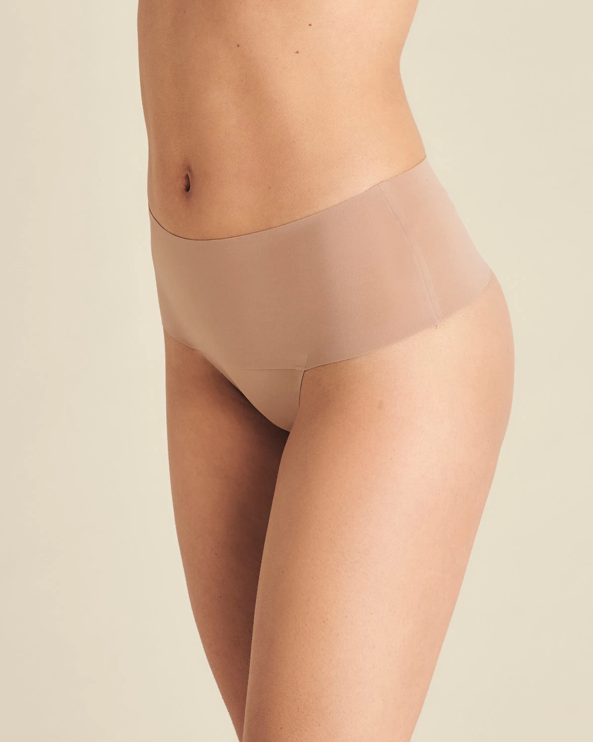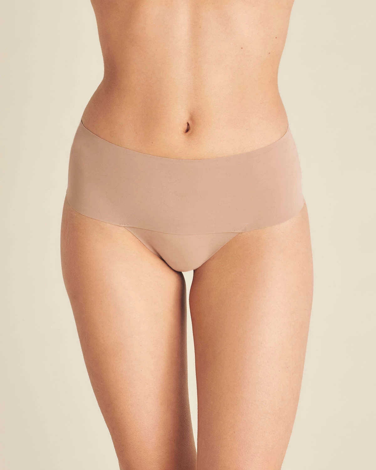 Tanga de talle alto con acabados termosellados (sin elásticos en los bordes) y sin costuras para que no se marque. Tejido de microfibra suave que se adapta a tu cuerpo y forro de algodón.