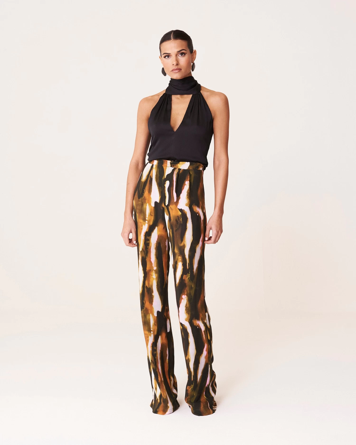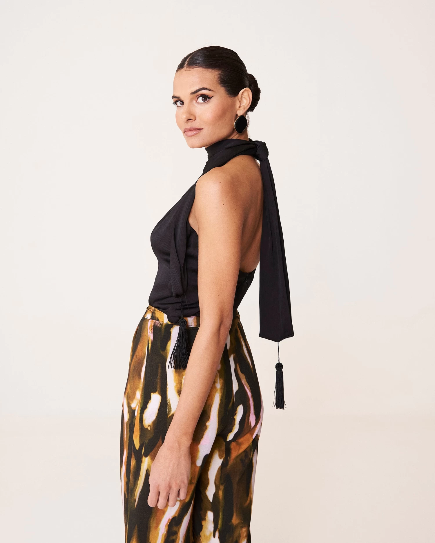 Top de cuello halter con lazada, escote en V y espalda descubierta.