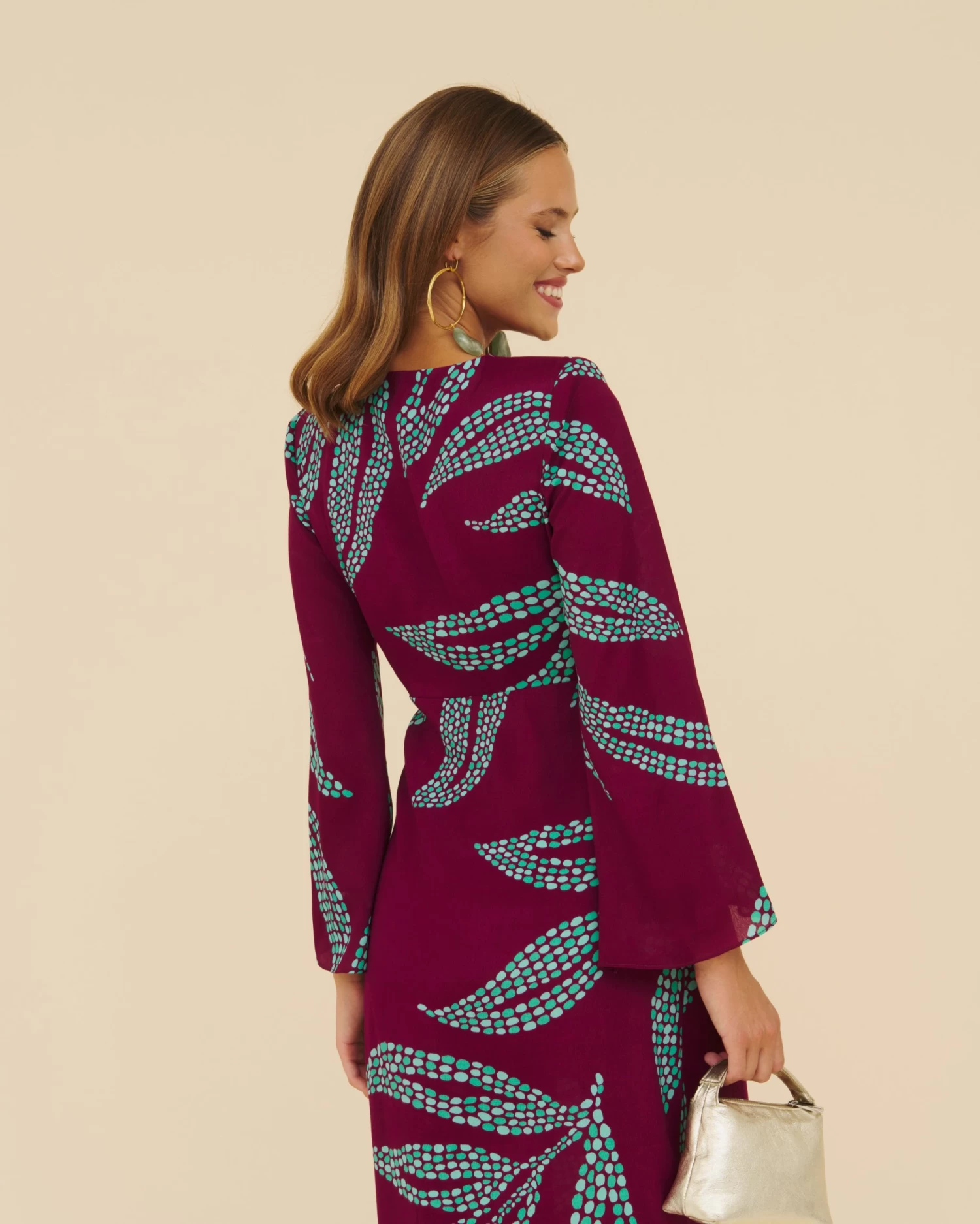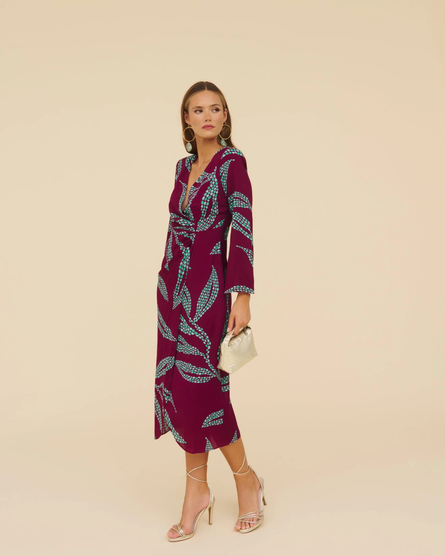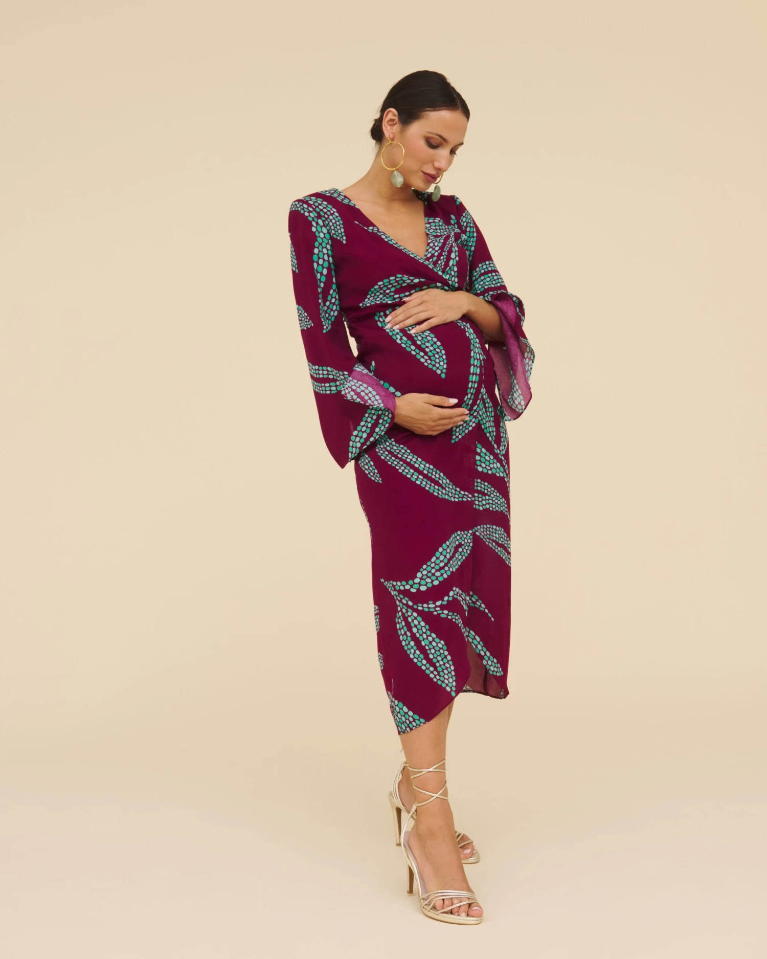 Vestido midi cruzado con escote en pico, manga evasé y abertura delantera.