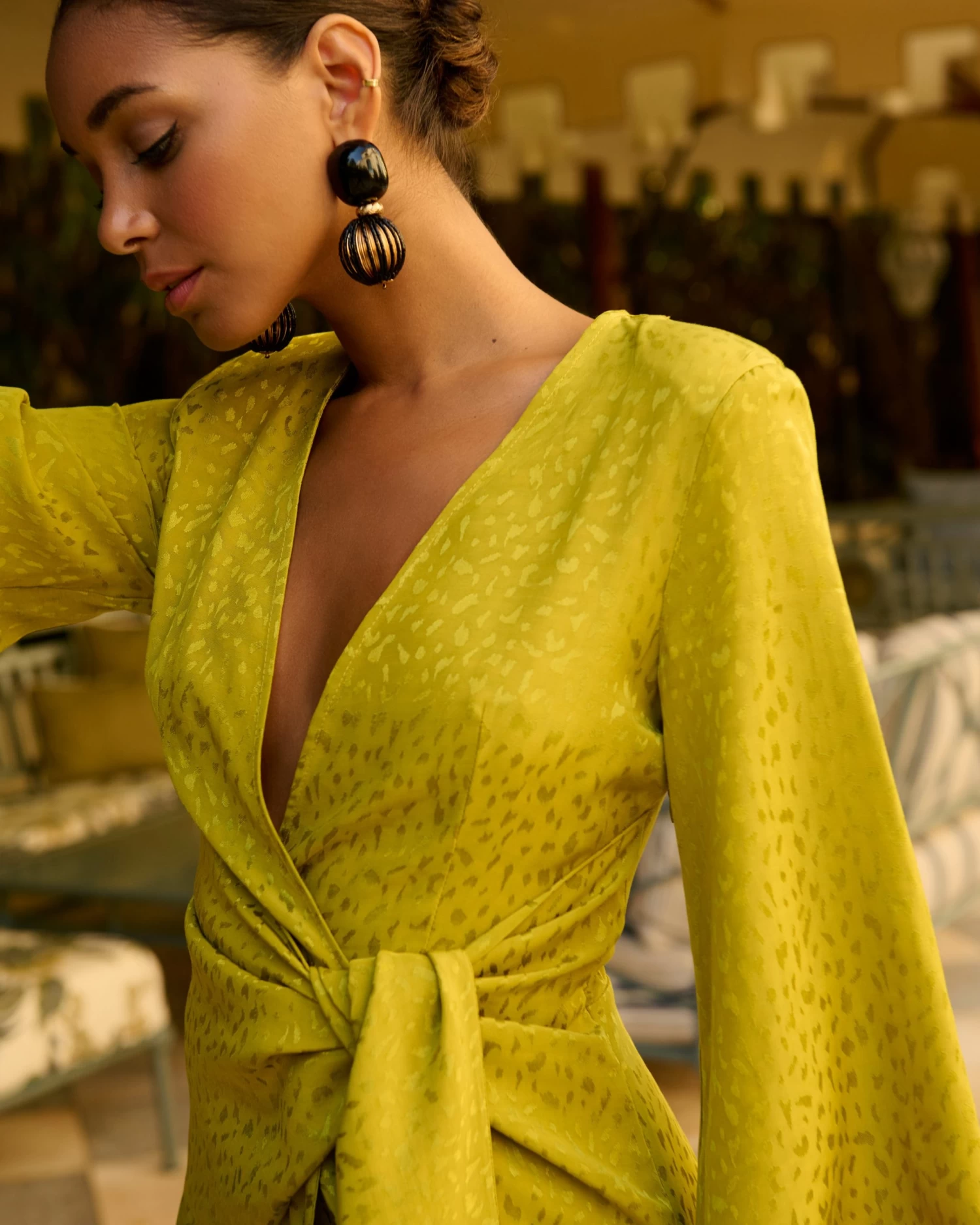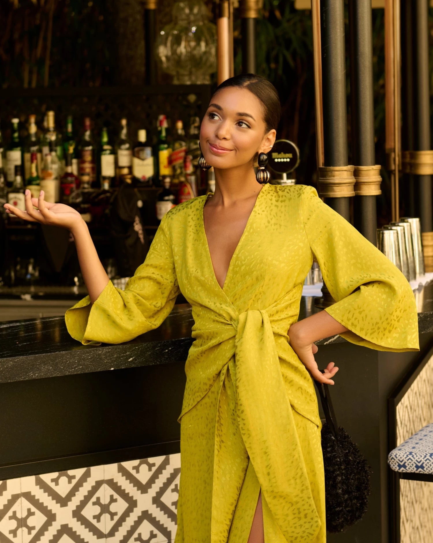 Vestido midi con escote en pico y nudo en la parte delantera.