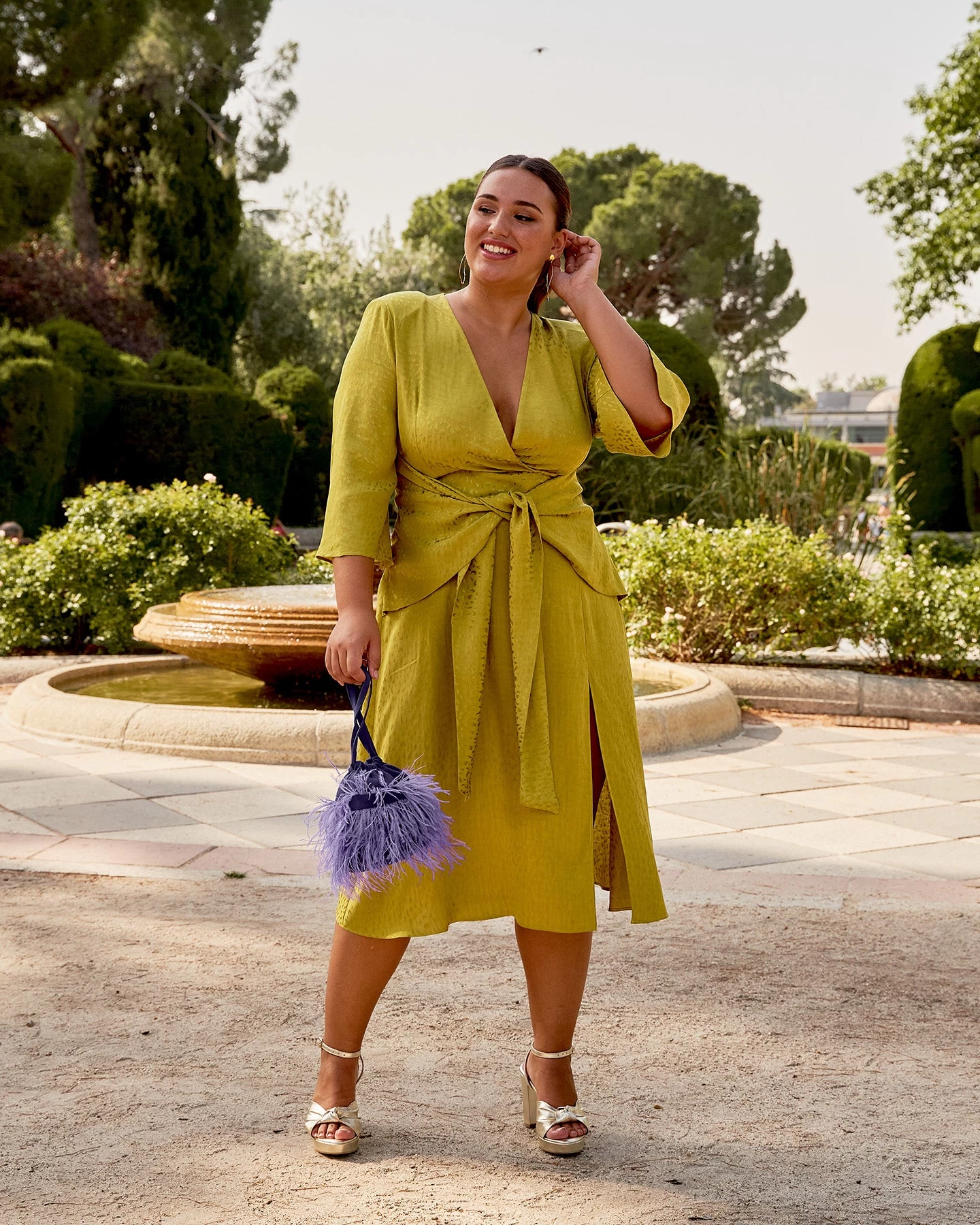 La primera modelo que lleva bolso amarillo mide 170 cm y lleva la talla XS. La segunda modelo mide 173 cm y lleva la talla 4XL.