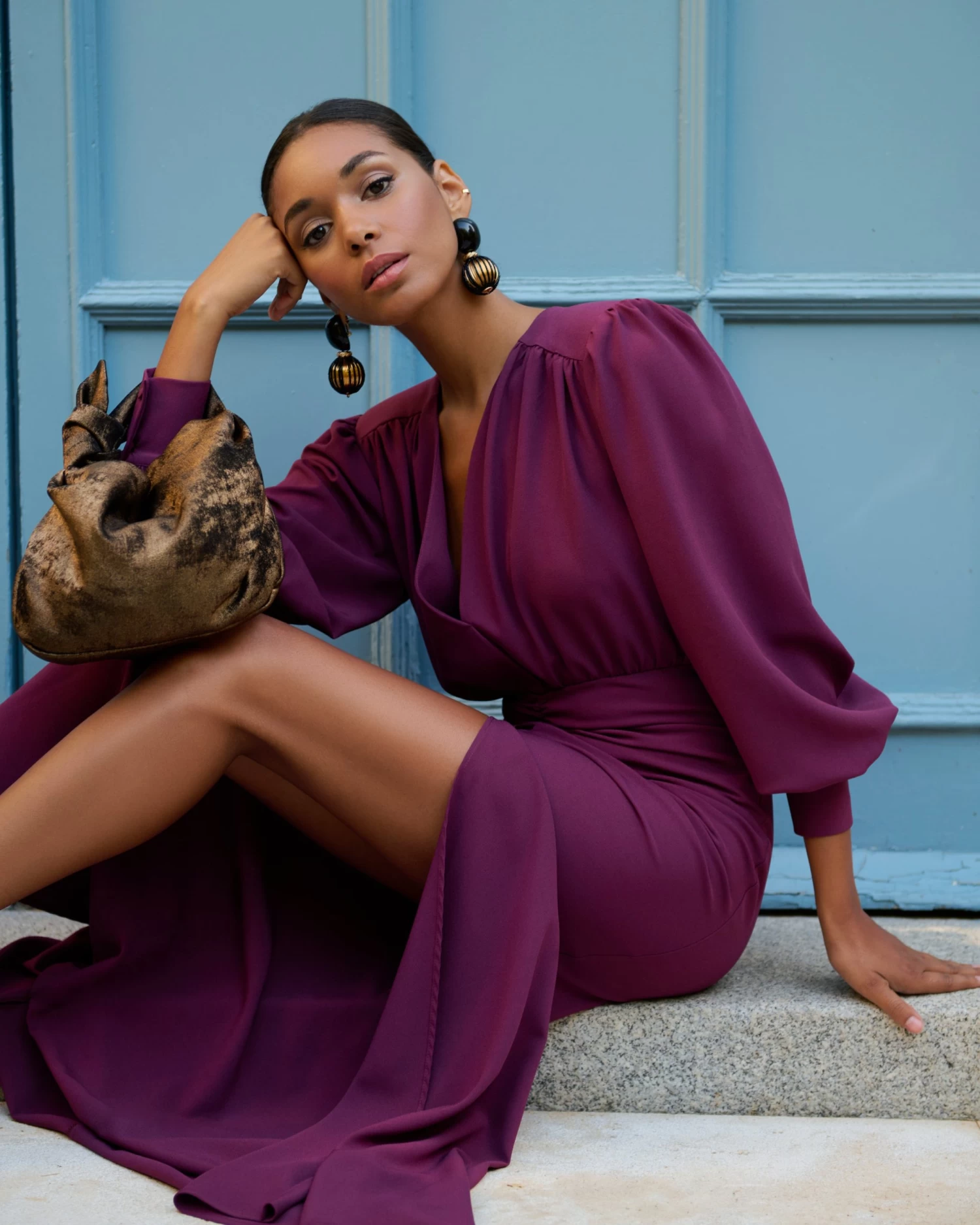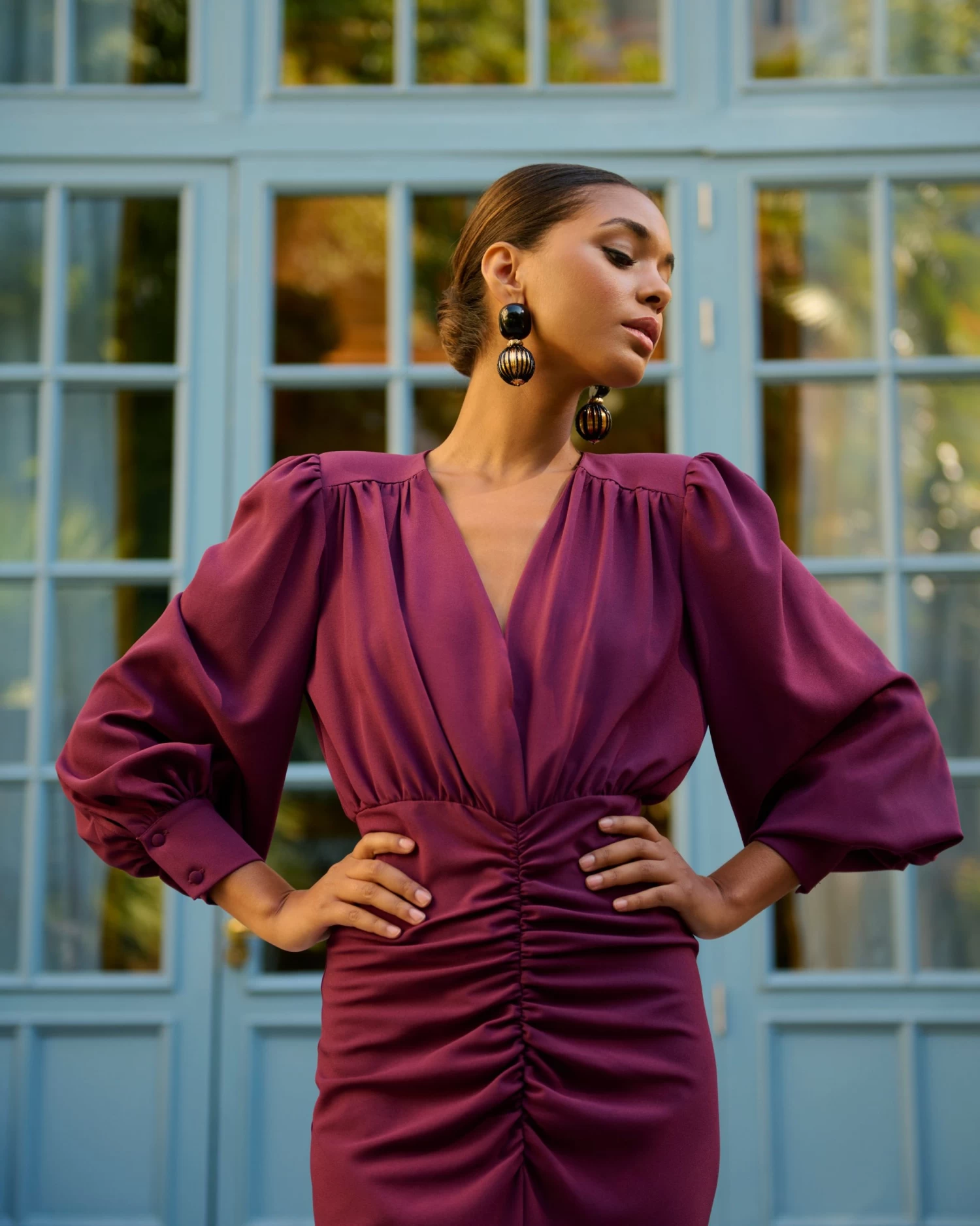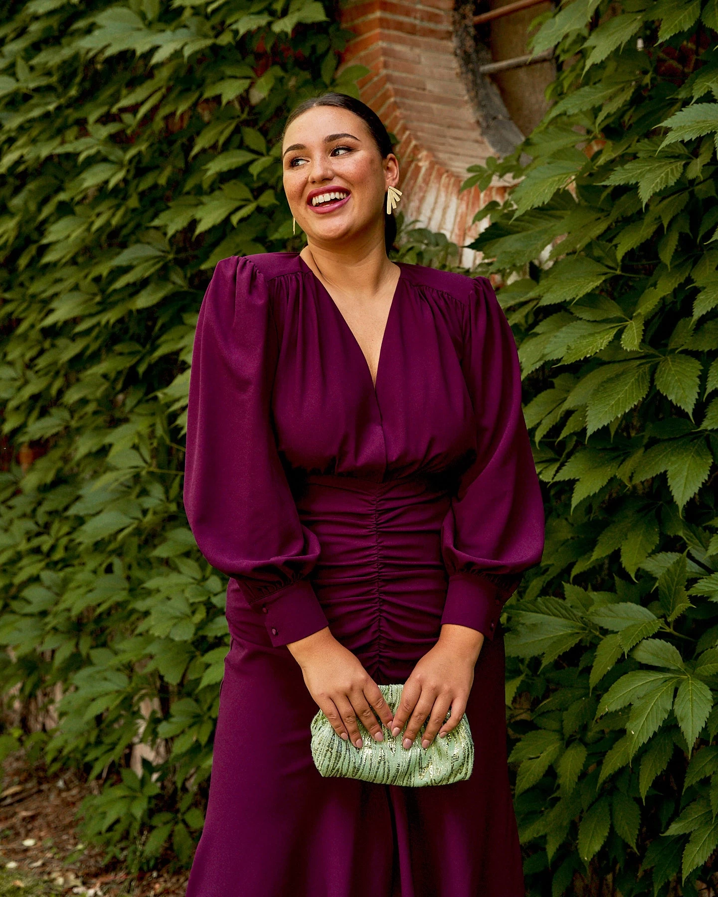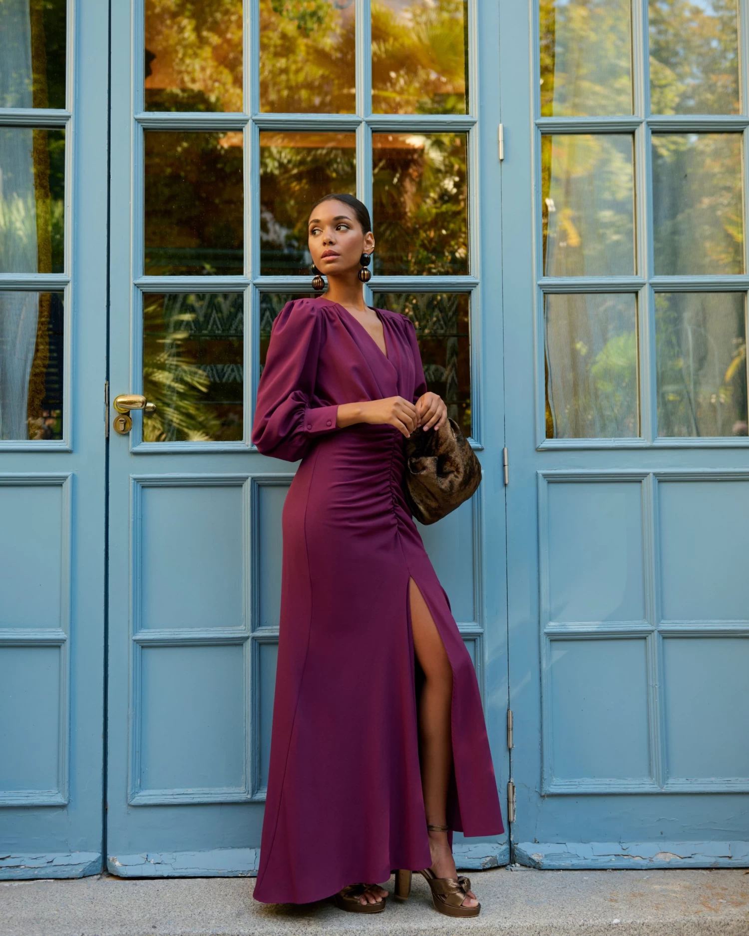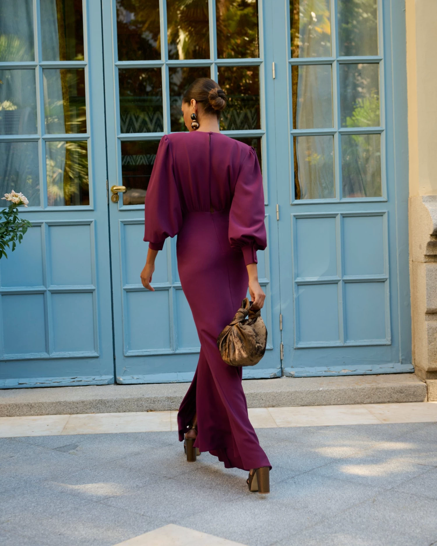 Vestido largo con escote en pico, abertura y frunces en la parte delantera y espalda abierta en forma de lágrima.
