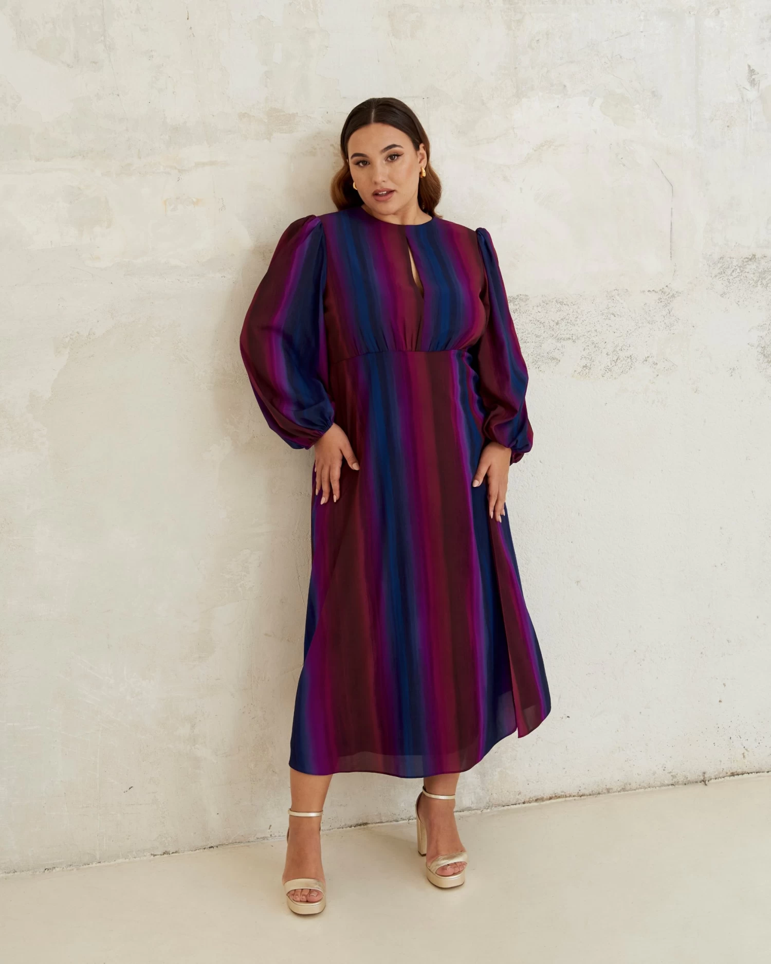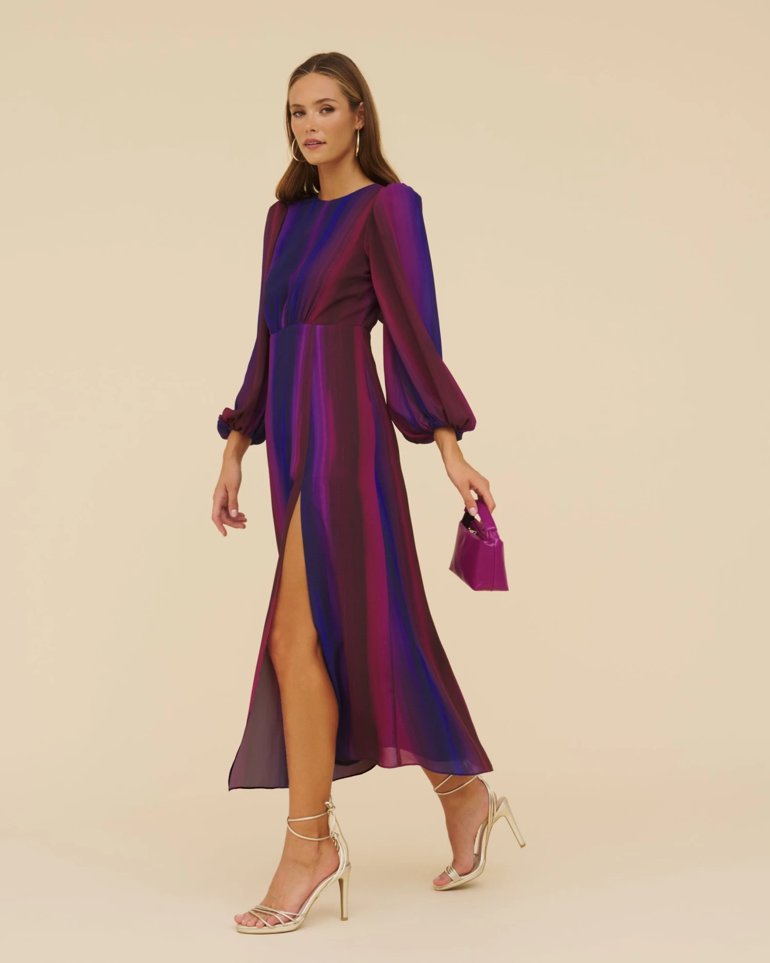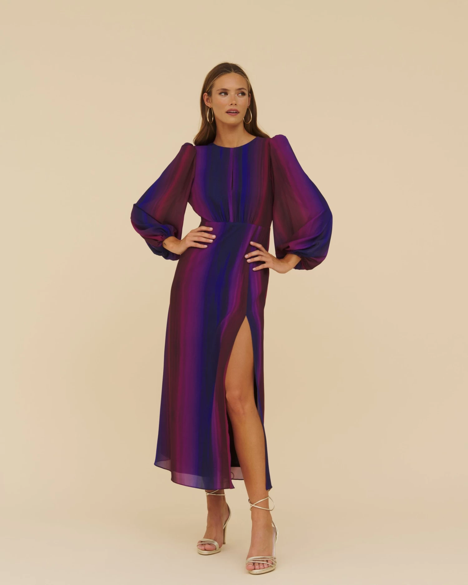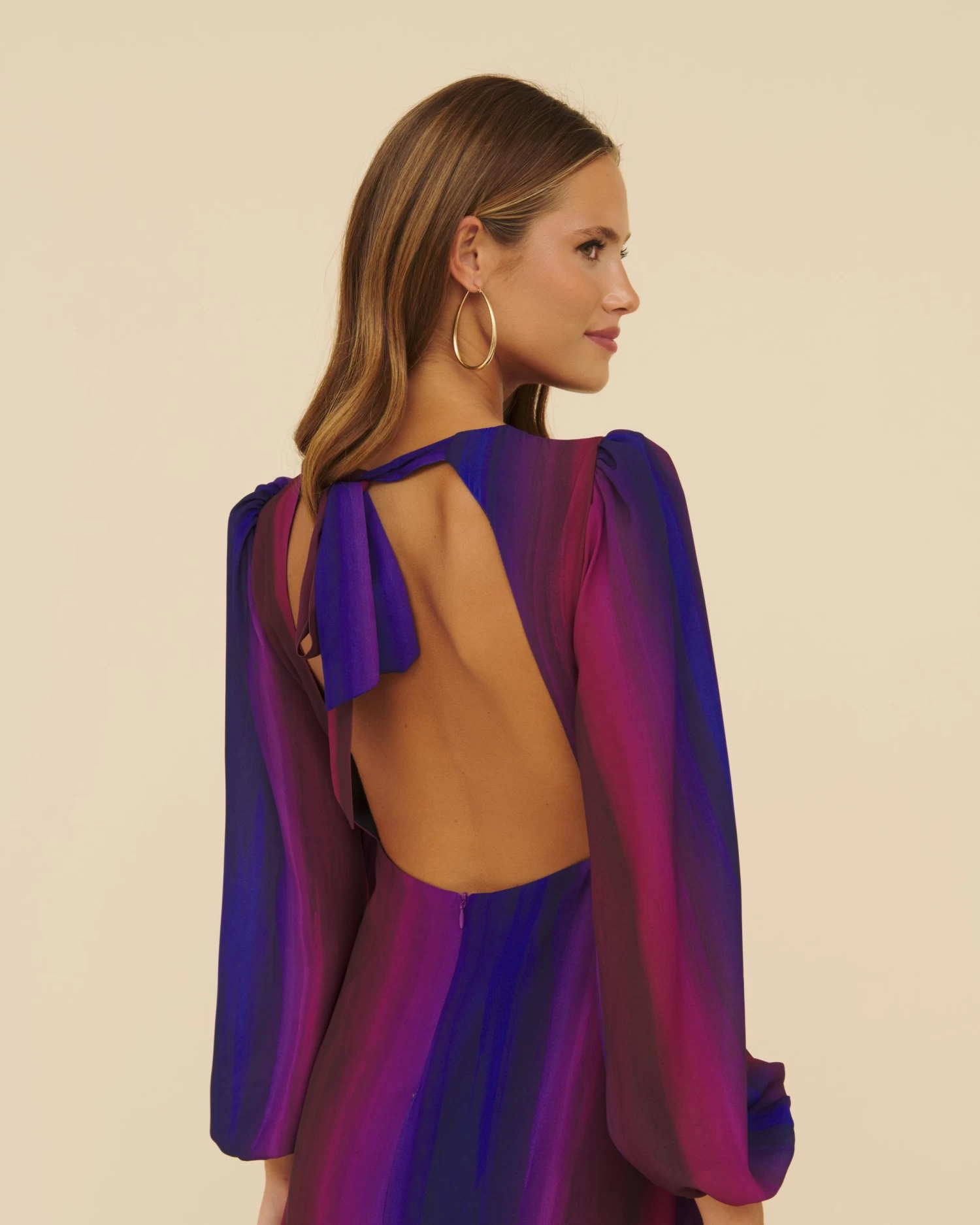 Vestido midi con manga abullonada, detalle de lágrima en el pecho, espalda descubierta con lazada y abertura delantera.