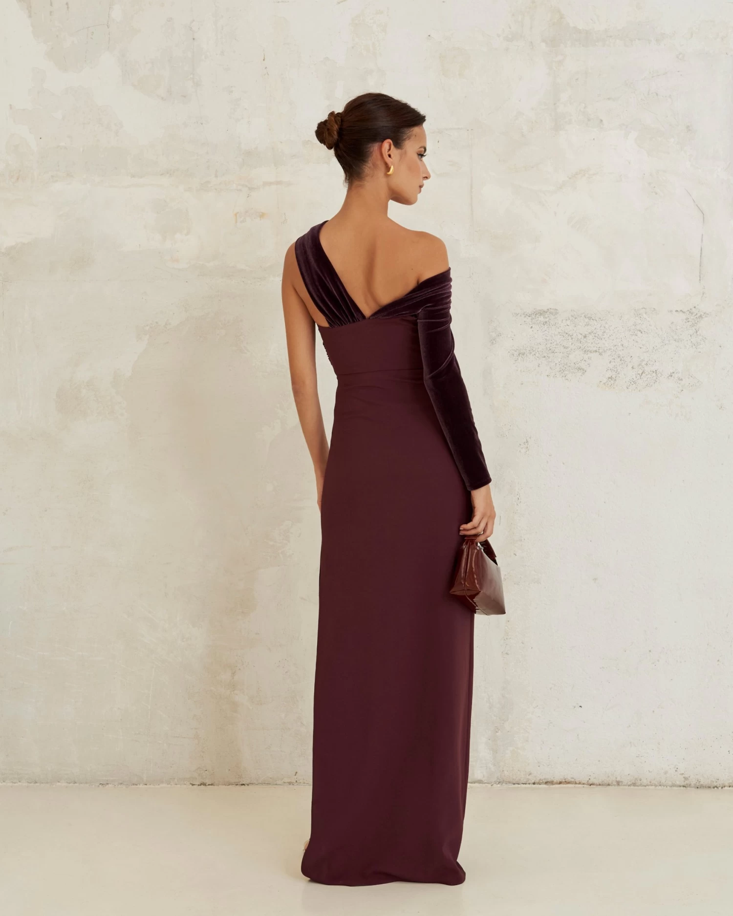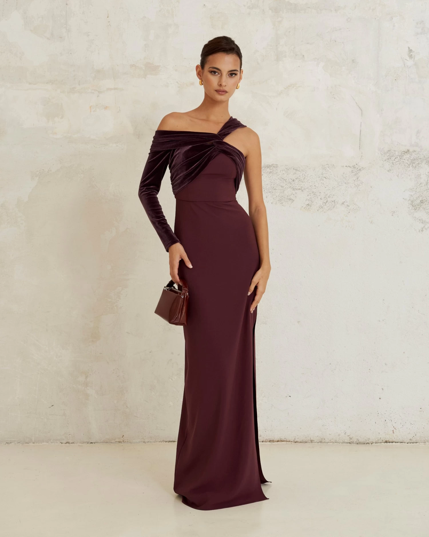 Vestido largo asimétrico con detalle de nudo en la parte delantera, escote bardot y abertura lateral.
