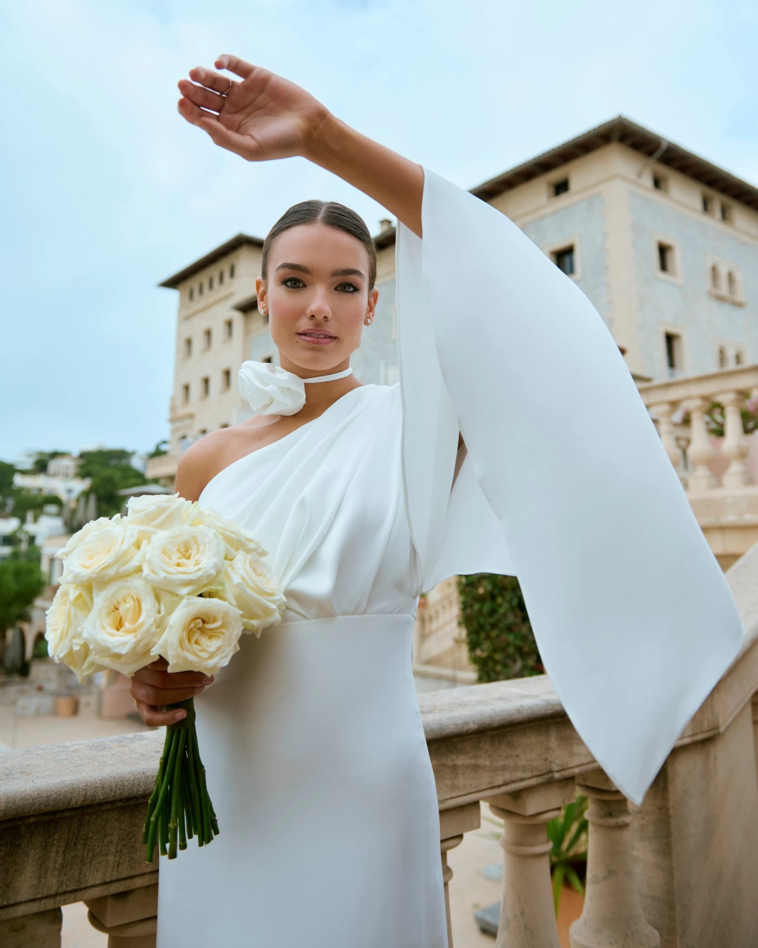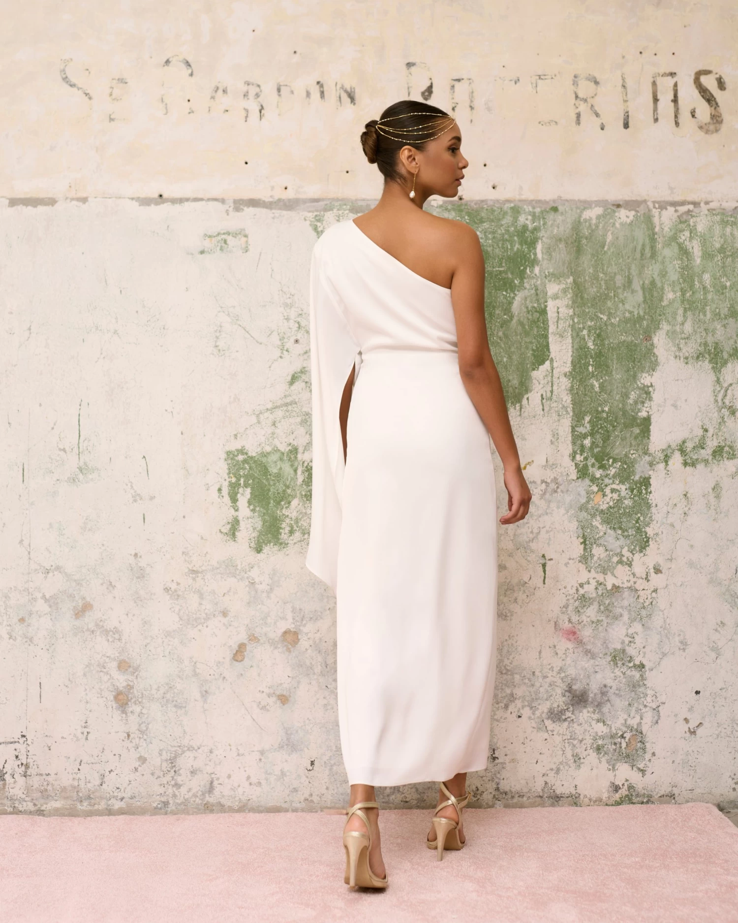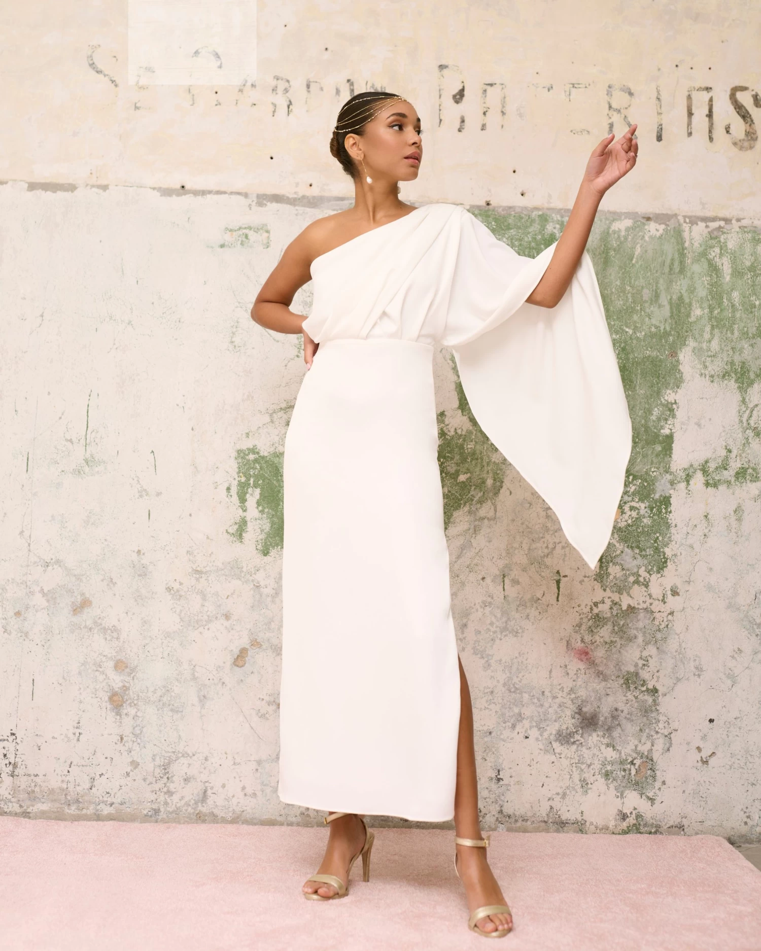 Vestido midi asimétrico con abertura lateral, drapeado en la parte delantera y manga estilo capa.