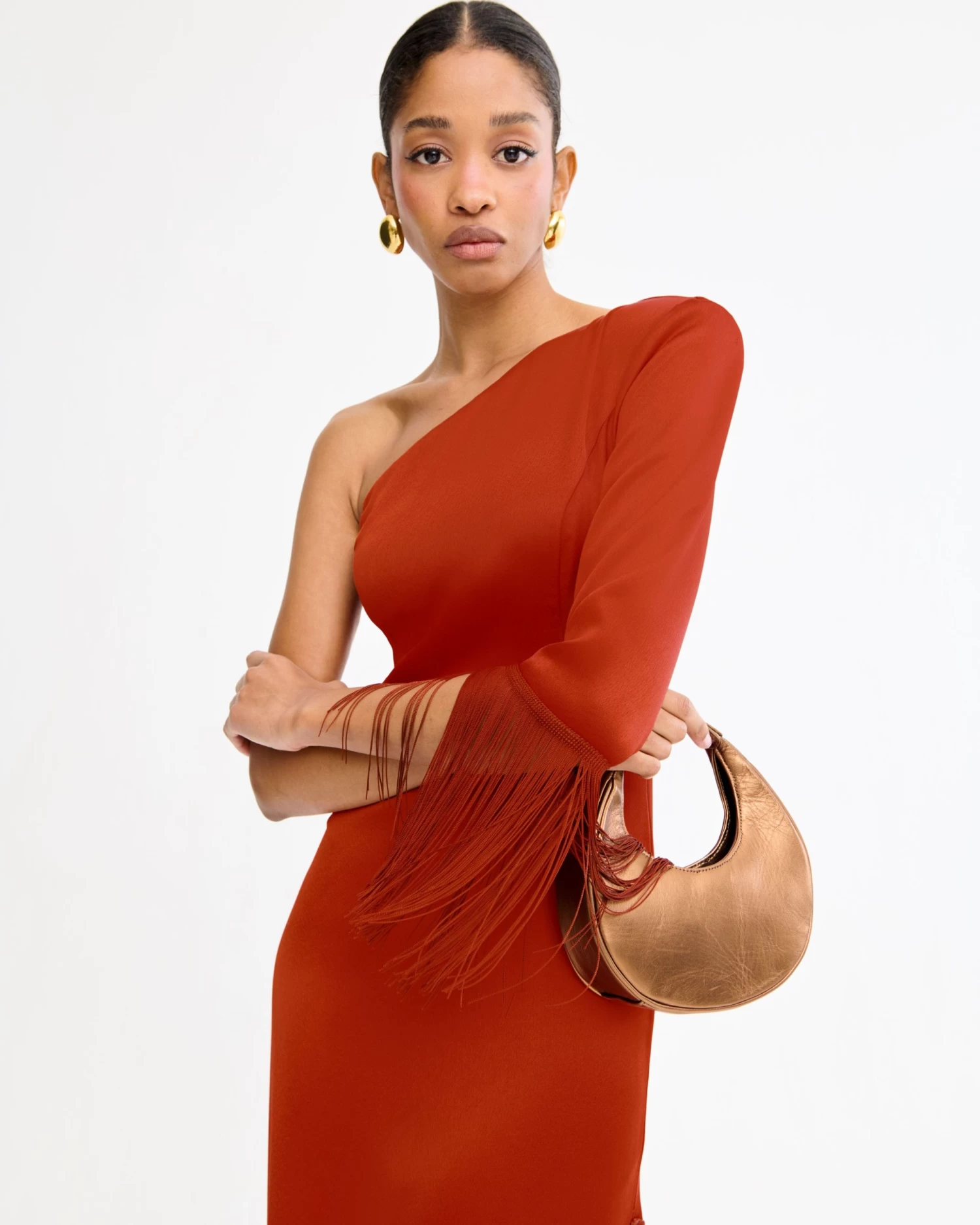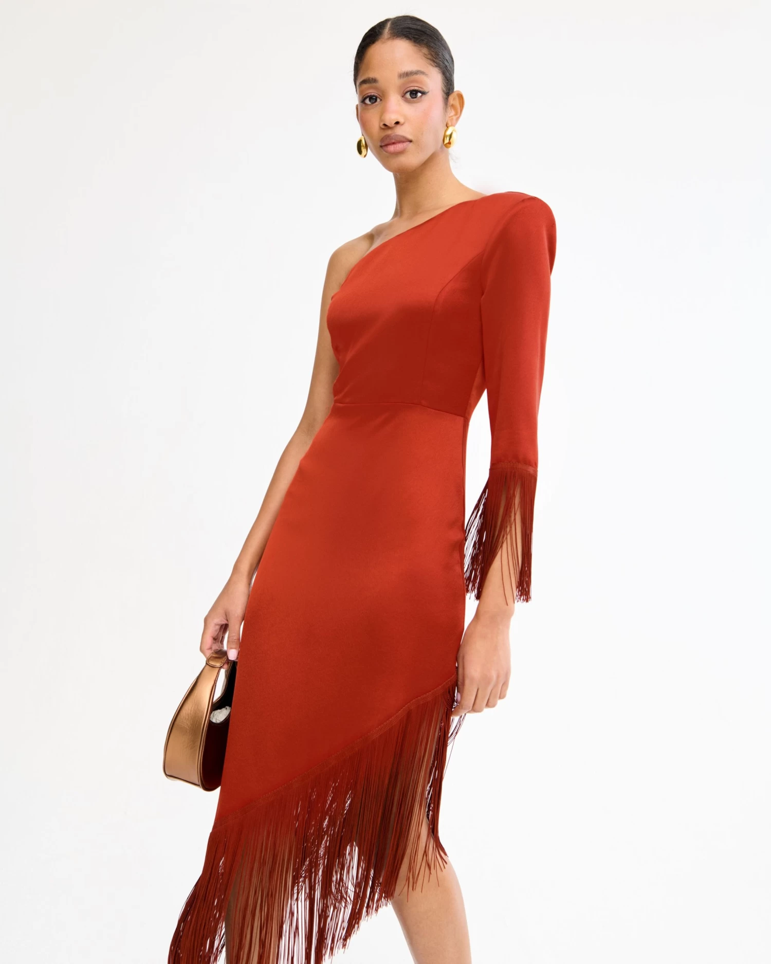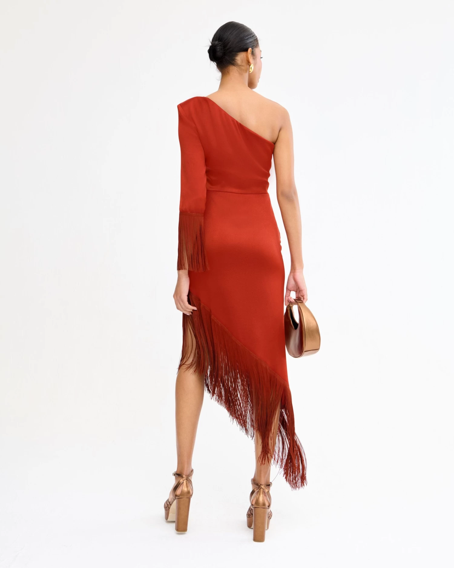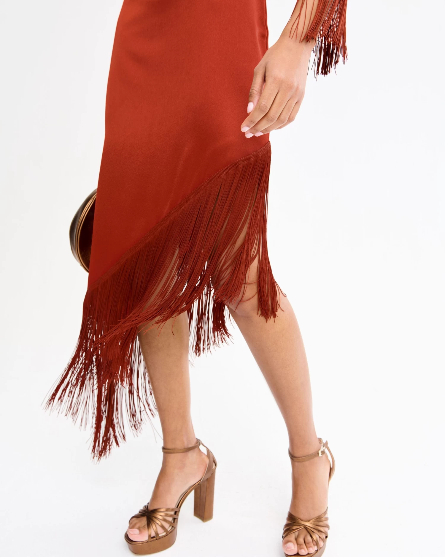 Vestido midi asimétrico con flecos en la manga y en el bajo a tono con el vestido.