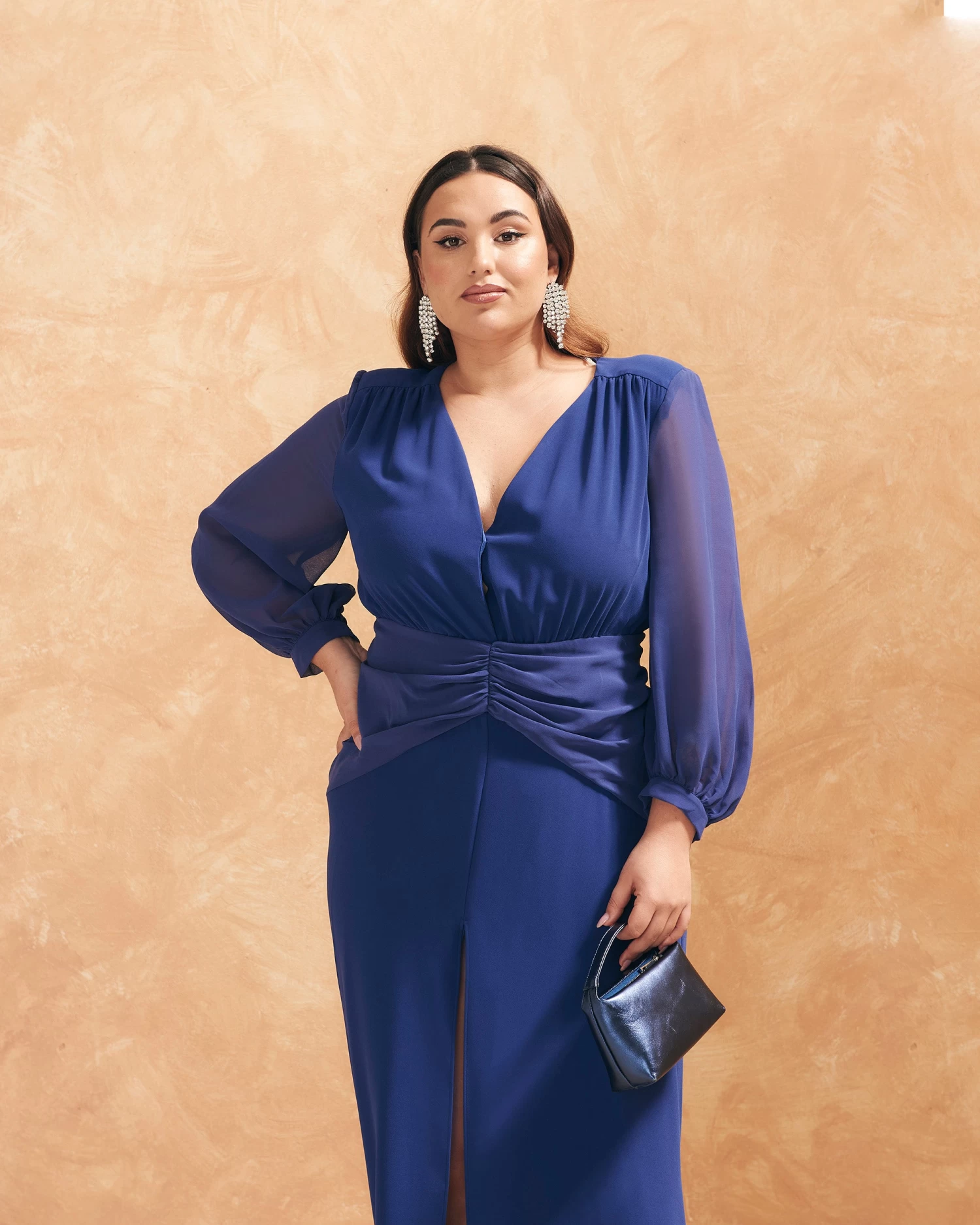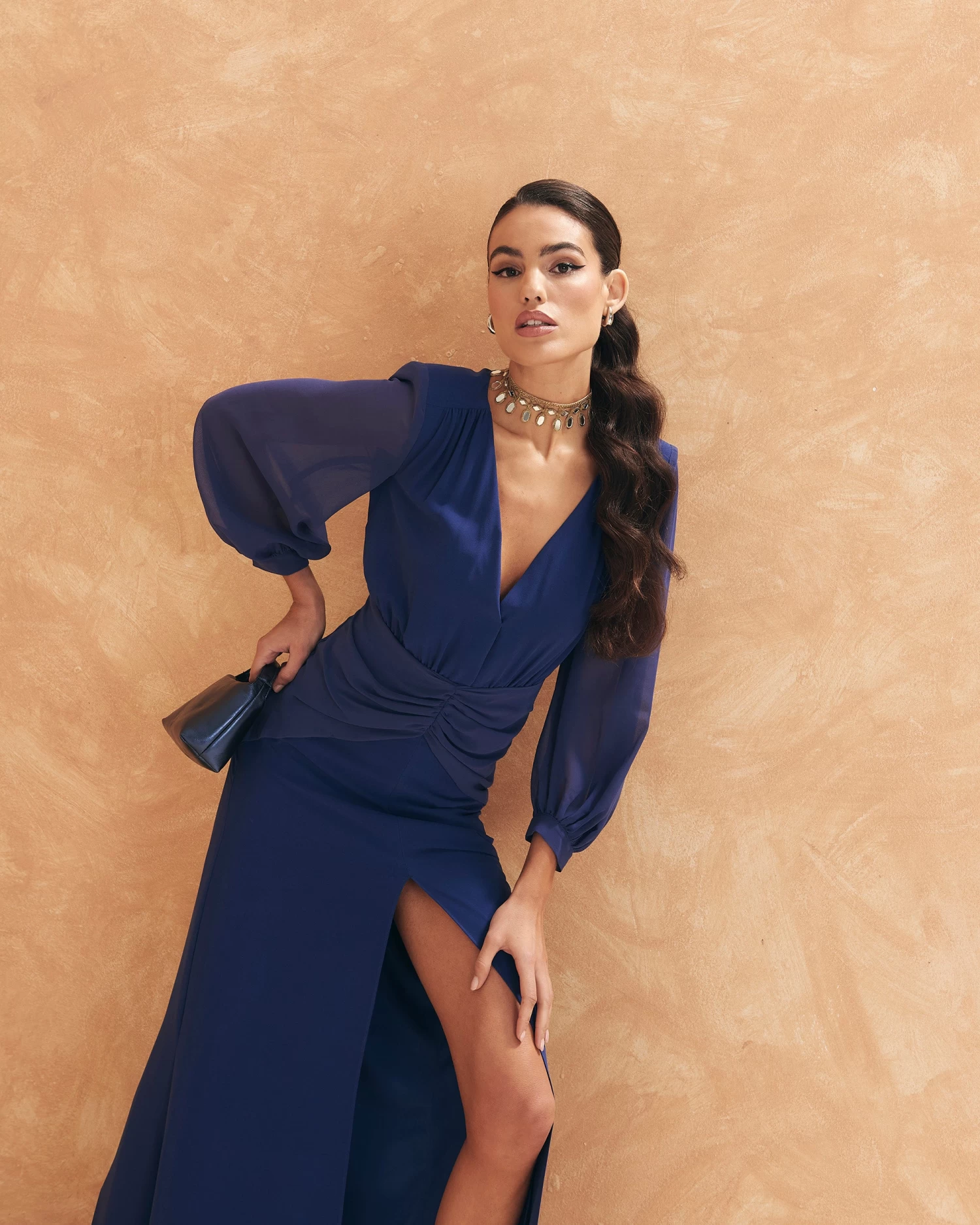 Vestido largo con escote en pico, mangas abullonadas semitransparentes, abertura y frunces en la parte delantera y detalle de lágrima en la espalda.