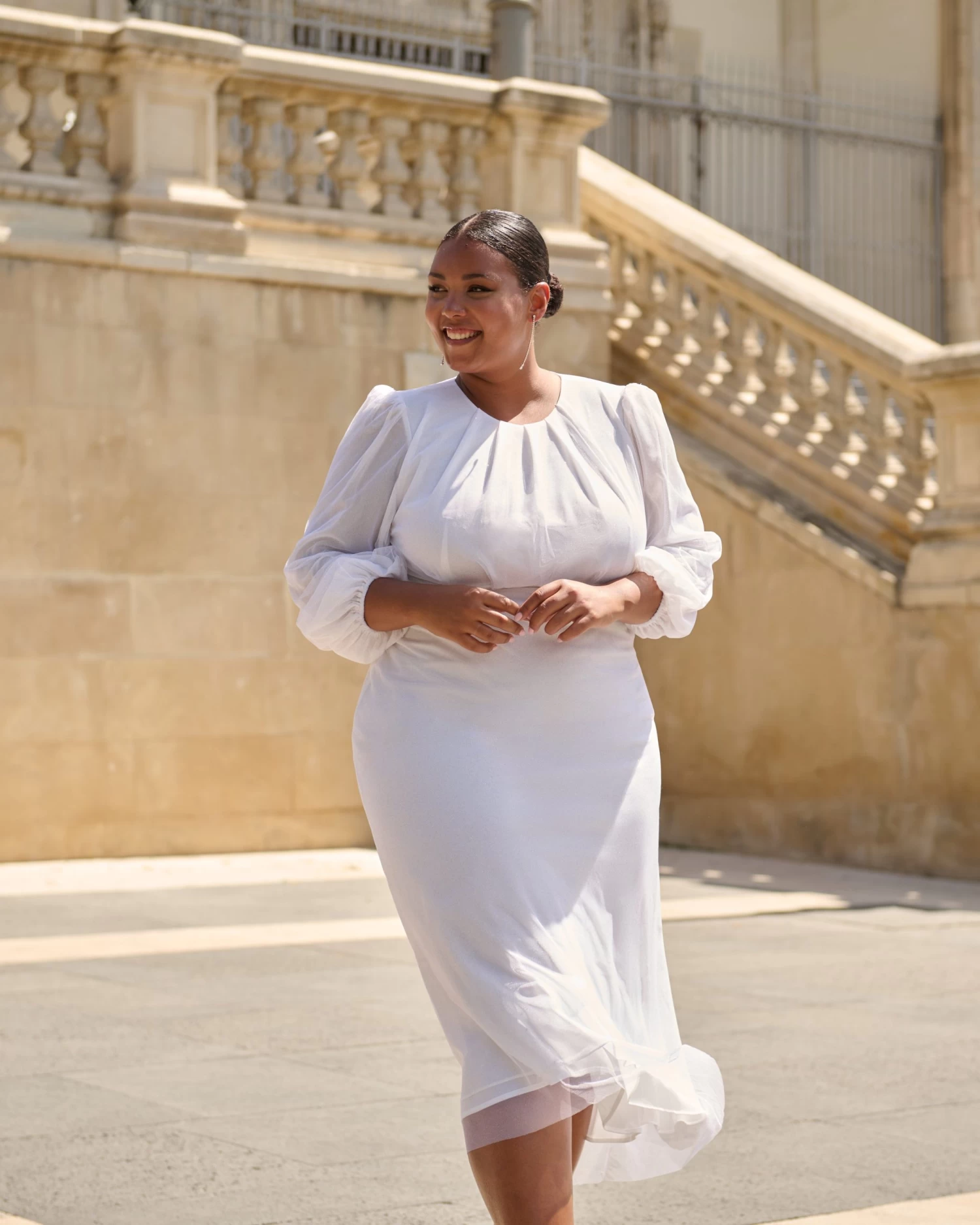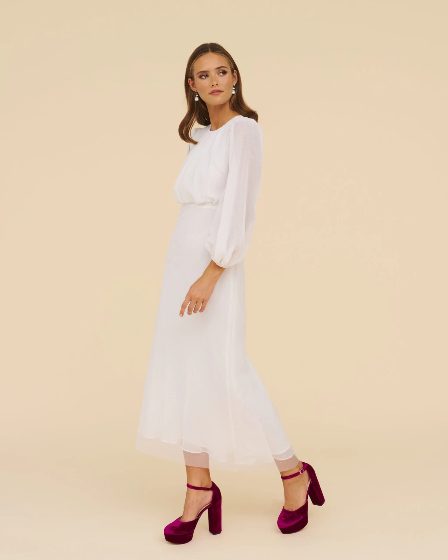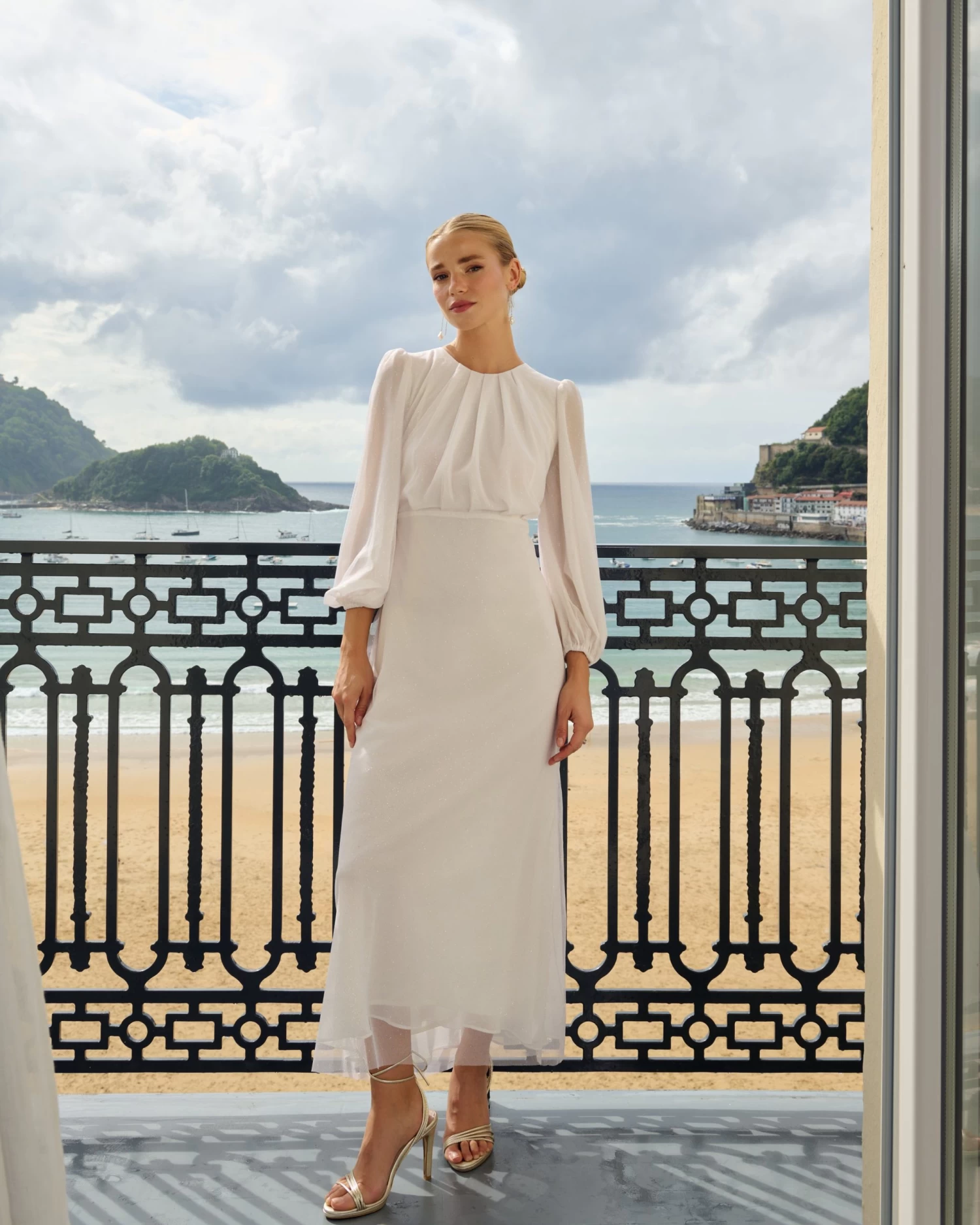 Vestido midi con falda de corte evasé, mangas abullonadas semitransparentes y detalle de lágrima en la espalda.