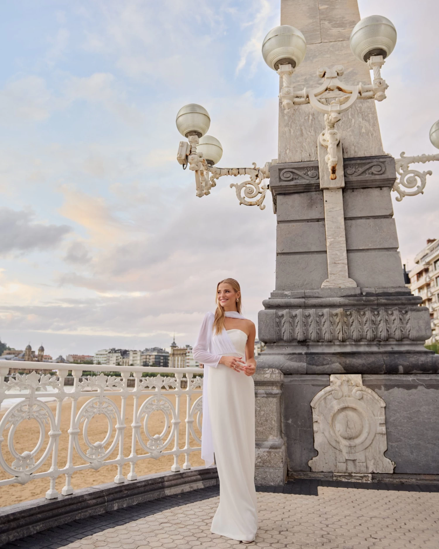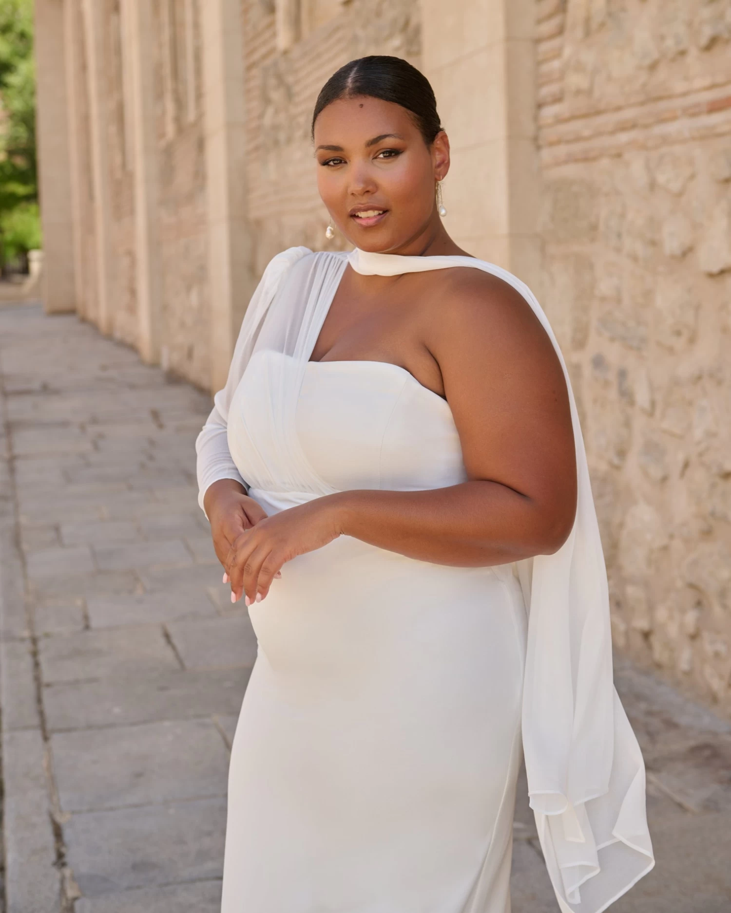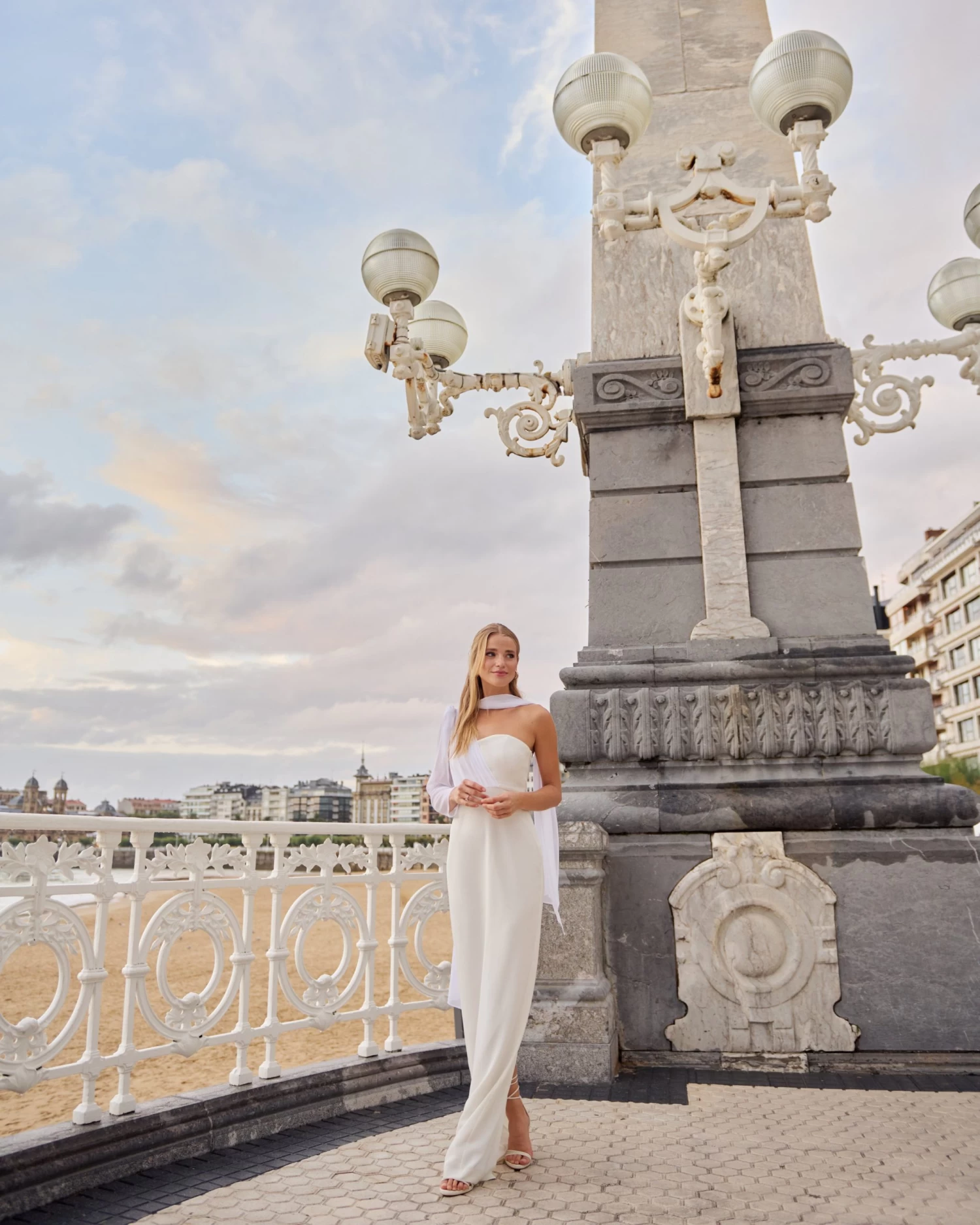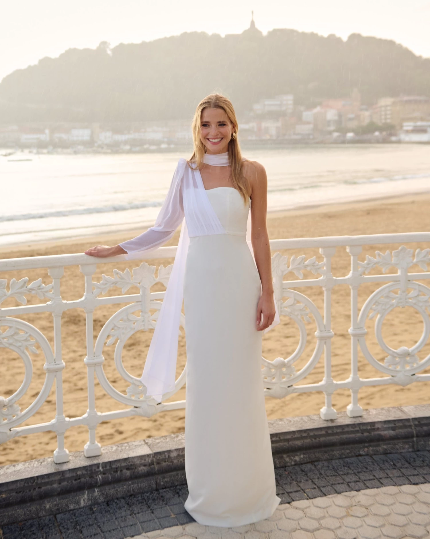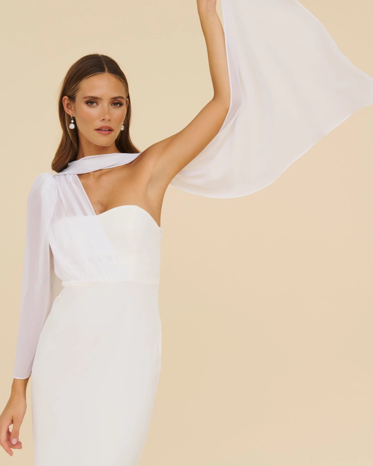 Vestido largo asimétrico con lazada en el cuello, manga abullonada de gasa y abertura trasera.
