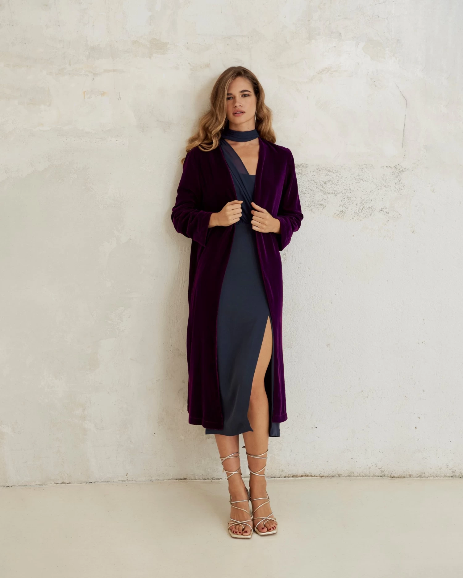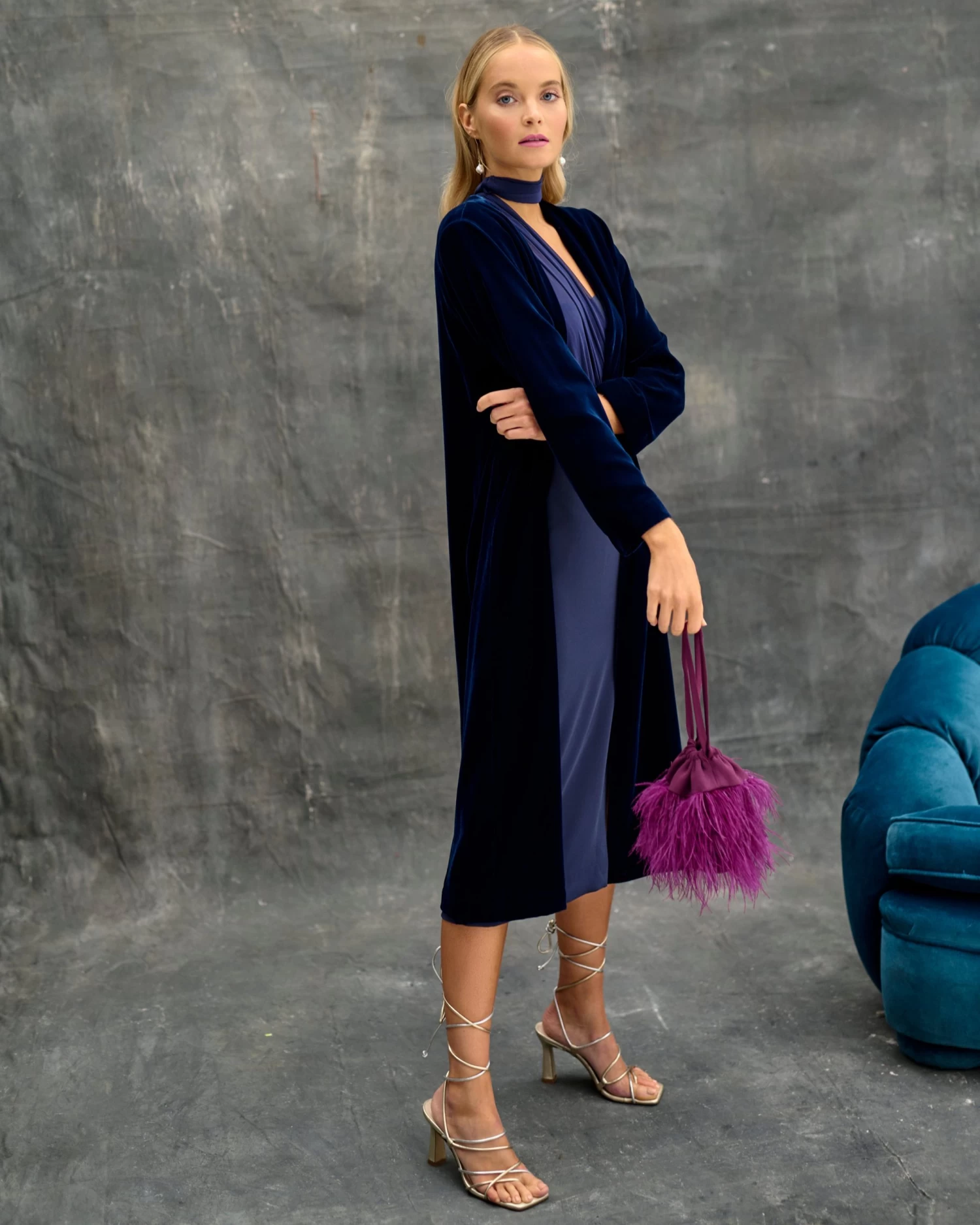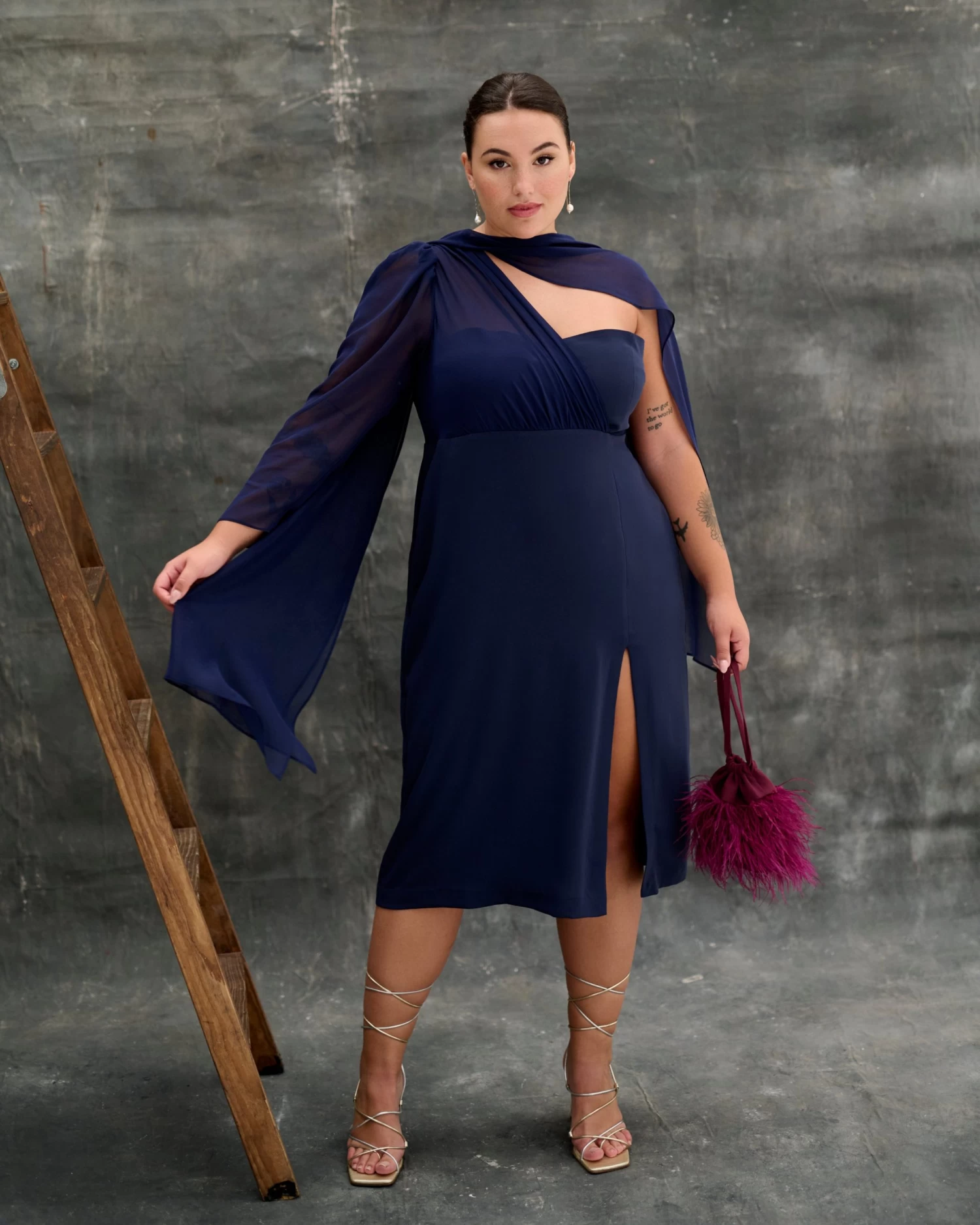 Vestido midi asimétrico con lazada en el cuello y manga abullonada de gasa y abertura delantera.
