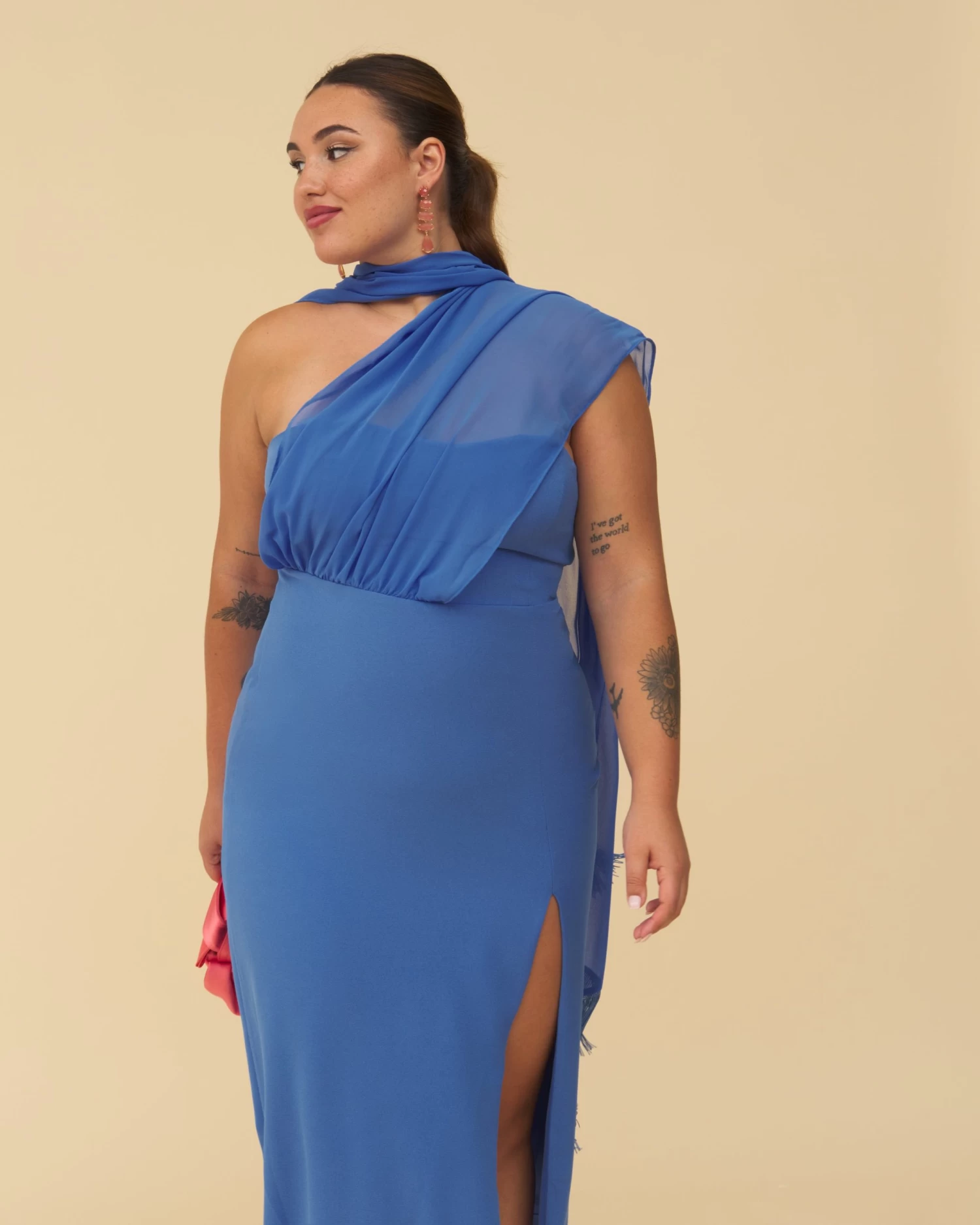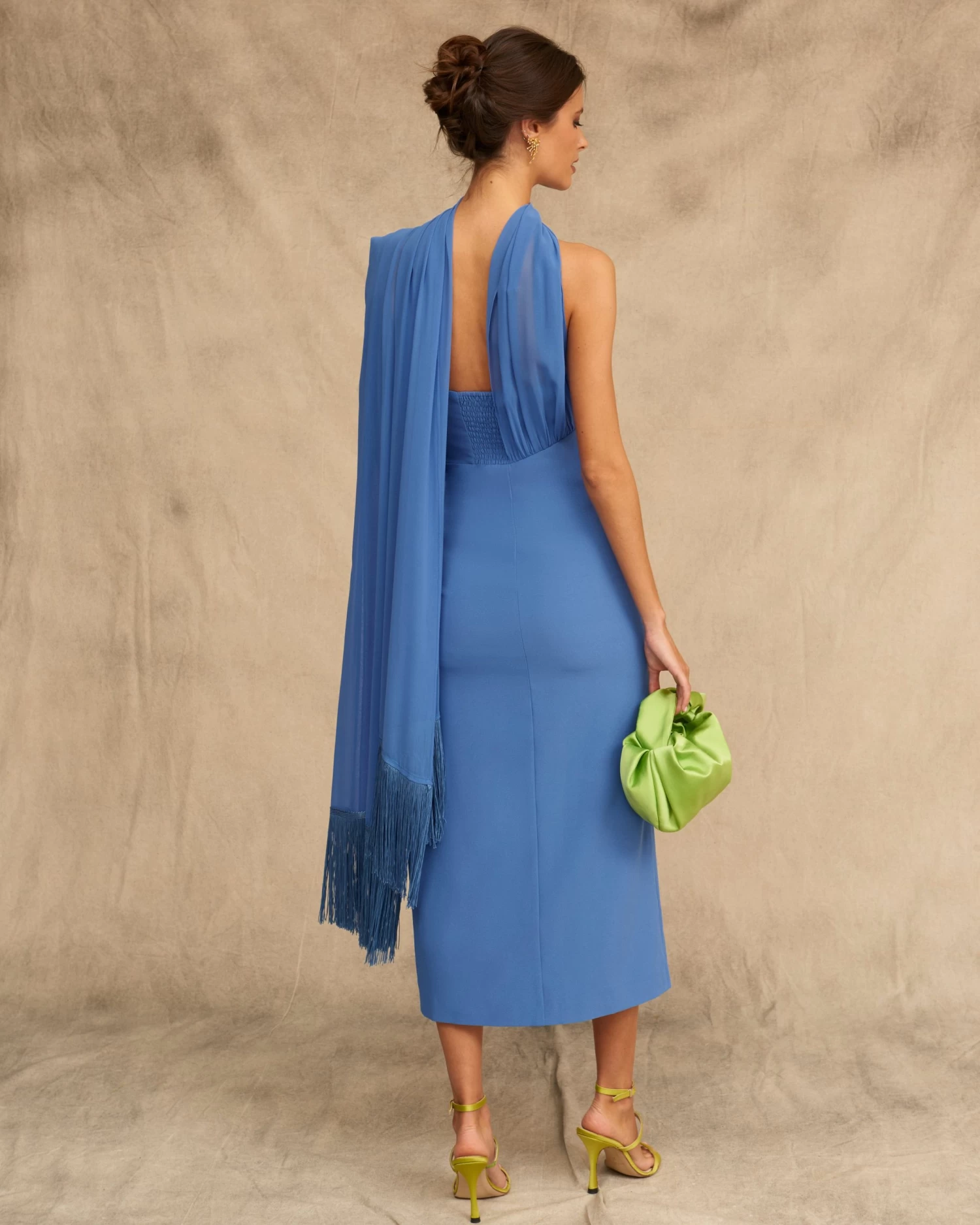 Vestido midi con chal al cuello con detalle de flecos al tono, abertura delantera y espalda elástica.