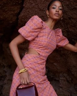 Vestido midi con chal al cuello con detalle de flecos al tono, abertura delantera y espalda elástica.